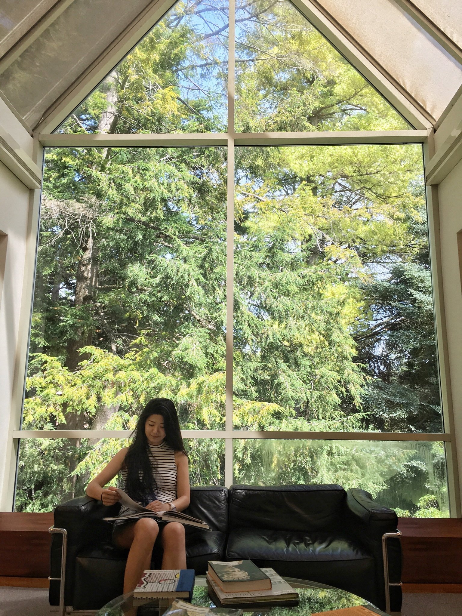 博物馆顶层有个比较偏僻的角落,有巨大的落地窗、沙发和杂志,如果不赶时间,在这里静静地看书,很美好。