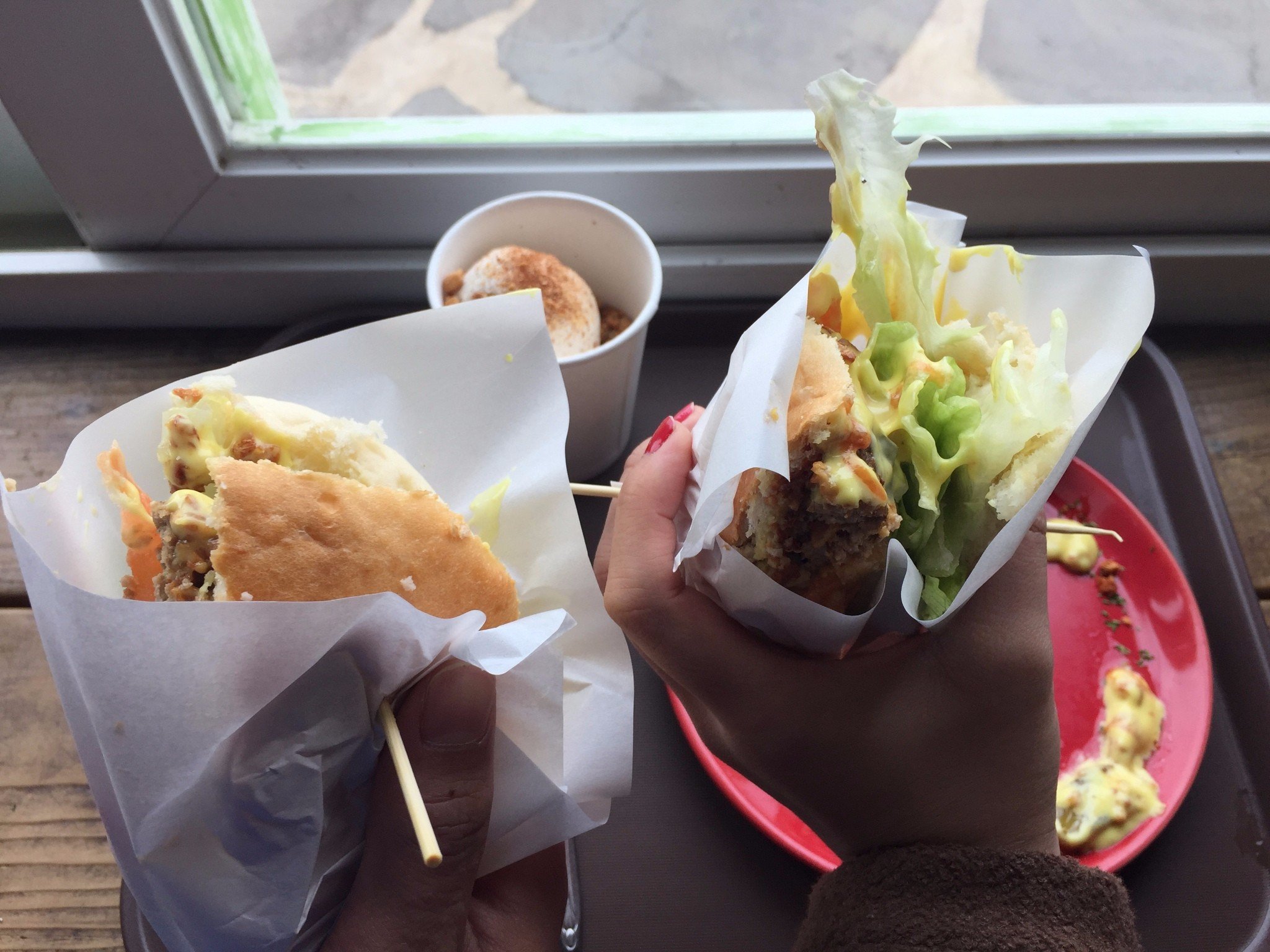 骑了一会儿,到了这家很有名的大汉堡店~正值中午十二点那会儿,人超多。附近还有生鲍鱼和海螺可以尝尝~