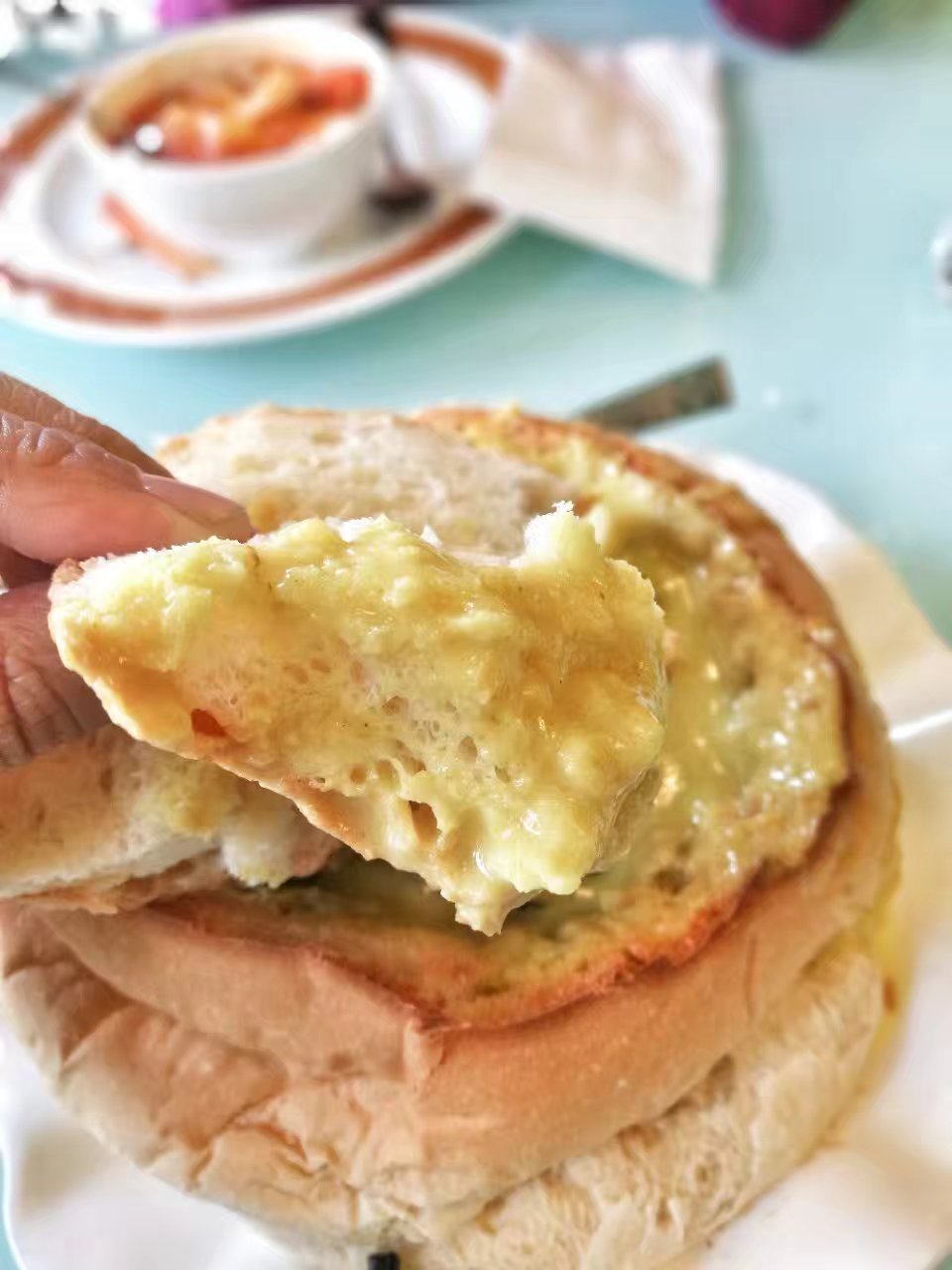 青咖喱牛肉面包(78葡币)~咖喱有黄咖喱红咖喱和青咖喱可以选择,也可以选择不要面包,然……面包和咖喱可是绝配!青咖喱微辣,不会太稀,味浓,里面的茄子和一种我不认识的青豆,我特别喜欢。而咖喱汁浸透在了面包里,特别美味!牛肉也不会老,反而是嫩嫩的口感,又被咖喱所融合!至于那个面包则外面烤得焦焦的,里面却很松软,一吃就知道是自己家做的,不是外面买回来的那种~另外,上菜时还会配上剪刀,一个细节足见其贴心!