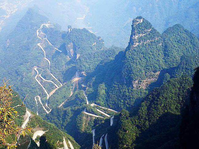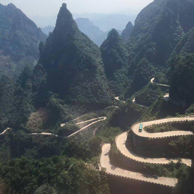 索道长度就跟金鞭溪的长度一样,大约乘坐了35分钟吧,上去看到这条99道弯的盘山公路,真是感叹修路人的艰辛!!!