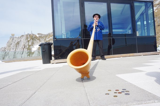 缆车一共分为三段,前两段乘坐小缆车,最后一段是观景的吊舱缆车。一到山顶,迎接我们便是阿尔卑斯山的灵魂之音,这个独特乐器发出的美妙音乐在山顶回荡,那种空灵但却有力的声音,真的让人眼圈一湿。终于明白了,为什么称之为“阿尔卑斯山的灵魂”,大家一定记得去听听这个与众不同的声音。