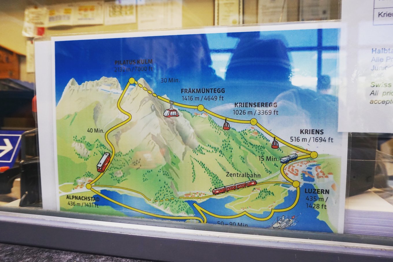 tips:这里需要注意的是,皮拉图斯山有两个上去/下来的点,所以大家根据自己的旅行计划可以选择缆车上山,齿轨火车下山,或者反之。因为我们皮拉斯图山之后的计划是去因特拉肯,所以我们选择缆车上山齿轨火车下山,因为齿轨火车下山后的alpnachstad站距离因特拉肯更近,节约了我们缆车回去琉森再去火车站坐火车到因特拉肯的时间。如果你的计划全天是在琉森游玩的,可以考虑这样的安排:在琉森2号码头搭船去alpnachstad站坐齿轨火车上山,然后坐缆车下山又回到琉森市区观光。总之,大家考虑好计划,然后在买票的时候告诉工作人员你下山的计划。