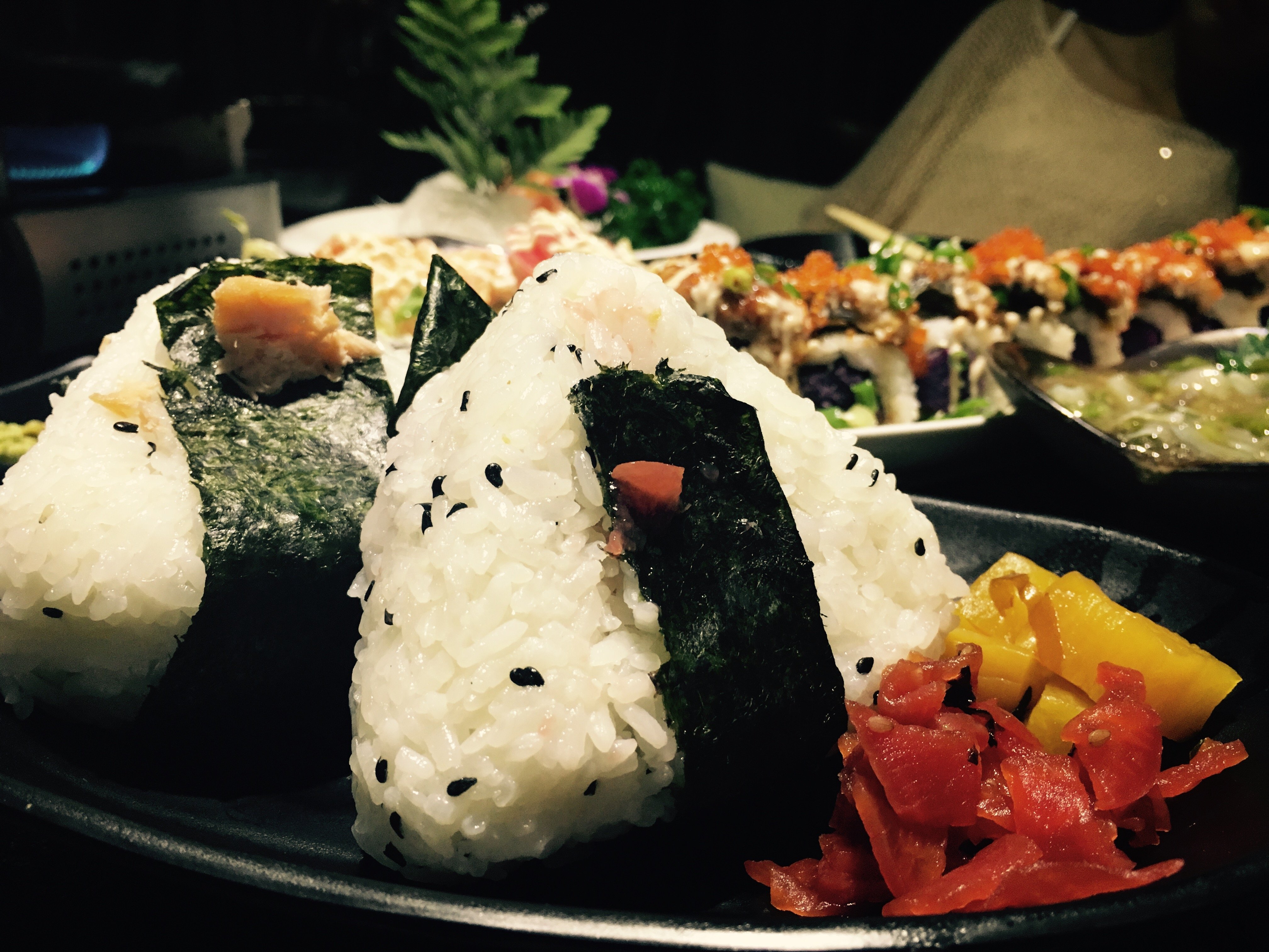 【菜品】【芥末章鱼】小块的章鱼非常爽口 有嚼头却又可以嚼烂 程度刚刚好 芥末味道爽翻啦 最爱的一道菜 【三文鱼】当时参加的活动 买一赠一 同时结账的时候就不能参与满减活动了 这个需要注意一下 肉质超级厚 嫩滑爽口 量也超级大 作为三文鱼的真爱粉自己吃一碟居然有点吃不下的感觉 【饭团】点了一个三文鱼和乌梅味的 小伙伴反应很清爽 【龙虾沙拉】很大一盘 龙虾肉质不错 整体味道很好 让人看着非常有食欲 【牛肉锅】一开始想点双人份 后来服务员告诉我们一人份量就很大 足够我俩吃了 结果果然如此 汤汁味道很鲜 牛肉也好嚼 服务员还热情地帮我们盛到碗里 很贴心 【紫薯寿司】无功无过 中规中矩的寿司 蘸着芥末吃还是不错的