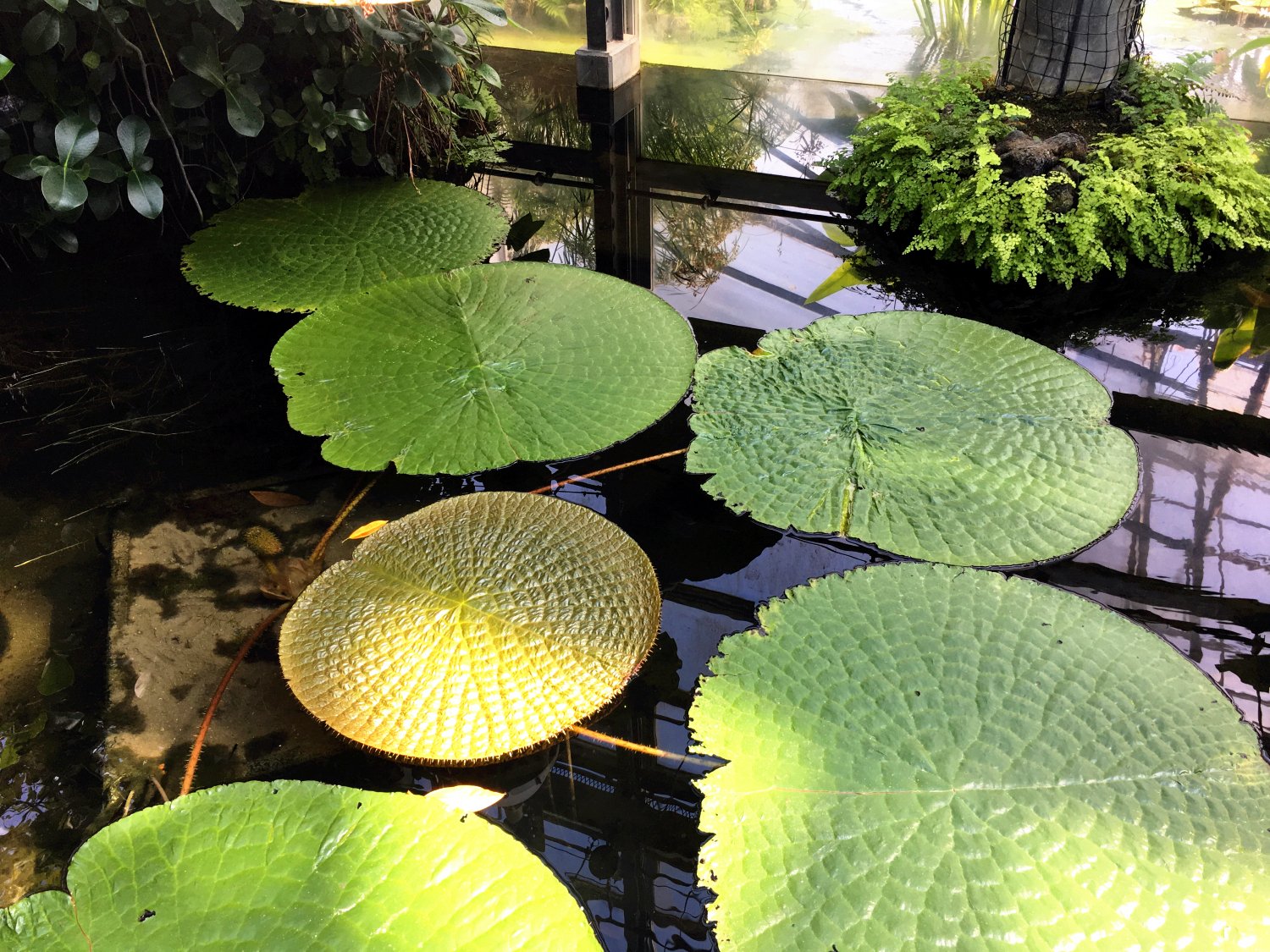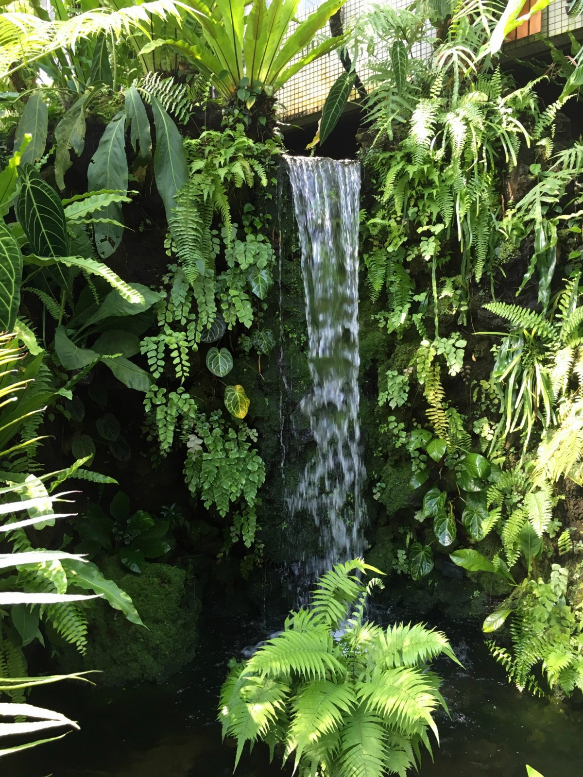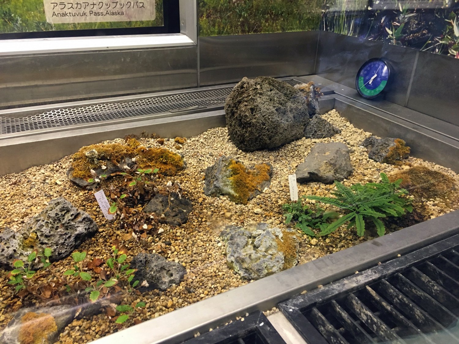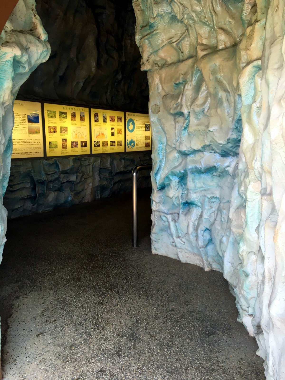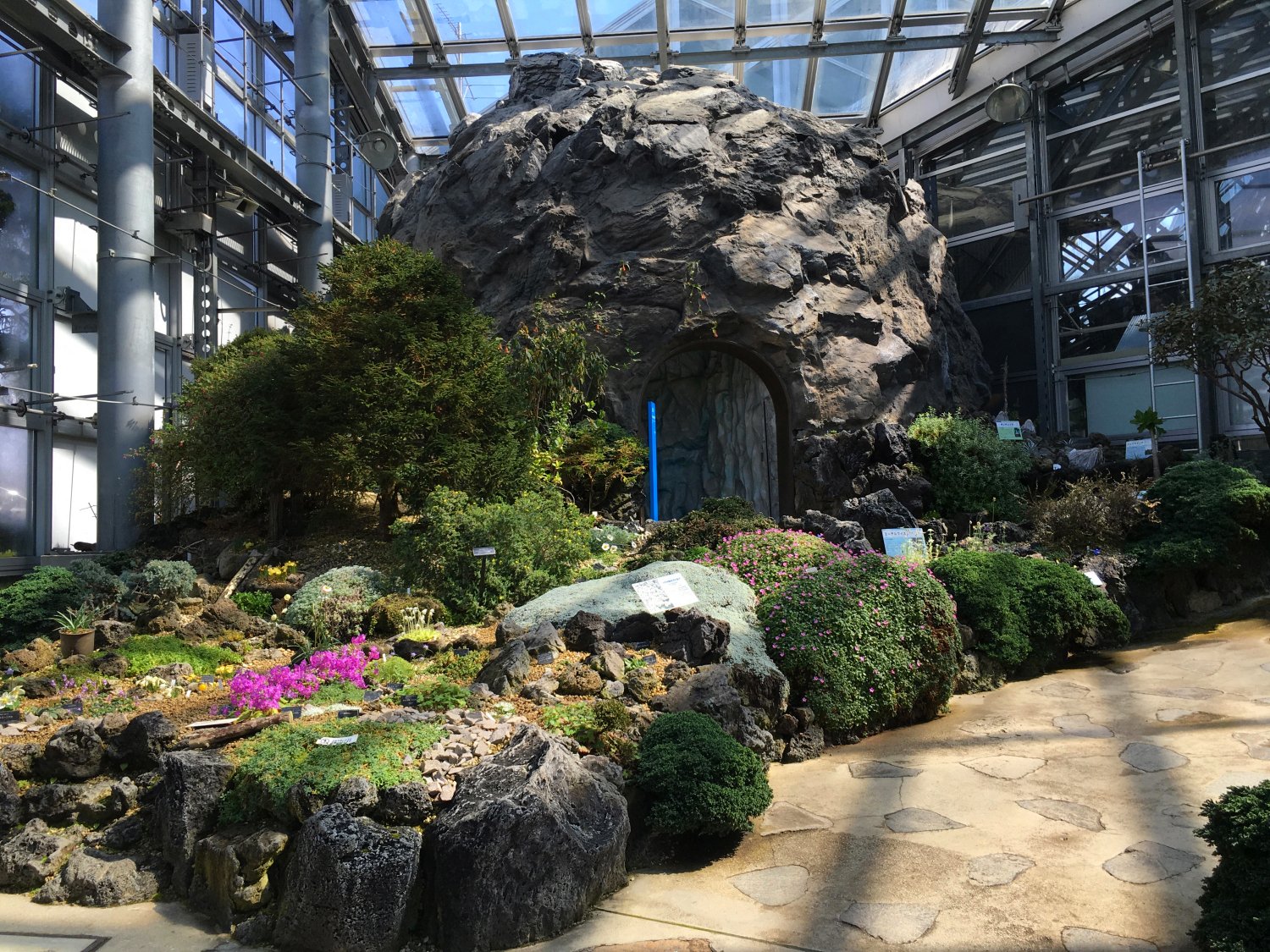 过了亚热带植物区和欧式庭院之后,就会再次进去室内,然后就看到一个巨形的人造山洞,山洞里面展示的是一些极寒之地生长的植物,所以那些植物都是养在一个小玻璃箱子里面,因为需要控制温度。