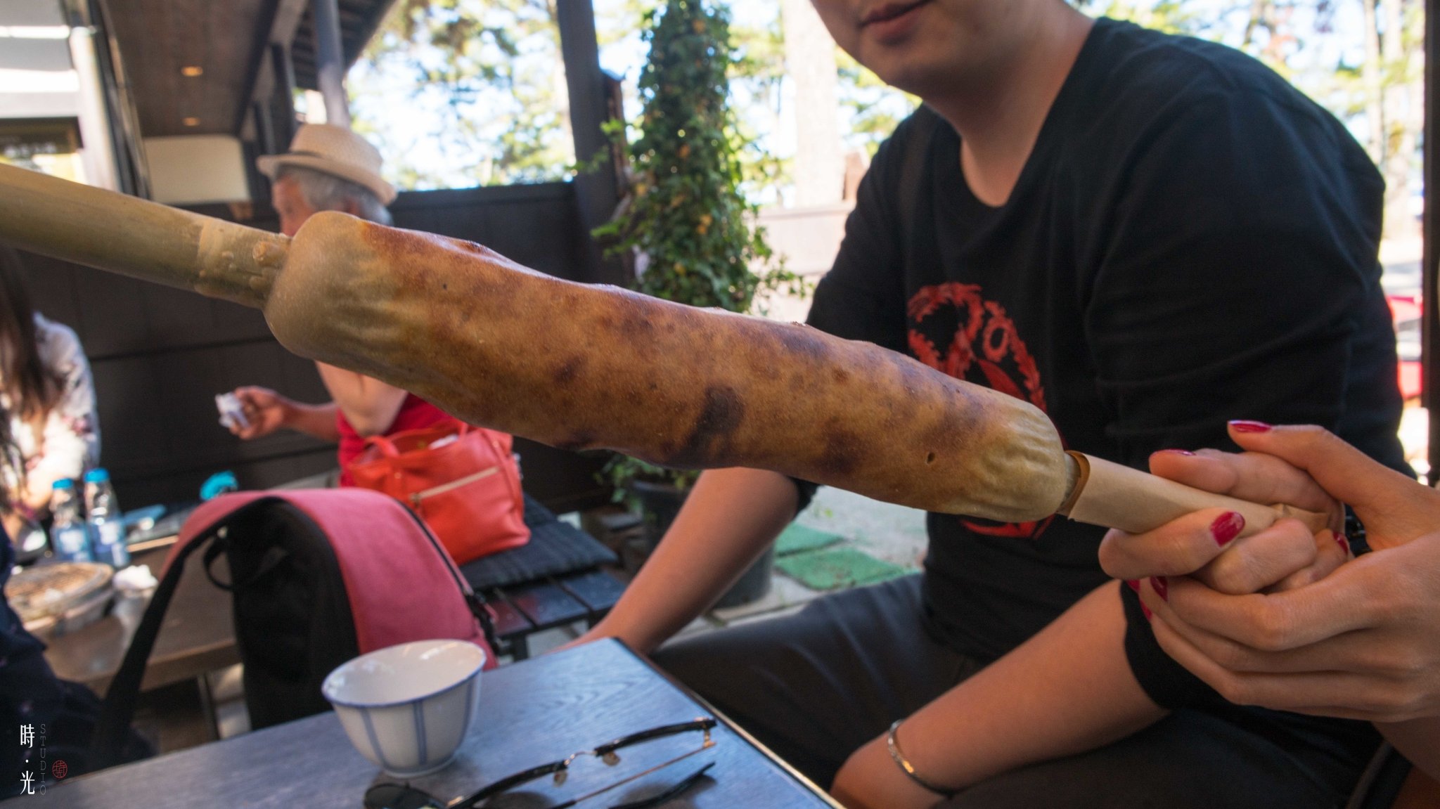 日本有一种很平民的食物叫:ちくわ(竹輪),超市里大概70-100日元一袋(2-3小根),这个巨大的一根,就是现场制作的竹輪。鱼肉打成泥,裹在竹子外面,再烧烤。哈哈,怪不得叫竹輪。不过确实现场制作的味道要比超市里的好吃很多。