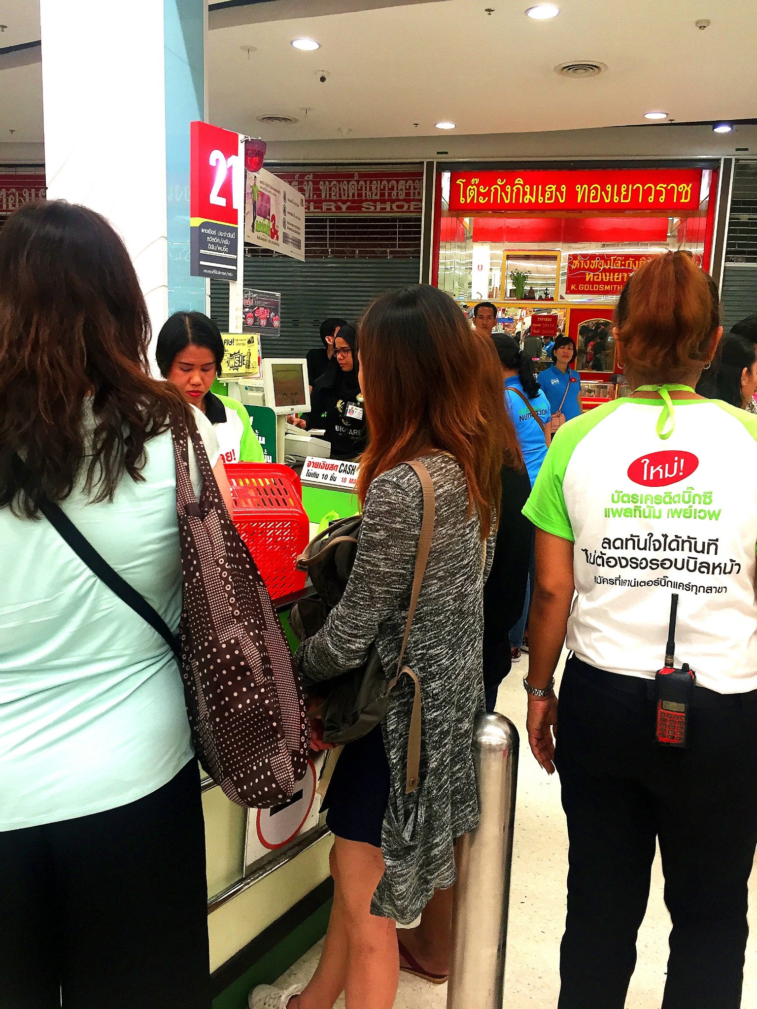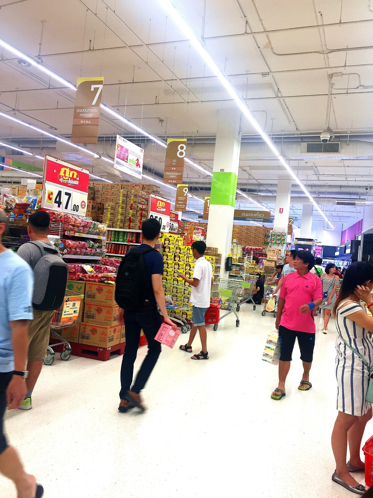 BIG C作为当地的大型超市,东西极为丰富,物品陈列的很有特色,让人一看就有购买的欲望。超市人比较多,很惊奇的发现居然一堆中国人,四处都在讲中国话,来自五湖四海的口音。很多商品都有中文标注,工作人员也会简单的中文,很多中国游客在门口打包,满2000B可以退税,打包免费,购物袋也免费,胶带30B。