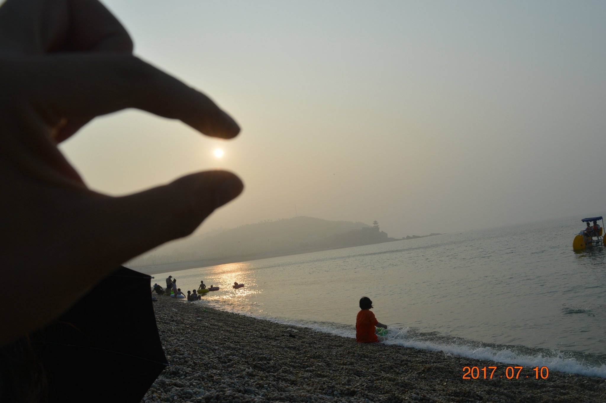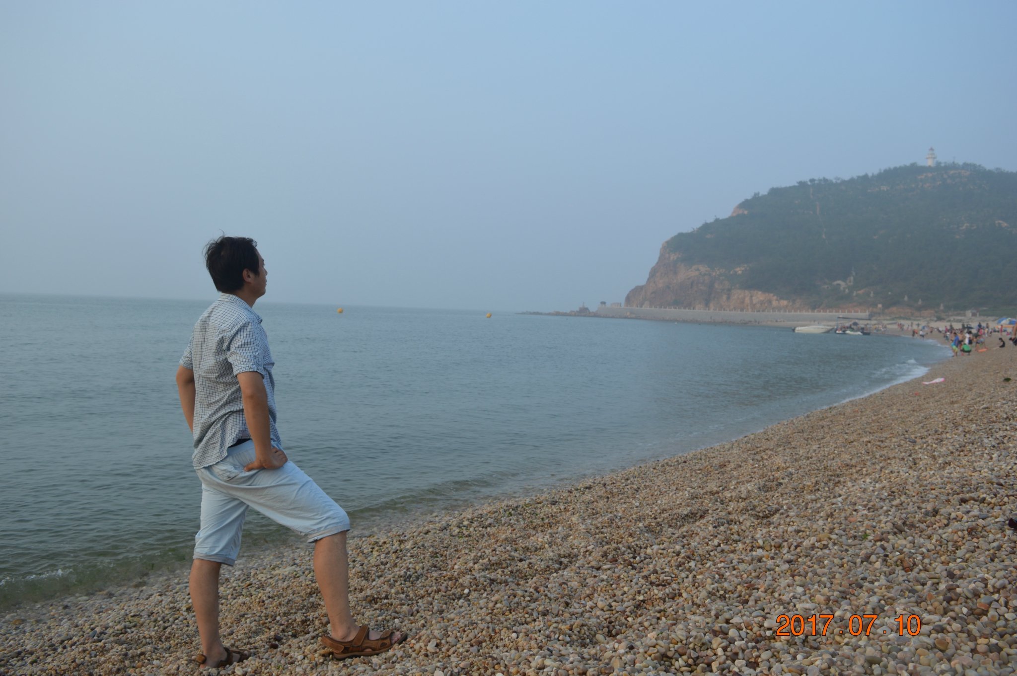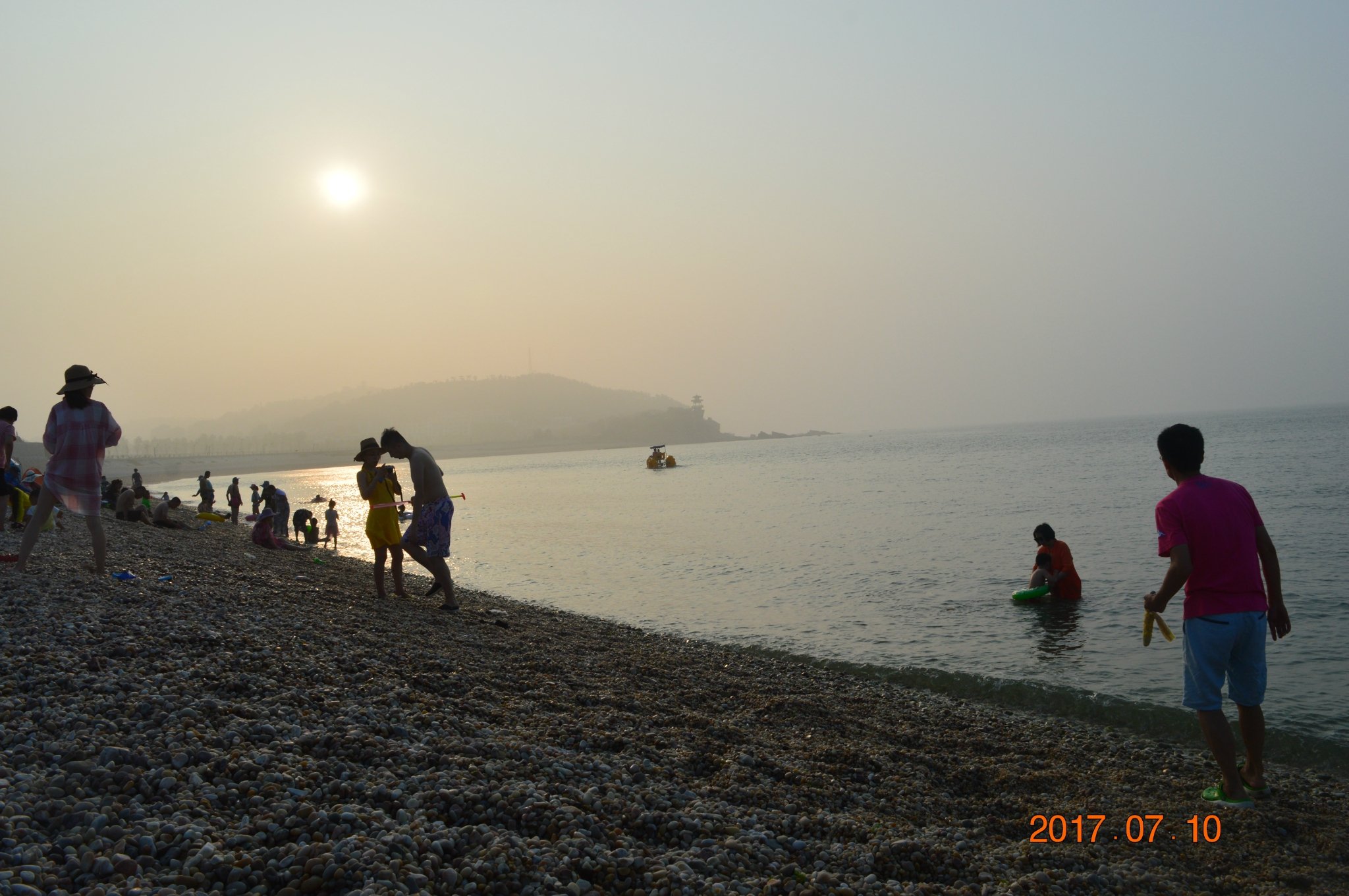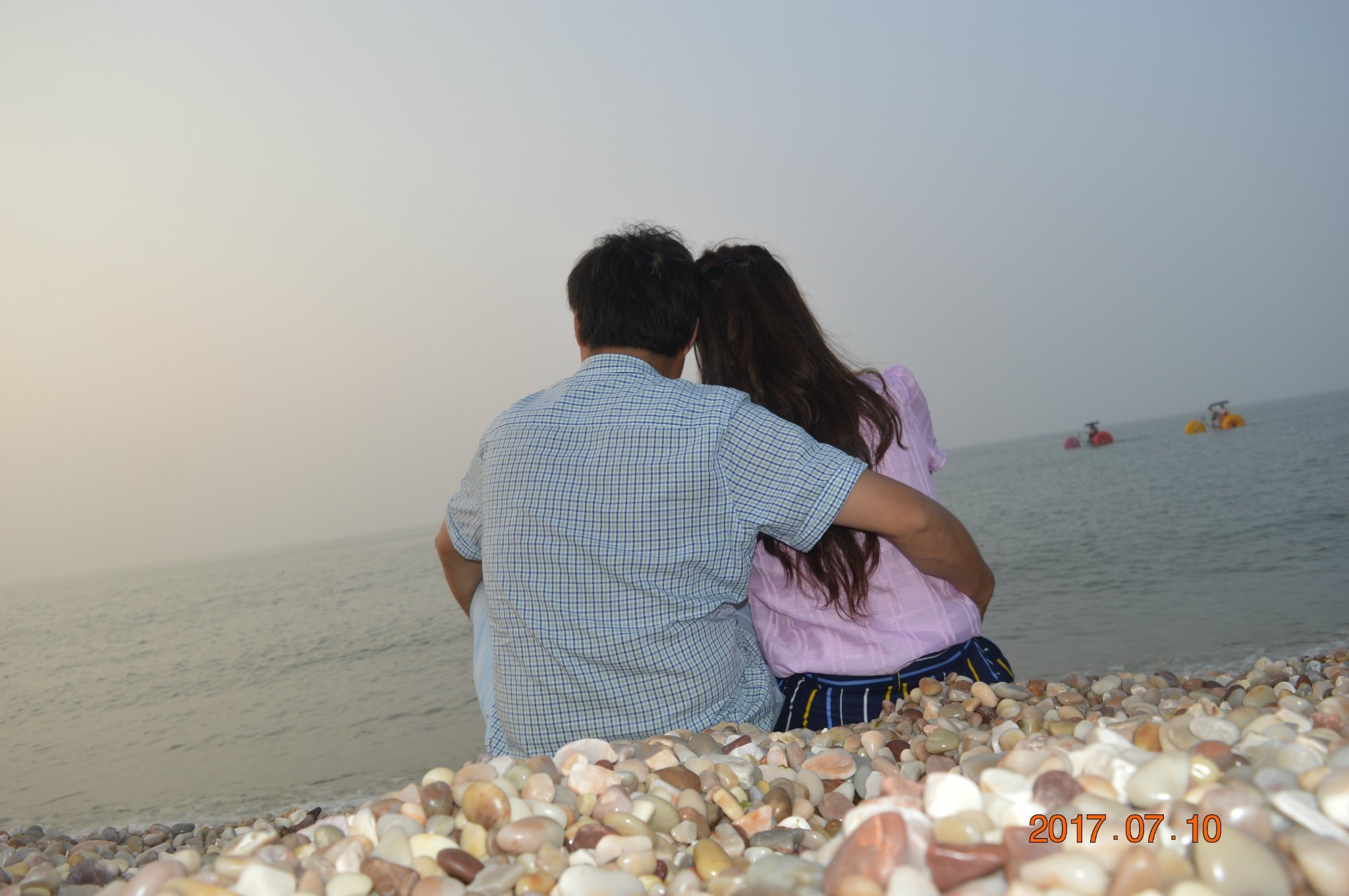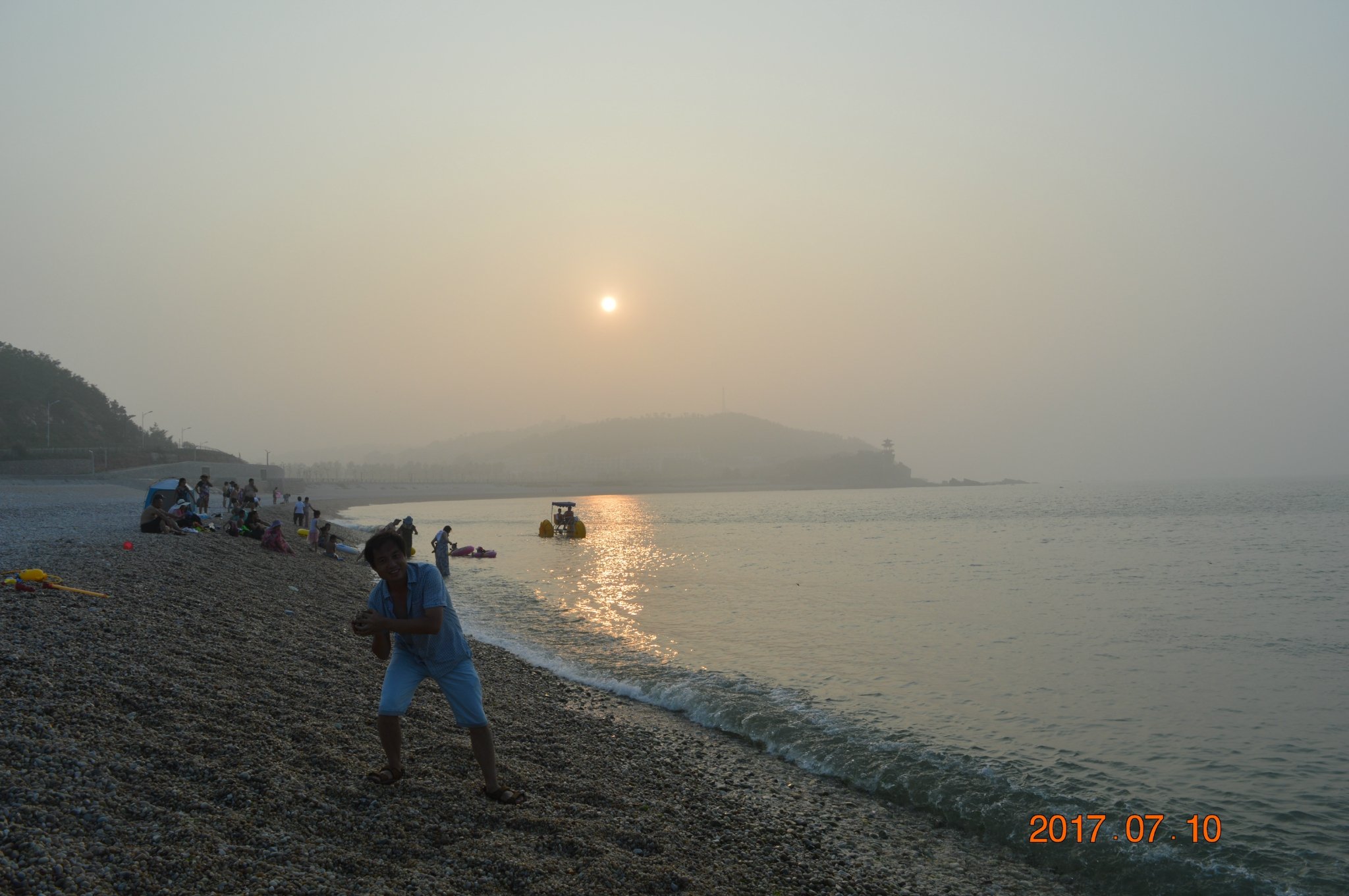 先生我俩,轮番上阵捡起石子抛向大海,嬉笑中仿佛回到美丽的童年!