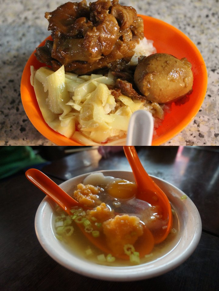 1、知高饭&虾仁汤 知高饭就是猪脚饭,老板帮你配上竹笋和一颗卤蛋,米饭不软不硬和着卤猪脚的卤汁...