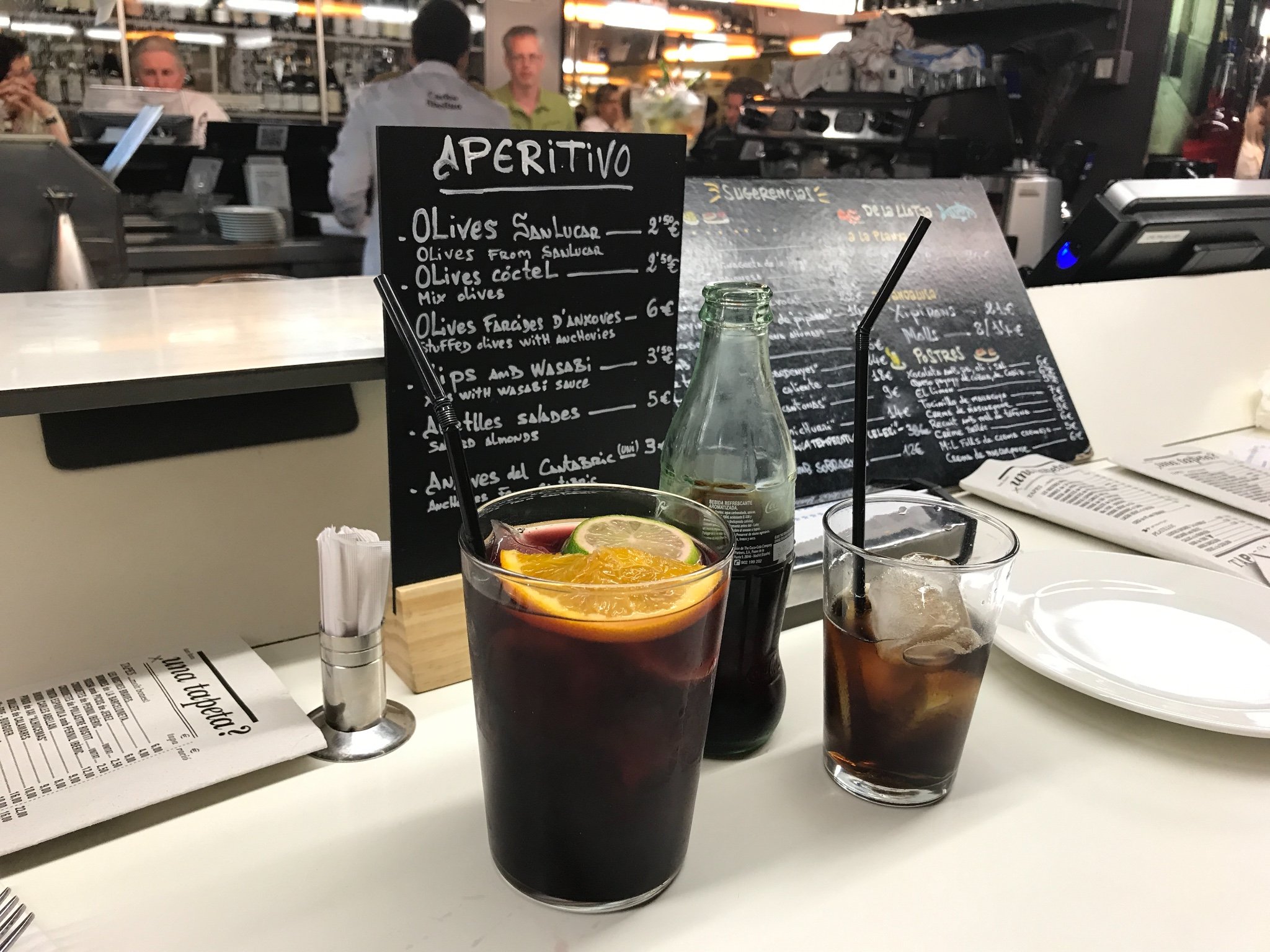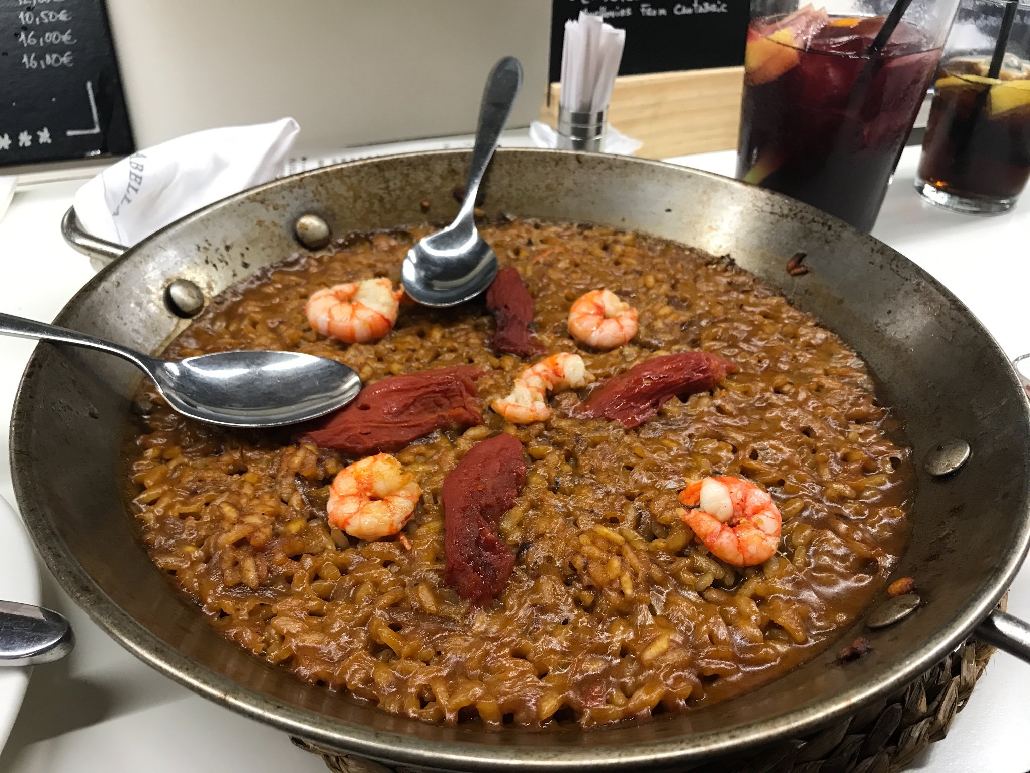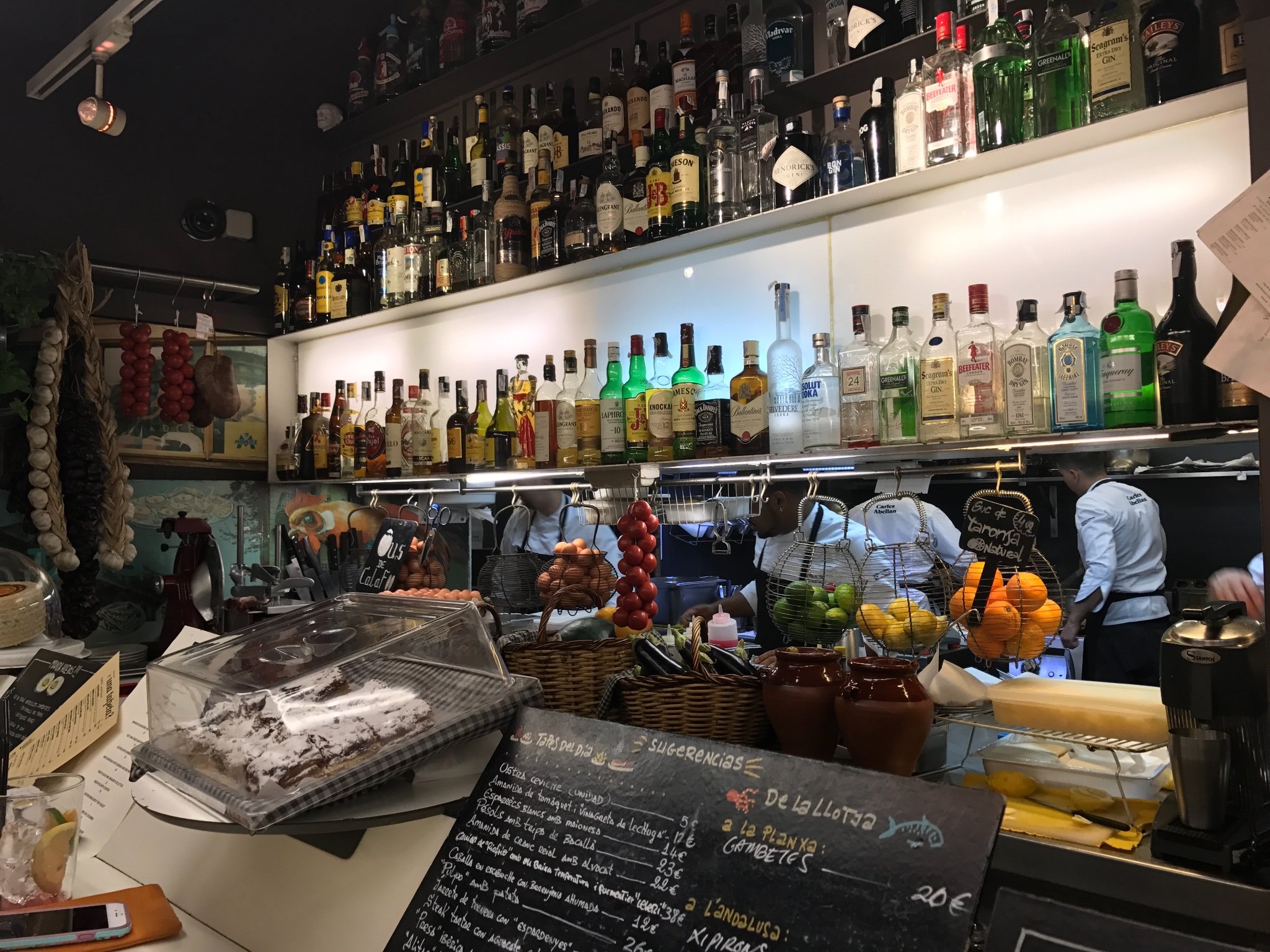 晚餐找到位于格拉西亚大道边的这家tapac24,米其林一星厨师开的餐厅,晚上八点已经开始排队,餐厅会登记姓名,然后按顺序领位。我们等了十几分钟,安排了吧台的位置。海鲜饭依然是每天的必点,一杯sangria喝完,已经有些晃晃悠悠……