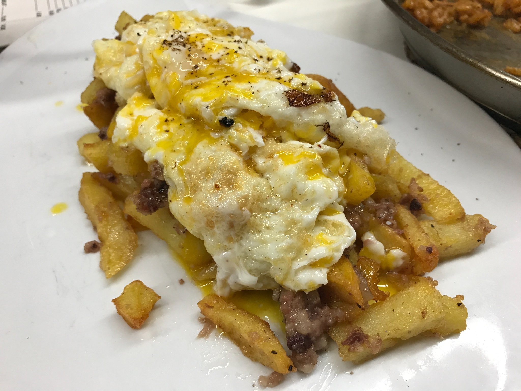 小哥在熟练的往烤面包片上擦番茄,它和橄榄是西班牙人餐前最常见的开胃小菜。