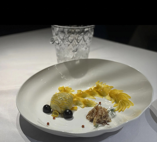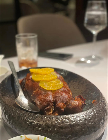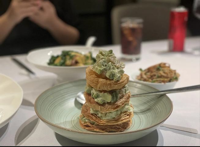 凉菜的口味远胜于热菜,有些菜品缺点很明显,有些菜品实力在线,价格较高的几个菜口味还是惊艳的。 牛油果三文鱼龙虾塔这个就属于凉菜中的佼佼者,底壳很脆,上面的酱微甜粘稠和牛油果非常搭配,有创意也好吃。 另外两个凉菜葱油嫩鸡,鲤鱼跃龙门就相对逊色一点。 热菜里大煮干丝,橙香火焰鸭很一般,尤其是大煮干丝,可以说难吃也不过分, 在扬州吃过,这个真的不堪 入目。 鸽吞翅: 这个其实就是仙鹤神针,工艺很考究,用料很金贵,里面都是鱼翅,但是味道不算太惊艳,不推荐普通人尝试。 蟹酿橙: 这个是真的好吃,里面的汤羹包含蟹肉、蟹粉、虾仁、鱼泡,可以说非常丰富,这种搭配哪怕食材再新鲜,空口吃那一定会有腥味,妙就妙在这个橙子上,挤出一点橙汁混入其中,顿时将整道菜品升华,橙子独特的清香、微酸微甜,直接就把“腥味”转化为了“鲜味”,入口又有那么多食材,那是真满足啊!这道菜是展现出食庐水平的,也让我对食庐的蟹宴有了一定的期待。 五虾煮豆面这个同样好吃,虽然用了五虾,但也没有丝毫异味,一口豆面鲜的眉毛要下来了。只能说食庐真的要吃的好,还得上上价格。 环境: 包间的话,还是宽敞的,没太大的问题。 服务: 生意太好,就算包间也很难服务到位,上菜顺序和速度也不怎么讲究,菜品介绍也几乎没有,总之一般。 价格: 就这顿饭而言,性价比绝对不算高,虽然餐厅显示均价是300左右,但想吃得好,恐怕这个价格拿不下。