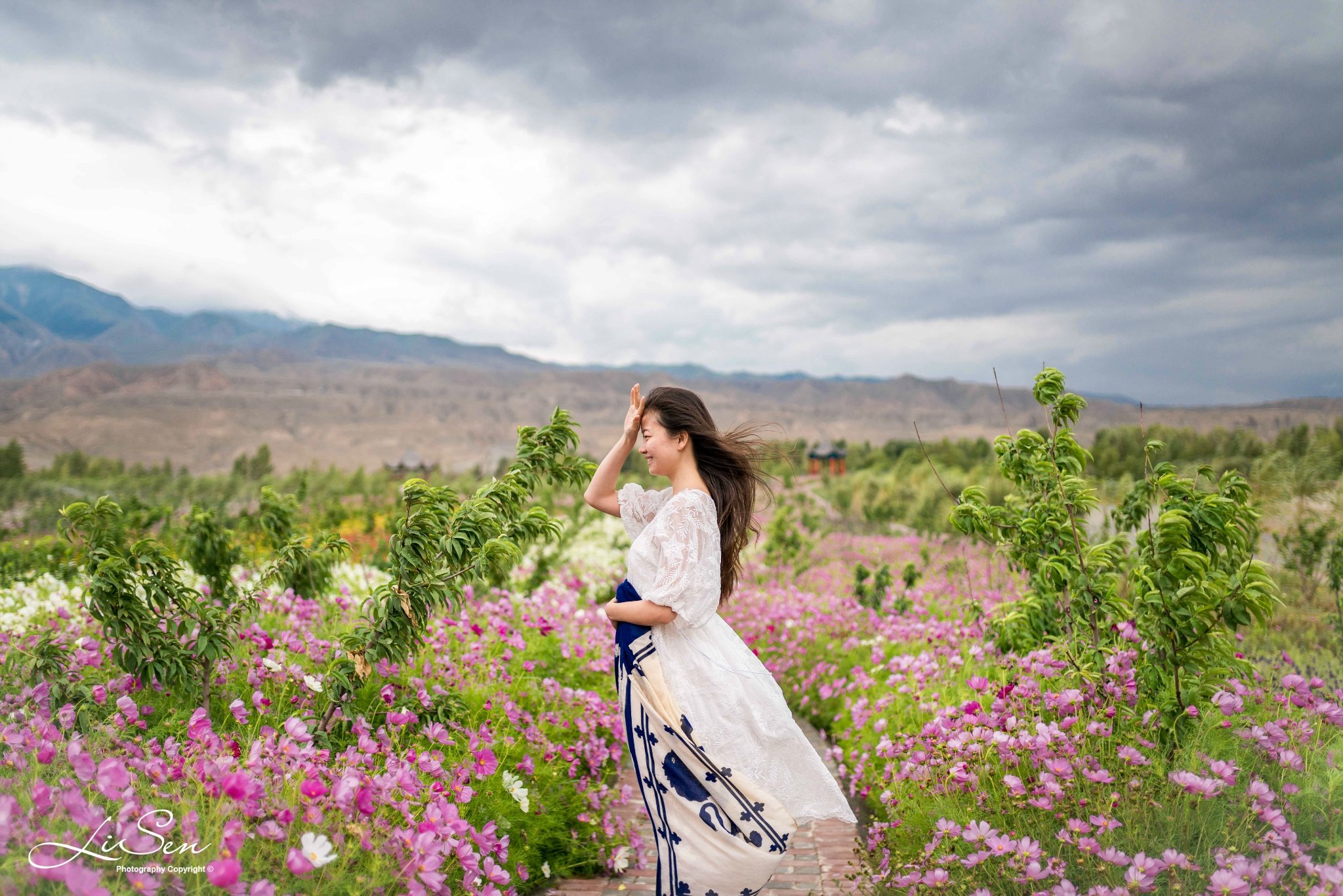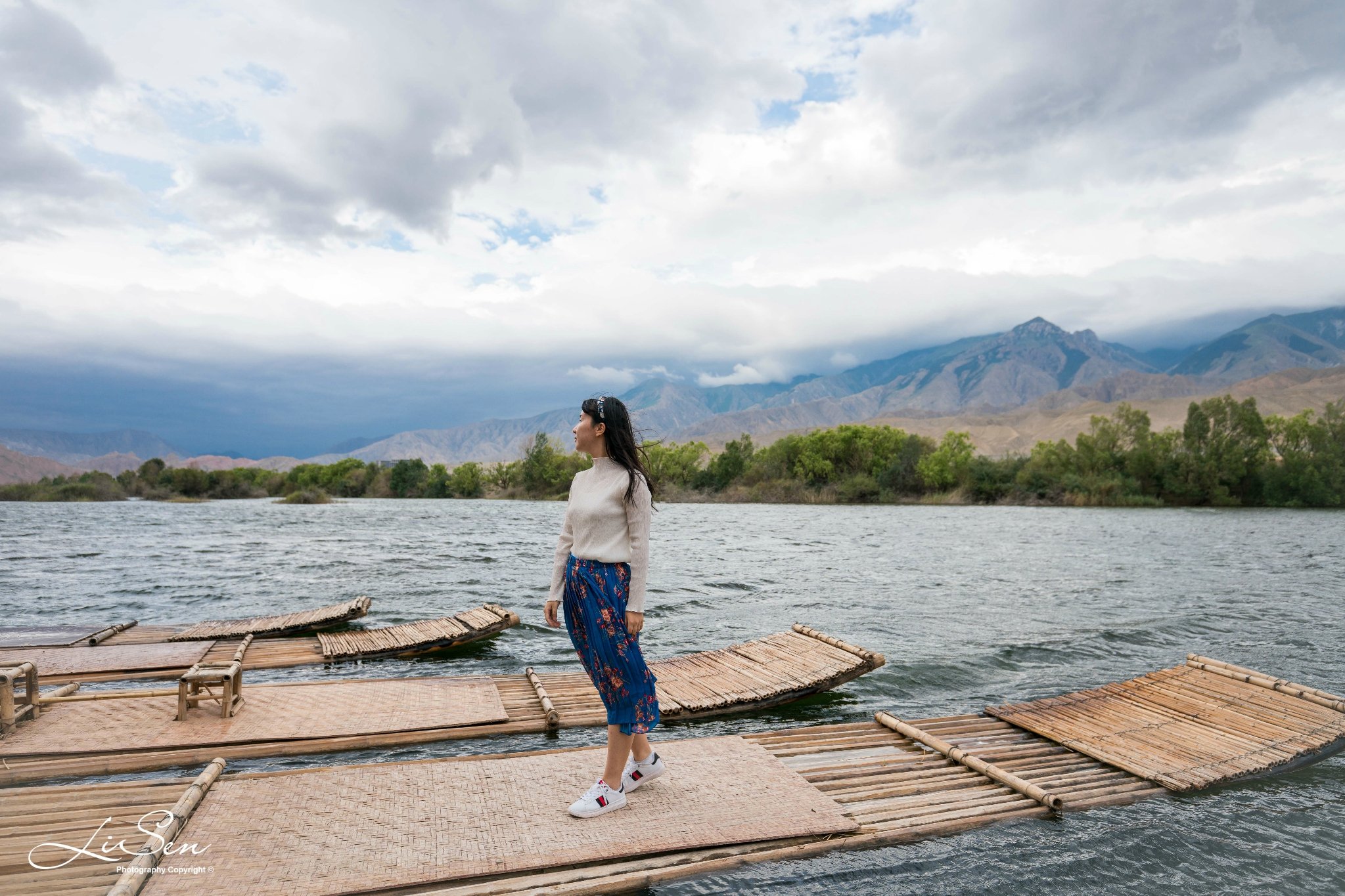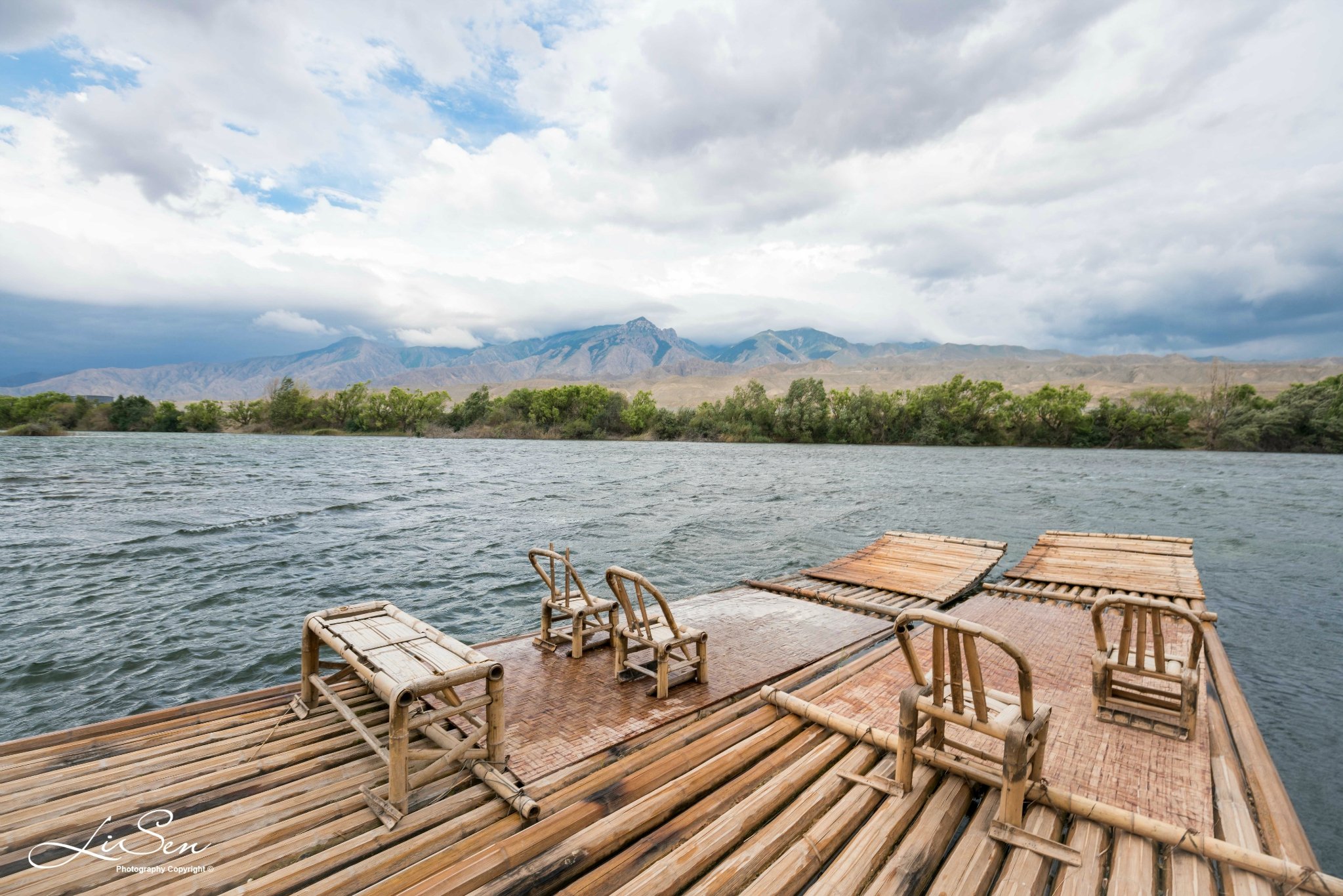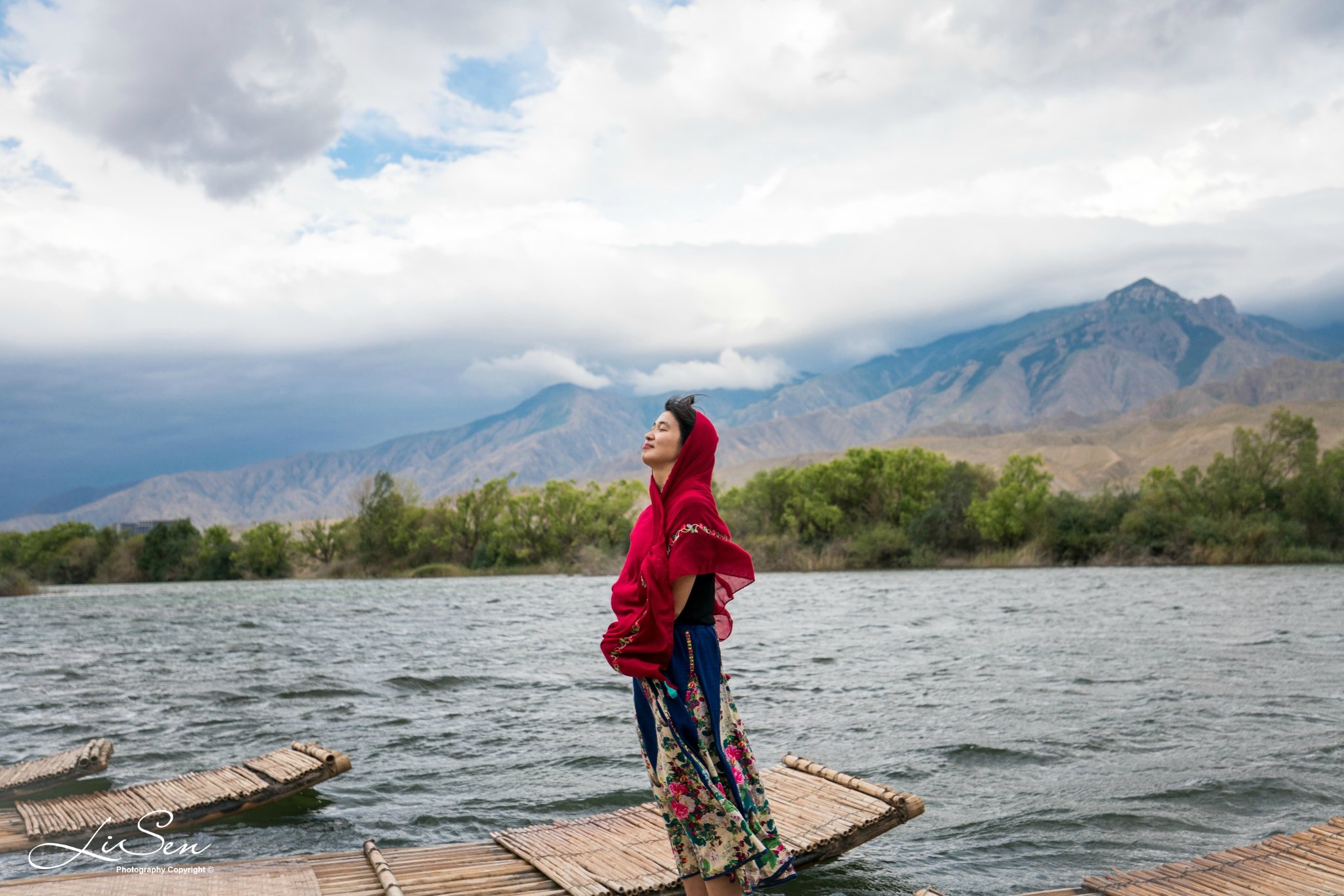 风太大不能划船,不过在竹筏上拍拍照,配上远方的壮丽山河,还是不错的。