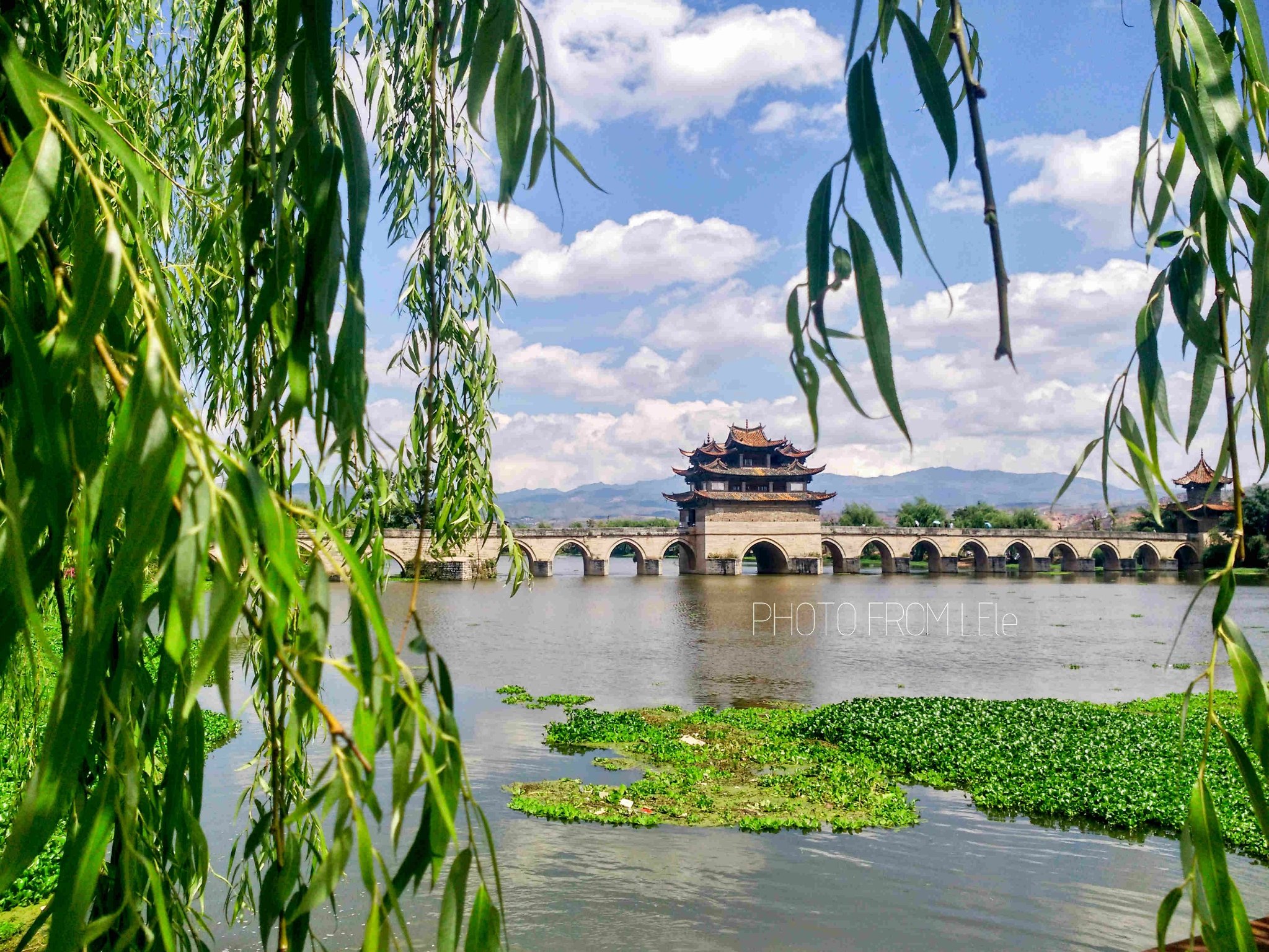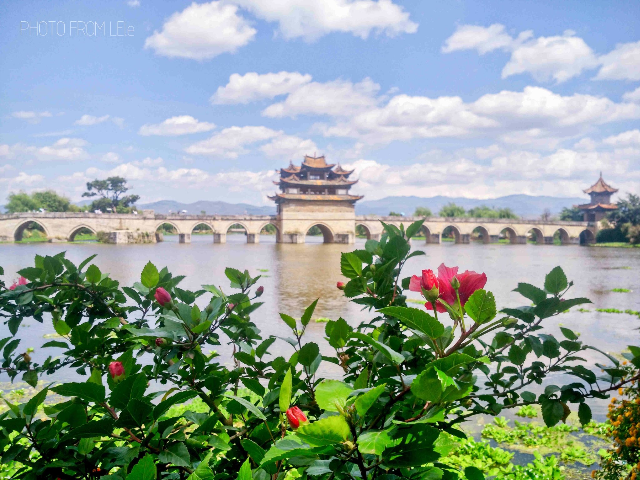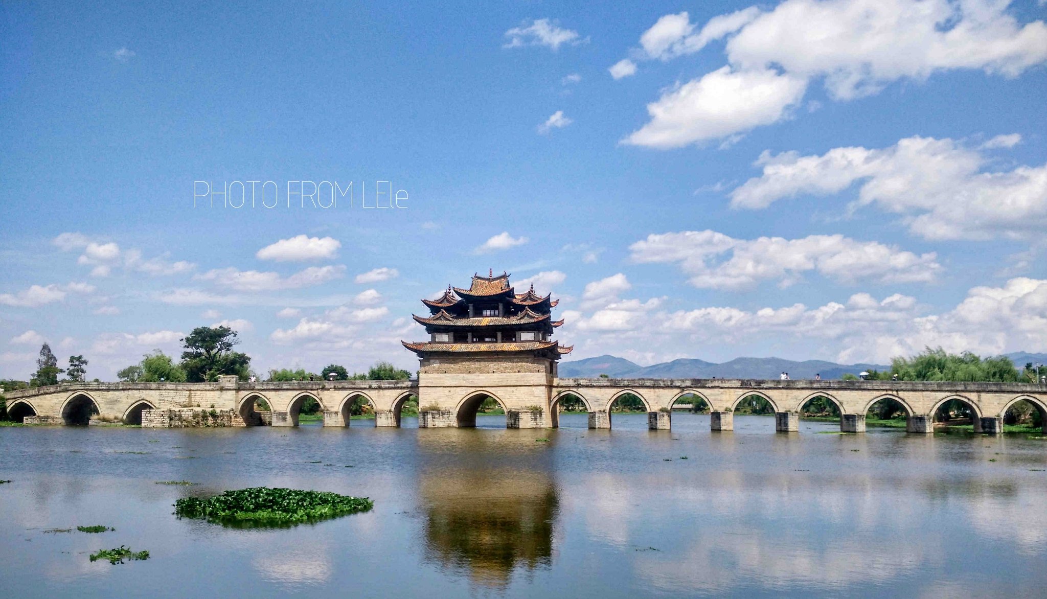 双龙桥,俗称“十七孔桥”,是座三阁十七孔大石拱桥。是云南省著名古迹之一,已列入中国造桥史册。清乾隆年间先建三孔,道光年间又建十四孔与之相连,因此俗称 “十七孔桥”。桥中建有三层楼阁,两端各有亭阁一座。桥身用巨石砌成,全长148.26米,宽3米,远看犹如一艘楼船,近观似长虹卧波。它造型奇巧,是我国现存的优秀古桥之一,属省级重点文物保护景点。