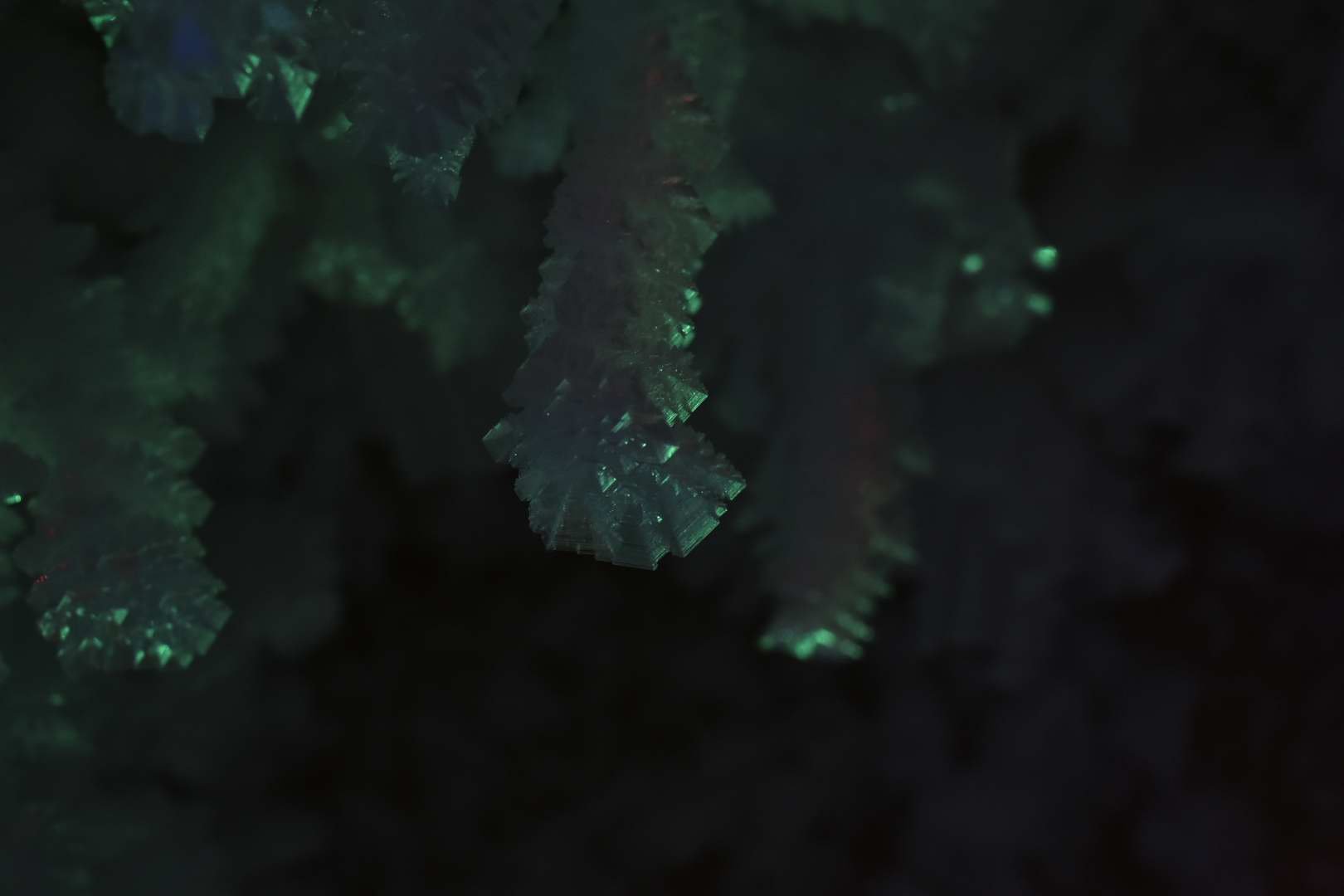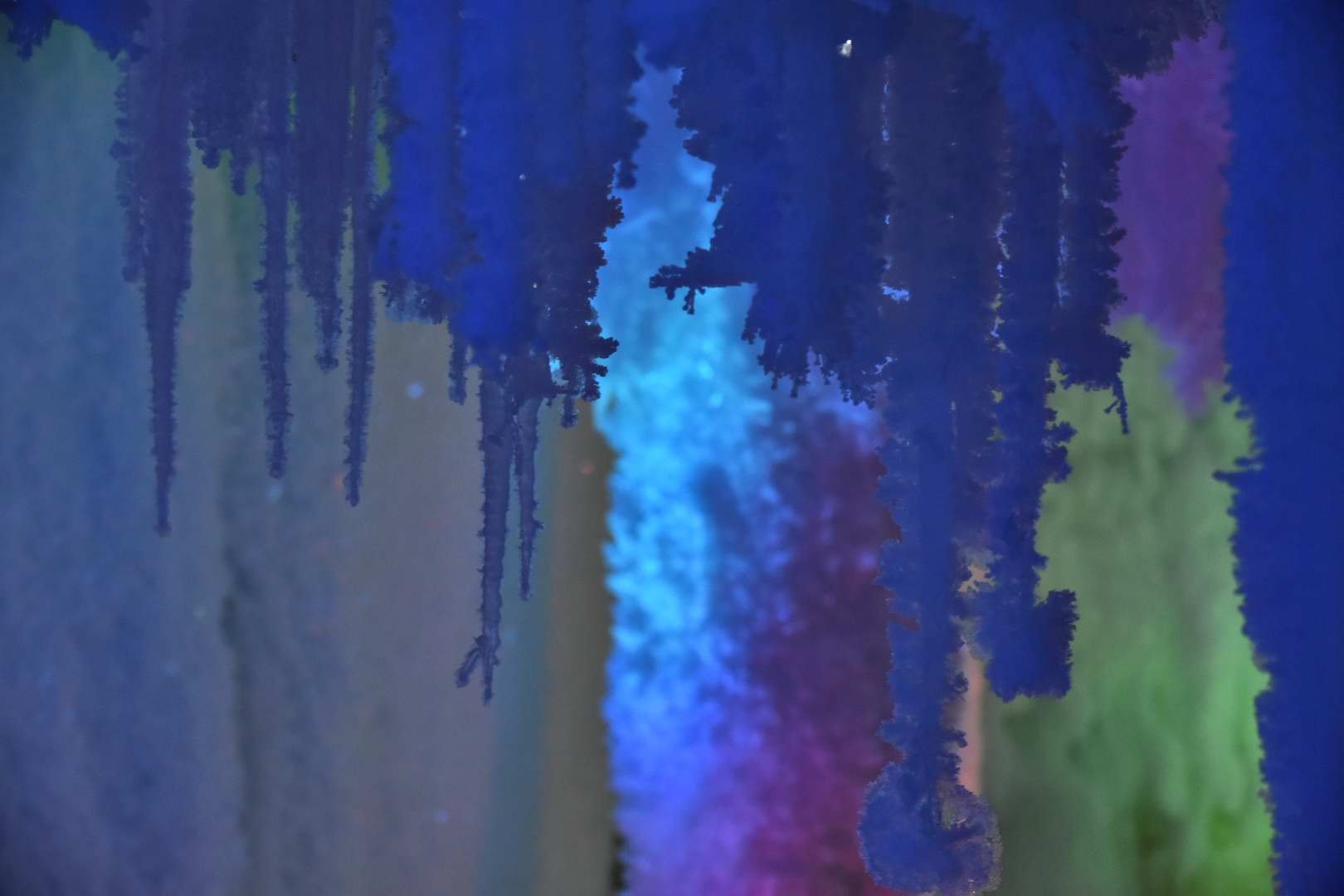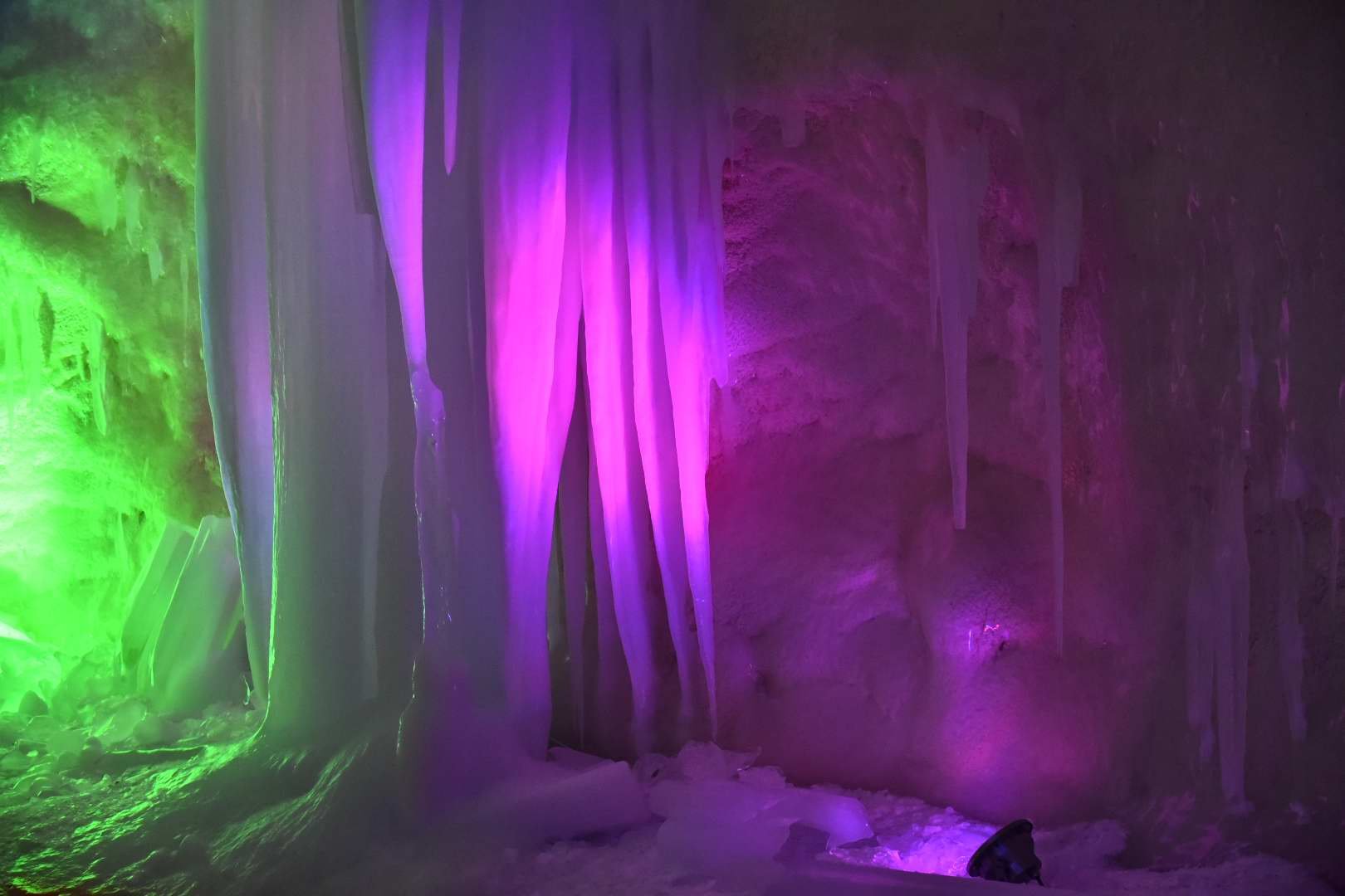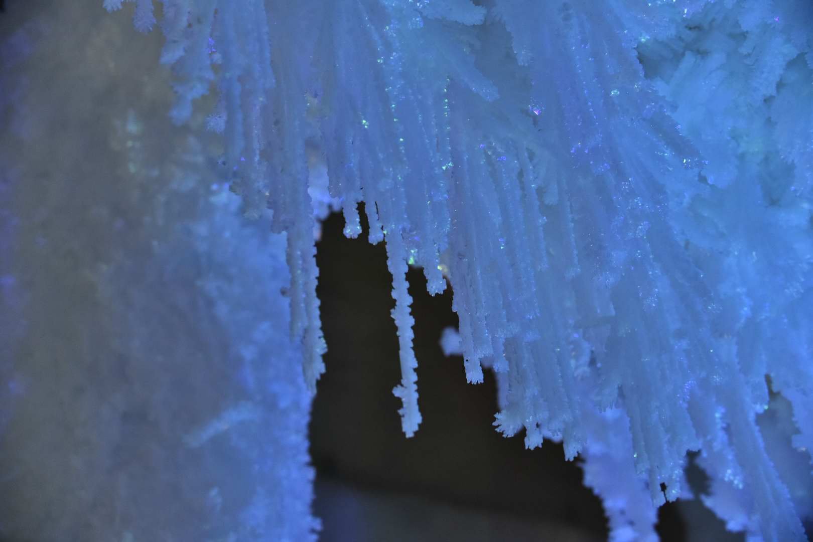其实每年冬天都在盼望着下雪,但大杭州好像就没下过能积起的雪。这趟倒是满足了我的想象。这是一个冰雪的世界,是一个冰雪的宫殿,整个溶洞都被洁白的冰雪覆盖着,一根根冰挂从天而降,浑如天成,远看像一棵棵冰雪覆盖的大树,那短短长长的冰挂就是这个大树伸出的玉臂琼枝。抬头看细处的冰花,像一朵朵没有一点杂色的白珊瑚,晶莹碧透,在洞内不断变换的灯光配合下,每一朵冰花都闪烁着梦幻的色彩。
