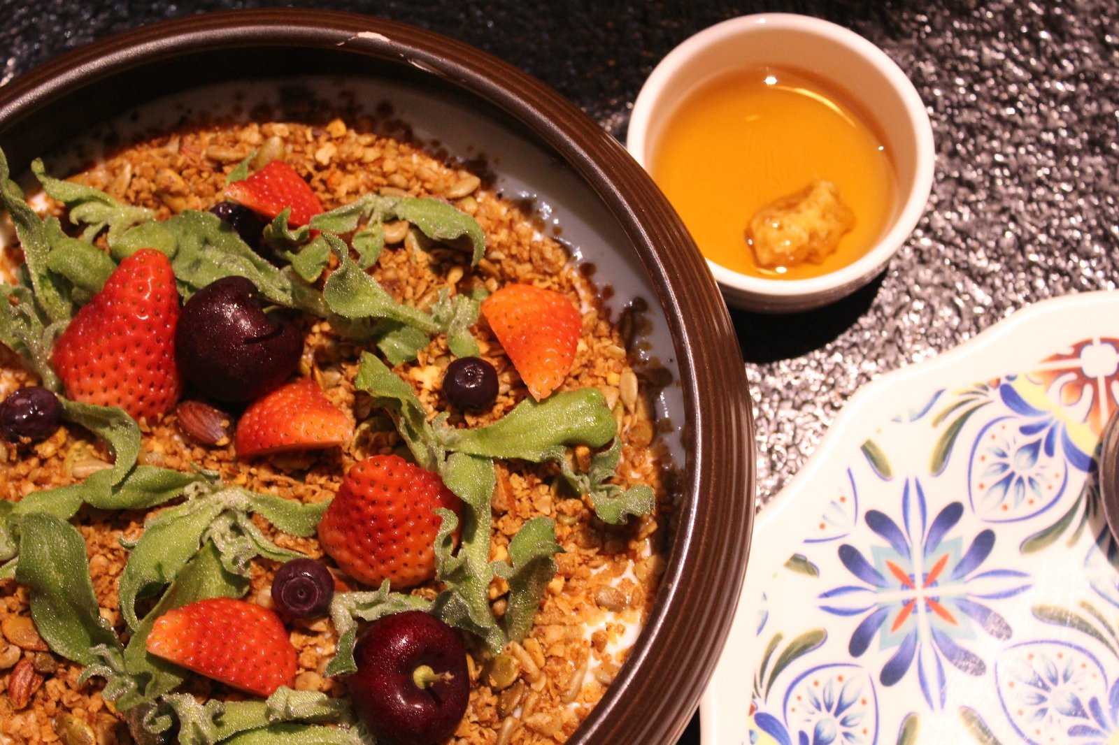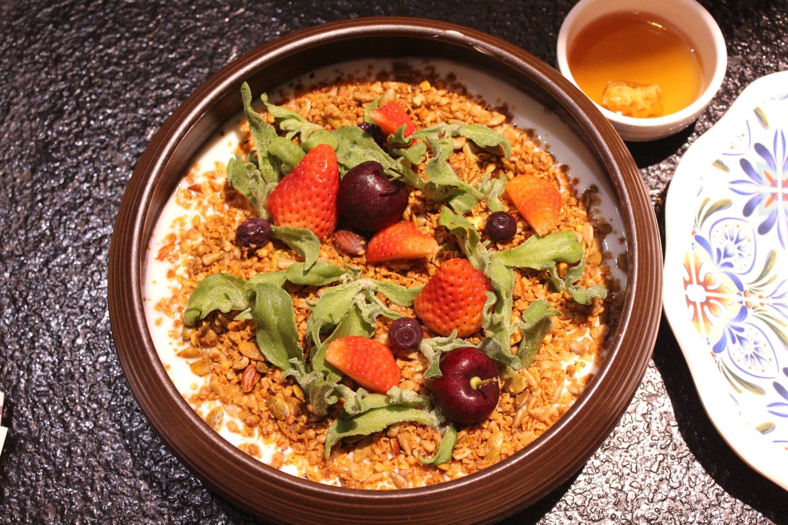 这个非常好吃,女孩子的最爱,本身不是很喜欢吃蔬菜,所以点了这个酸奶水果沙拉,酸奶上有大颗的草莓和车厘子,车厘子很甜,还有一层的碎坚果,比单纯的水果酸奶又增加了很多元素,吃起来一点都不单调,除了水果以外,还加入了蔬菜沙拉常放的冰草——既像蔬菜,又有着水果的口感,很有创意。