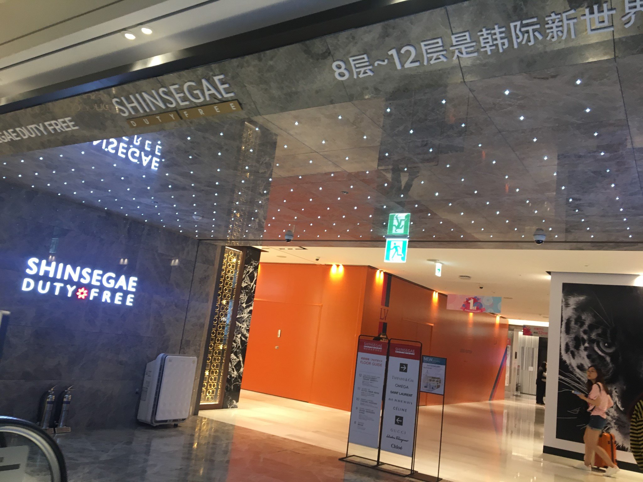 电梯非常好找,上下电梯不用跑来跑去,都位于中央,并不是通常情况下的一边一个,8楼电梯口边上就摆放着中,日,韩三种语言的免税店楼层指南和周年店庆的优惠手册,有这两个小本本在手,有什么活动优惠一目了然,每个楼层的品牌分布也一清二楚,节约了很多时间。