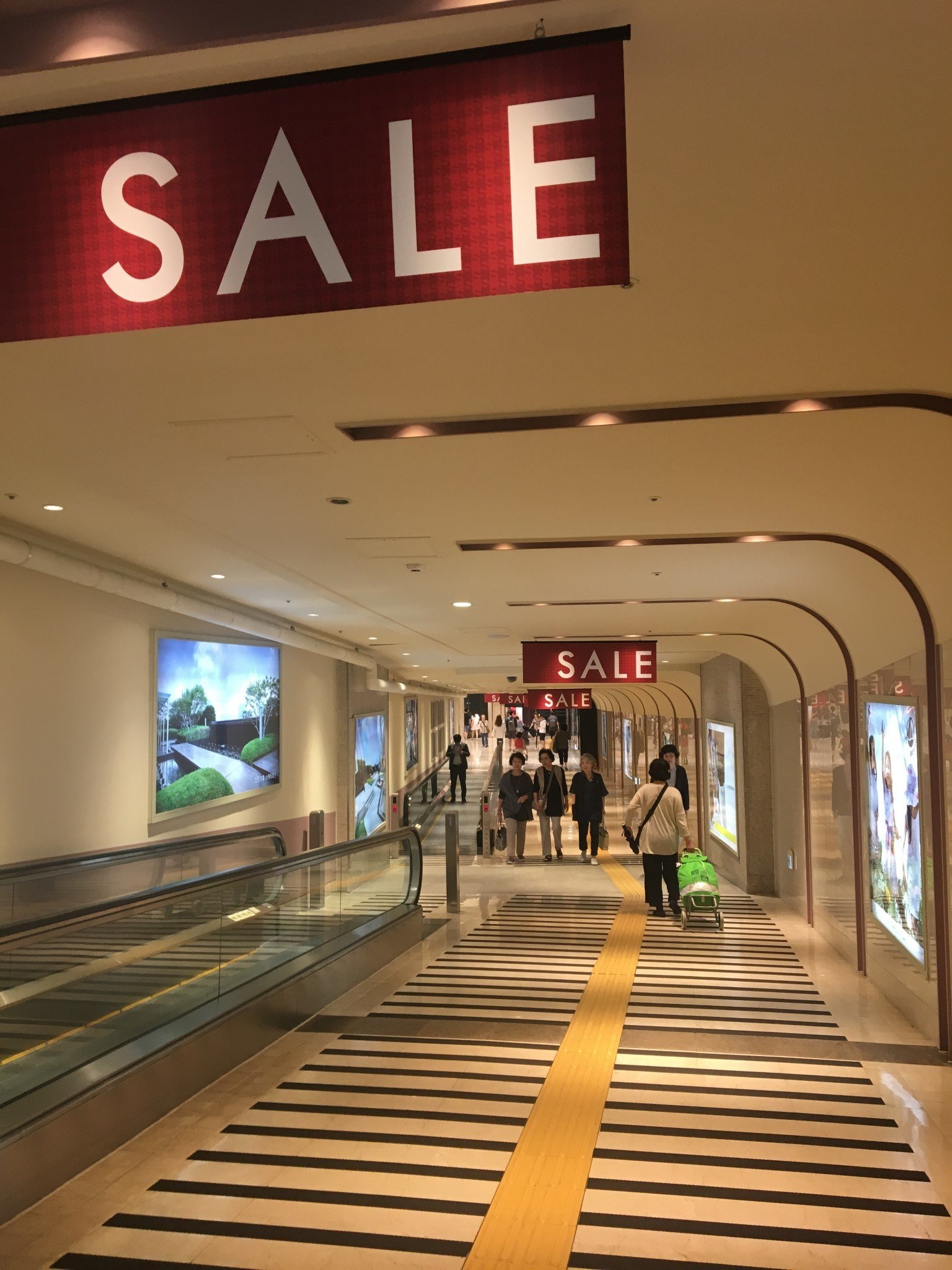 这条道就是破竹所说的地铁内直达通道,一边是步行区,地下是防滑设置,另一边是机场经常也能看到的电动步道,方便拖着行李的游客行走,很贴心哦。通道上方到处挂着SALE的标志,果然赶上好时候了哈哈。