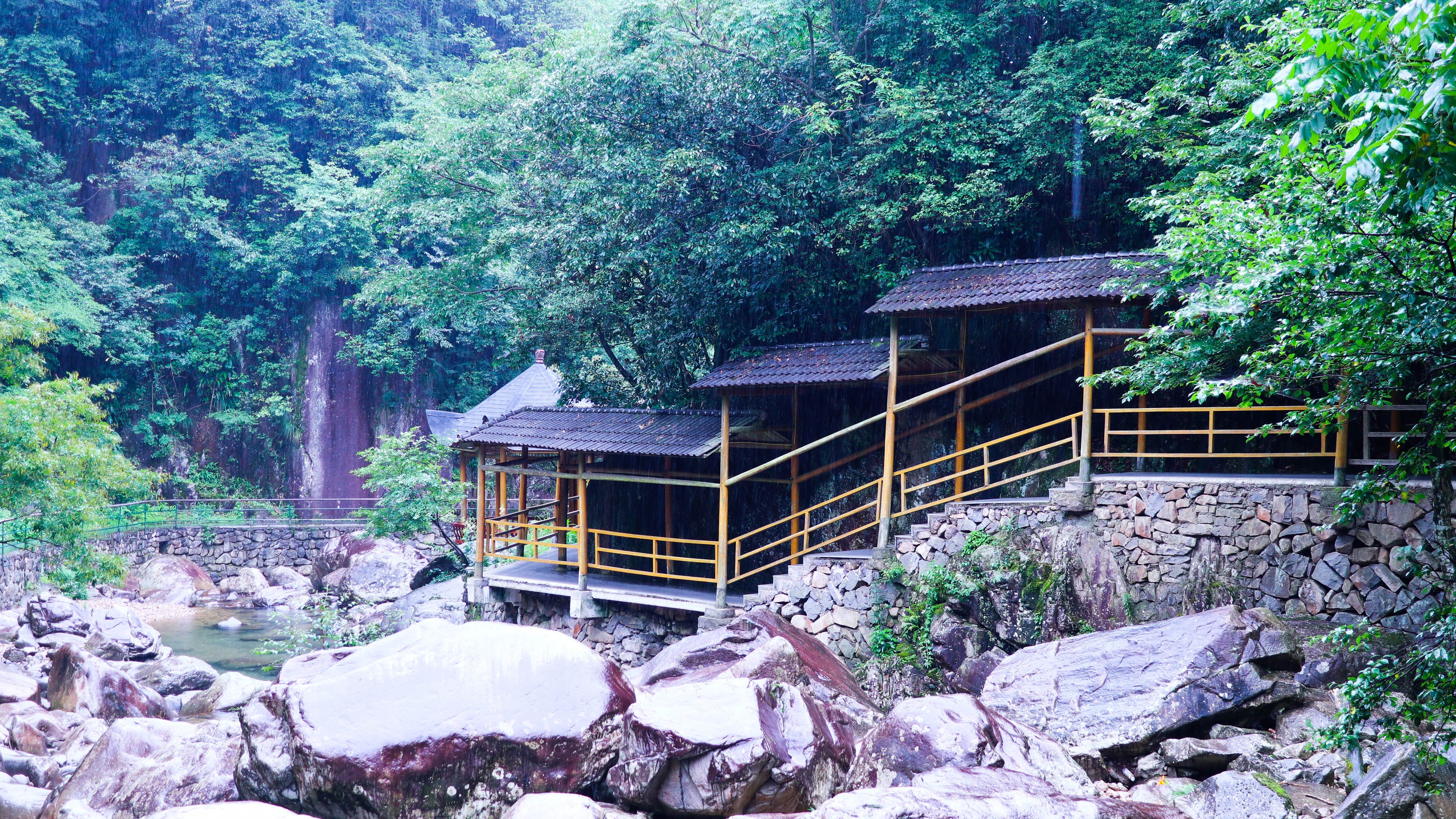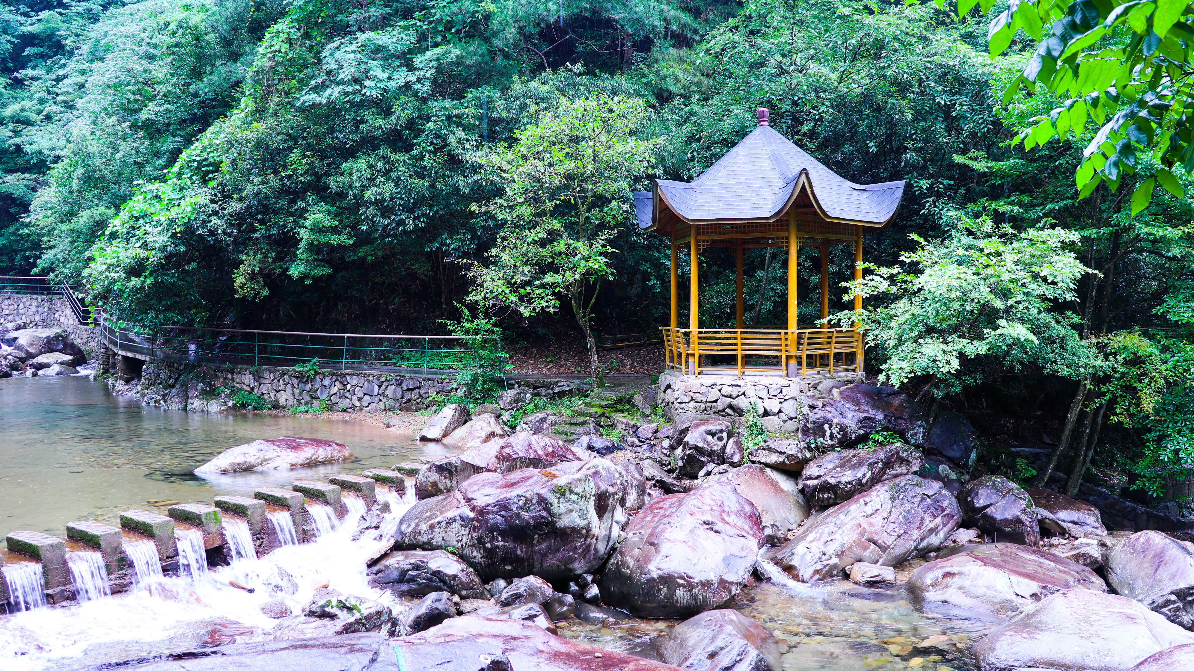 走几步要是累了,可以在小亭子里逗留一会儿,歇息歇息,静静聆听山林中瀑布的回荡之声。