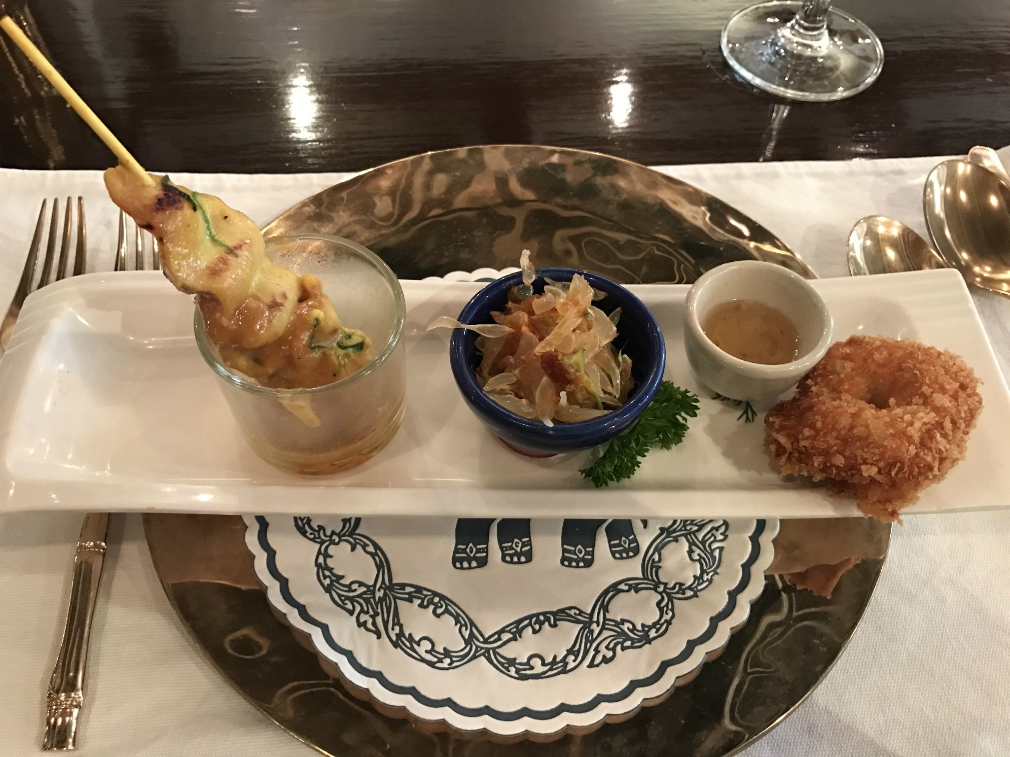 第二道菜:前菜,是三道小吃的拼盘,包括鸡肉串,柚子沙拉以及右边的炸鸡块。极力推荐右边的炸鸡块,比KFC好吃100倍,吃了这块我还要了1份,420铢。