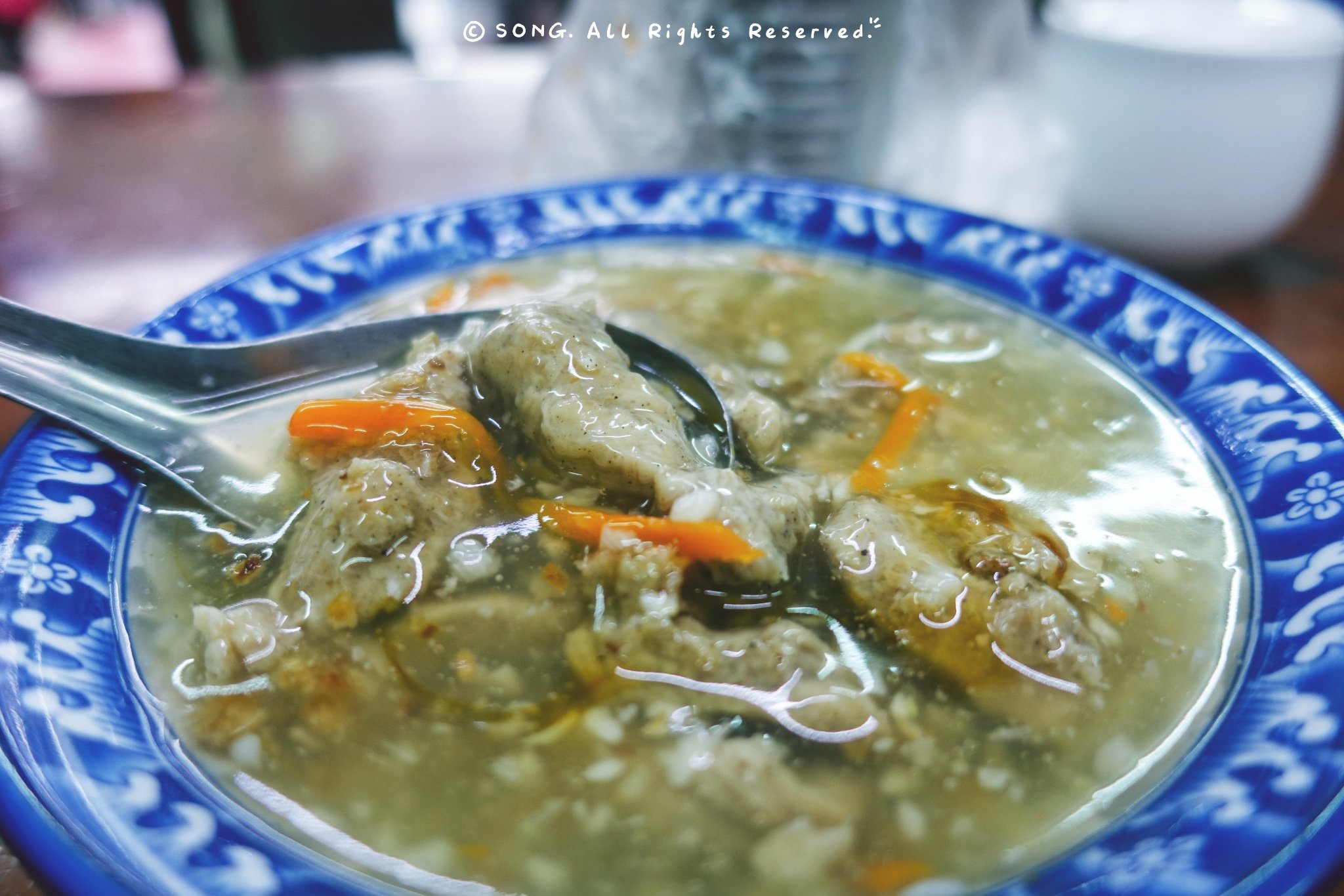 咳咳,正宗的那家歇业(坚强的微笑.jpg.Ver 3.0),马路斜对面有另外一家,据说是老师傅的徒弟也不知道亲戚出来单干了~ 地理位置比老店更好找一些,门口排队的小伙伴也不少~ 肉羹的肉很实诚,一块块鲜嫩适中,汤汁加了醋更加开胃,倒是蒜的味道实在浓烈了点,还是生蒜的那种味儿,怂妈表示一百个吃不惯~ 并且,一百个嫌弃吃了那么多蒜的我~