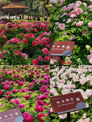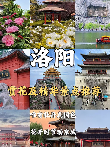 芳菲四月,神都洛阳,四五月一定要来洛阳,游 览古诗里说的"唯有牡丹真国色,花开时节动京 城"的盛世场面,今天就让我带大家一起来看看吧 )花开时间 洛阳牡丹花只开三批,3月底开第一批,这是最 早的一批,一般多为温室的培养的; 4月中旬开一批,这时不仅景区,满洛阳街边都 是牡丹花, 五一是最后一批,之后牡丹花就开败了,五一过 后再开的就是芍药了! @洛阳牡丹园特别多,一定看好牡丹园的名 称,别走错地方。给大家推荐5个洛阳牡丹主要 观赏地~ 牡丹主要赏花地 @王城公园 位于洛阳市中心,这个公园虽然不大,但是作为 洛阳历年牡丹会主会场的公园,名气很大,里面 还有个动物园,所以本地人经常去,适合亲子游 玩 地址:洛阳市中州中路与王城大道交叉口 赏花期:4月1日~5月5日 门票:50/人 1自驾不好停车,建议坐地铁1号线直达,王城 公园C口出来 2|隋唐遗址植物园 位于洛龙区,牡丹种植的面积非常大,有9大色 系牡丹1200多个品种,30余万株,盛花期仿佛置 身花海,除了牡丹,还有各种珍稀植物,是一个 集科普、休闲于一体的好去处 北门对面是!@洛阳博物馆,赏完花可以去博物 馆逛逛,这里适合踏青,赏花,遛娃 地址:洛阳市洛龙区王城大道 赏花期:4月1日~5月5日 门票:40/人 1自驾的话,建议从北门进,离博物馆不远,有 停车场(博物馆需要提前预约哦) 坐地铁的话到西门 @中国国花园 位于老城区,国内最大的牡丹专类观赏园,园区 在洛河之畔,风景非常美丽,园内牡丹品种多且 名贵,主要有洛阳红、珊瑚台、迎日红、景玉、 凤丹等。游玩最少需要半天时间,西门离洛阳博 物馆较近 地址:洛阳市龙门大道1号(洛阳桥南) 赏花期:4月1日~5月5日 门票:50/人 !园子太大,分东门和西门, 时间充裕的,可从东门进,一路赏花 想集中看花的,从西门进,有一片很美的花园 @神州牡丹园 位于洛龙区,被誉为"中国牡丹之都",园内有世 界各地的牡丹品种,多达1000多个,从传统的 红、粉、白牡丹到罕见的黑牡丹,每一种都有它 独特的魅力 牡丹主要分布在国画台、精品观赏区等,有室内 牡丹园,花期开放较早。园区斜对面是©白马寺 ,可规划一同游览 地址:河南省洛阳市洛龙区洛白路3号(白马 寺斜对面) 赏花期:4月5日~4月15日 @国家牡丹园 位于老城区,又名国家牡丹基因库,是培育牡丹 的专项园区,园内景致别具一格,只有在牡丹花 会期间才对外开放,是洛阳牡丹的原生故土。牡 丹主要分布在南园凤丹林和北园九色台。附近有 古墓博物馆 地址:洛阳市王城大道与310国道交叉口西1500 赏花期:4月5日~4月15日 @国际牡丹园 位于洛阳北邙,由于气温较市区略低,也是中原 最大的晚开花观赏园,由六大园区组成,国外牡 丹品种多,牡丹主要分布在华夏园早花区和大温 室。(距离古墓博物馆很近) 地址:河南省洛阳市老城区机场路1号(机场 路与王城大道交叉口西南角)路与王城大道交叉 口西南角) 来洛阳,肯定不能光赏牡丹花呀,还可以玩其 他景点哦! @龙门石窟 中国四大石窟之首,是中国现存规模最大、保存 最完好的型皇家石窟寺遗存,世界上造像最多的 露天石刻艺术博物馆,被联合国教科文组织评 为"中国石刻艺术的最高峰" 2]白马寺 中国佛教发源地,寺内有印度、缅甸、泰国政府 相继出资建造佛殿,是世界唯一拥有4国风格的 国际化寺院。老城区过去打车约30分钟,不建议 公交