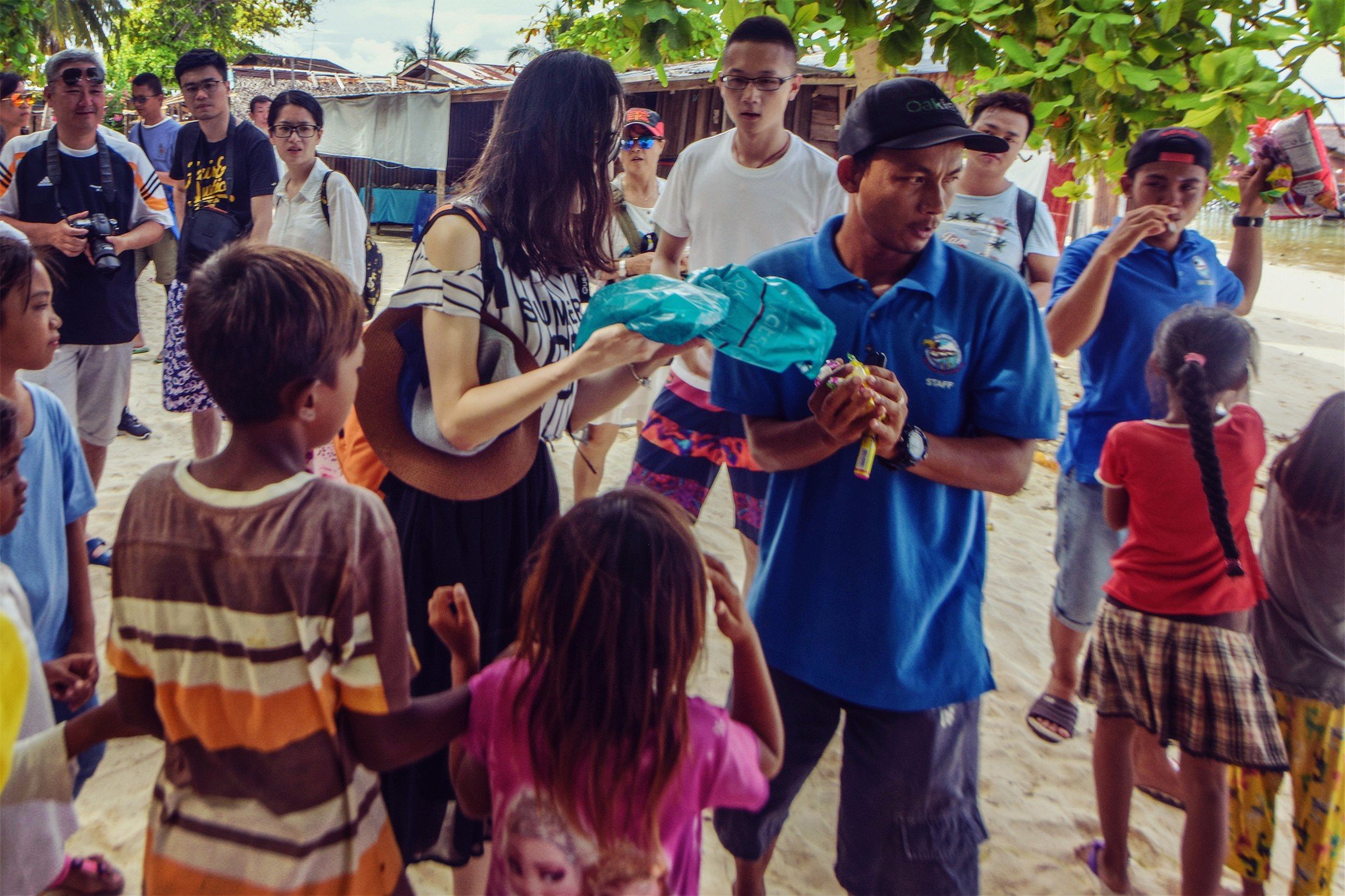 走到栈桥的尽头时,就到达了沙滩,一大堆孩子涌了过来,虽然有四个导游前后左右的压阵,但孩子们夹在人群中,偷偷的看着你,和你伸手。