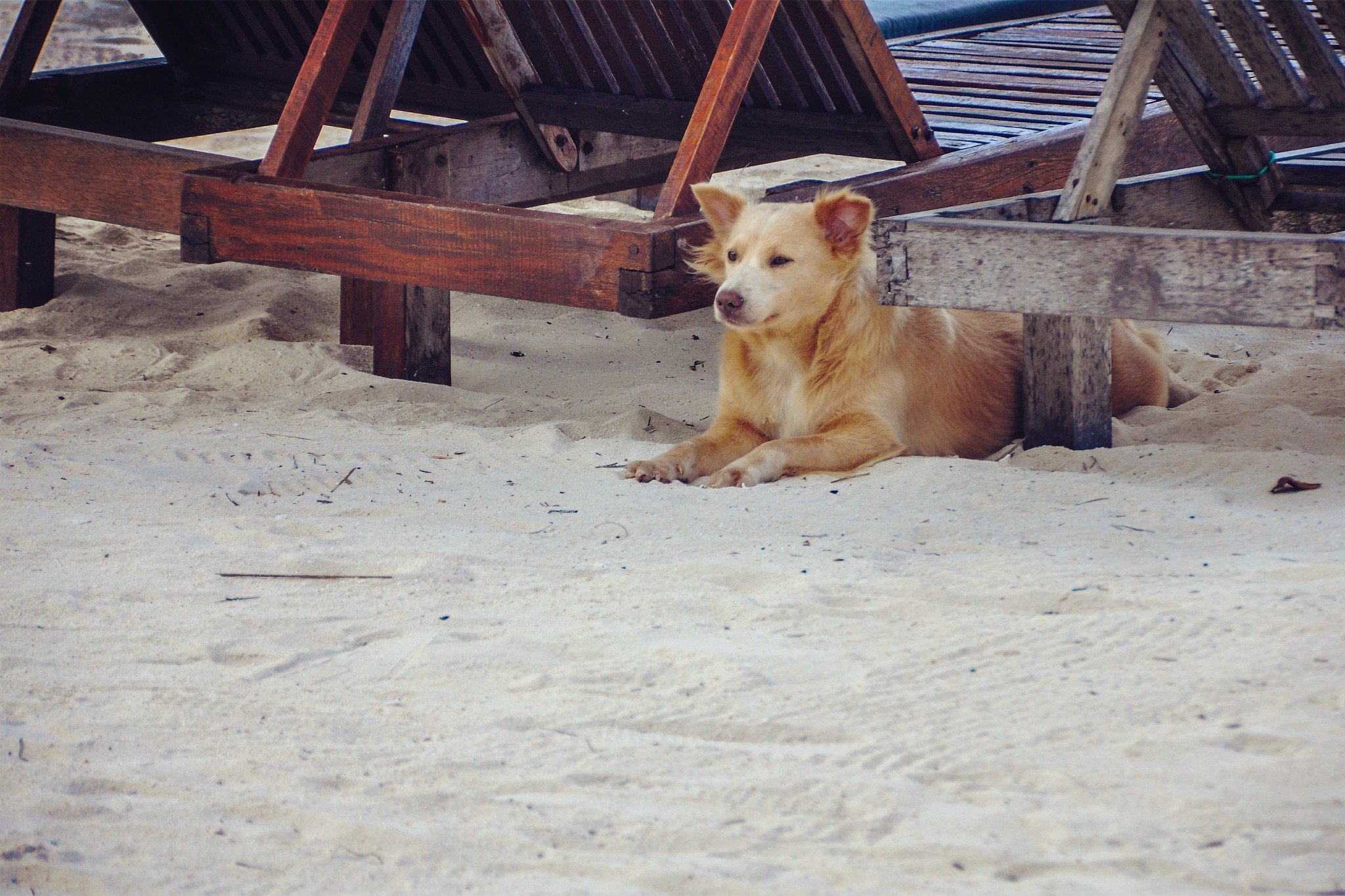穿过村庄,又来到一片酒店园区。沙滩干净了不少,躺椅边还有只干净的小狗。