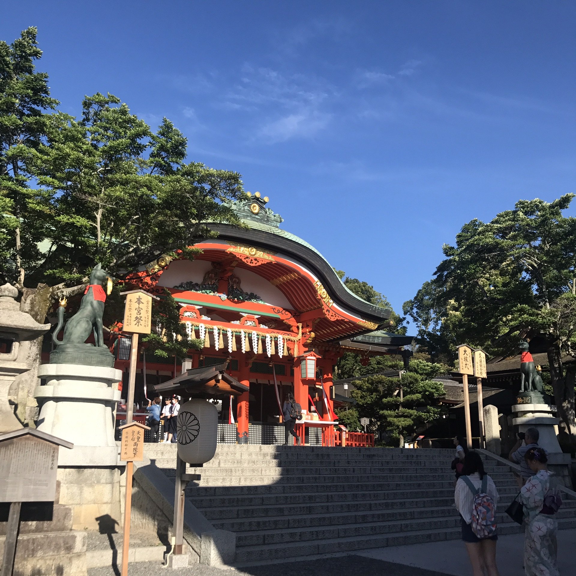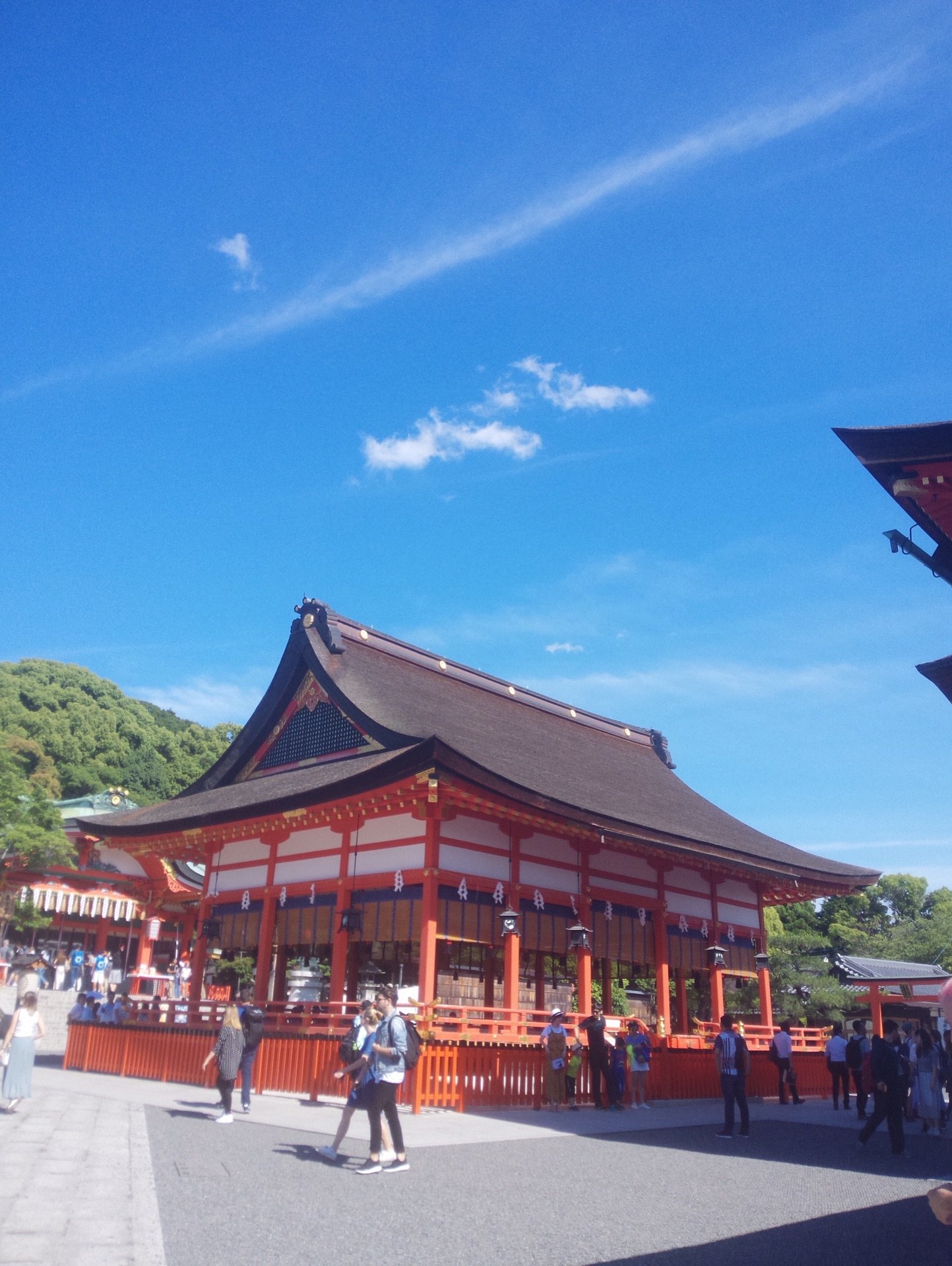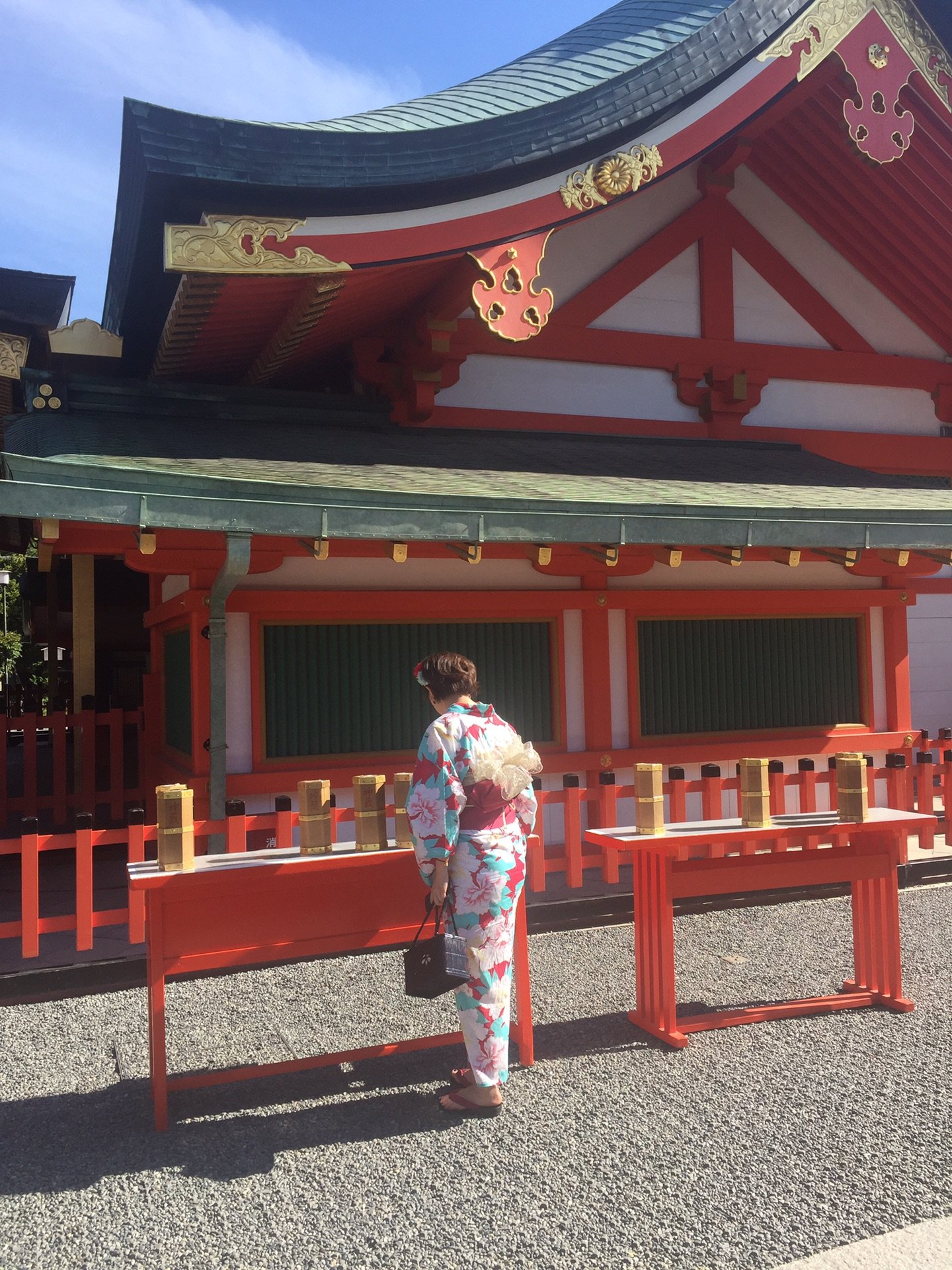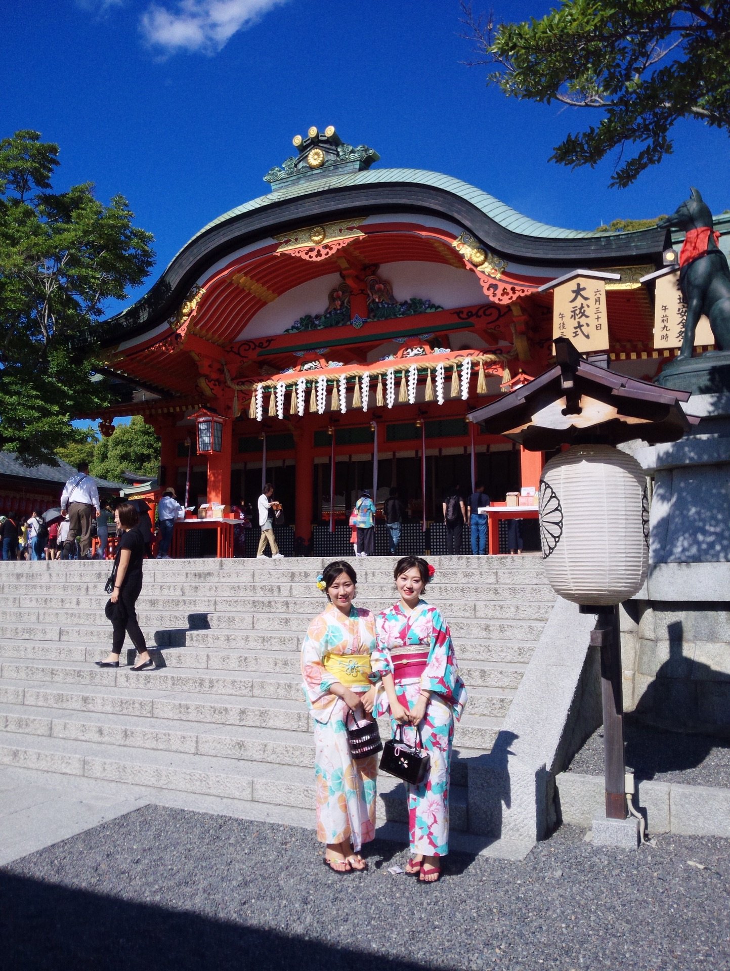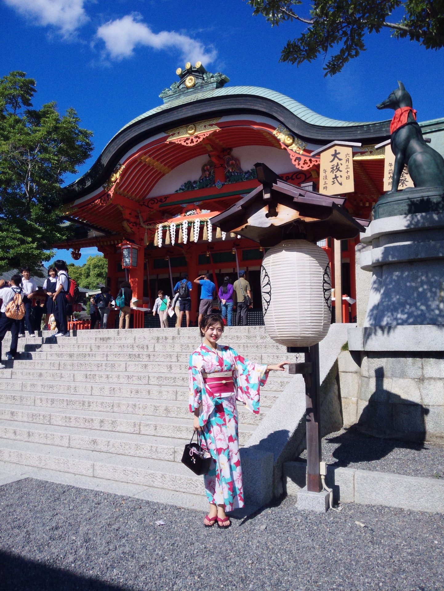 而且我们在神社门口还遇到了妆容精致声音可爱的当地小姐姐主动帮忙拍照,啊,希望下次也能像她一样和男朋友一起穿着和服来逛京都