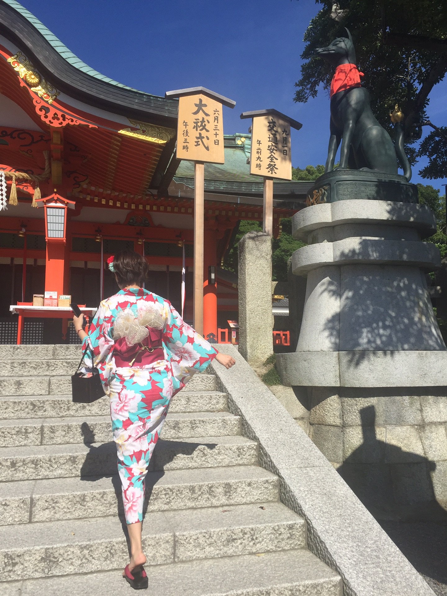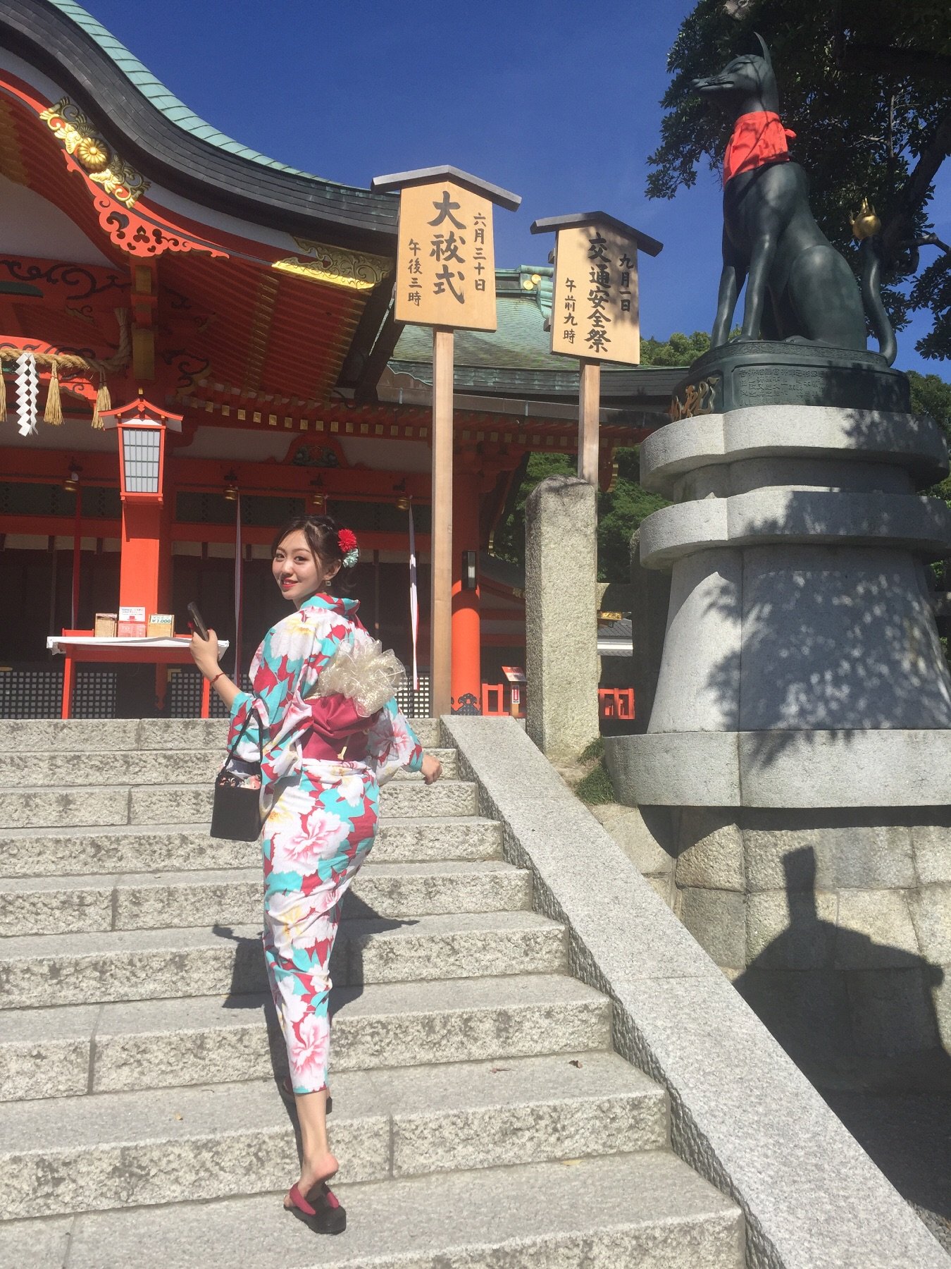 来到伏见稻荷大社的时候其实正好是太阳最毒的下午三点,但是勇敢无畏的浴衣少女们依旧发起了木屐登山挑战!!