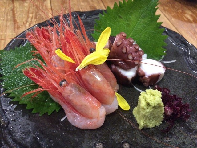 我点了一个牡丹虾+鱿鱼的组合,税前是780日元,有新鲜的山葵,吃起来不过过于刺激,又很新鲜的感觉。鱼肉刺身一份记得是1600日元,税后100人民币吧,很好吃,新鲜味道没,但是几口就没了。所以整个居酒屋吃下来,非常像是会席料理,一道道菜上的感觉。主要以生食为主,唯一一个熟的就是豆腐锅,煮惹了,可以沾特制的甜味酱油,也算是京都料理的特色吧。服务方面,几乎全日本人在吃,没见到外国游客和同胞,菜单也是纯日文的,点菜比较困难。建议有些日语基础或者用翻译app