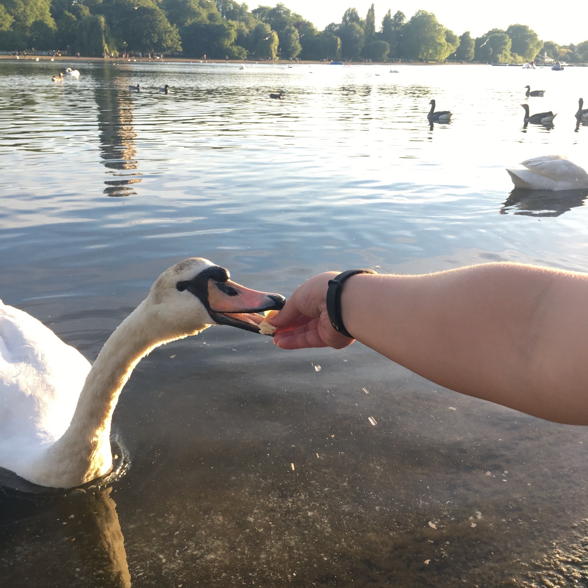 走到海德公园内的小湖边坐下,开始了英国之行第一次的喂食活动。这里的天鹅也真是见惯大场面了,完全不怕人,跟国内没法比。
