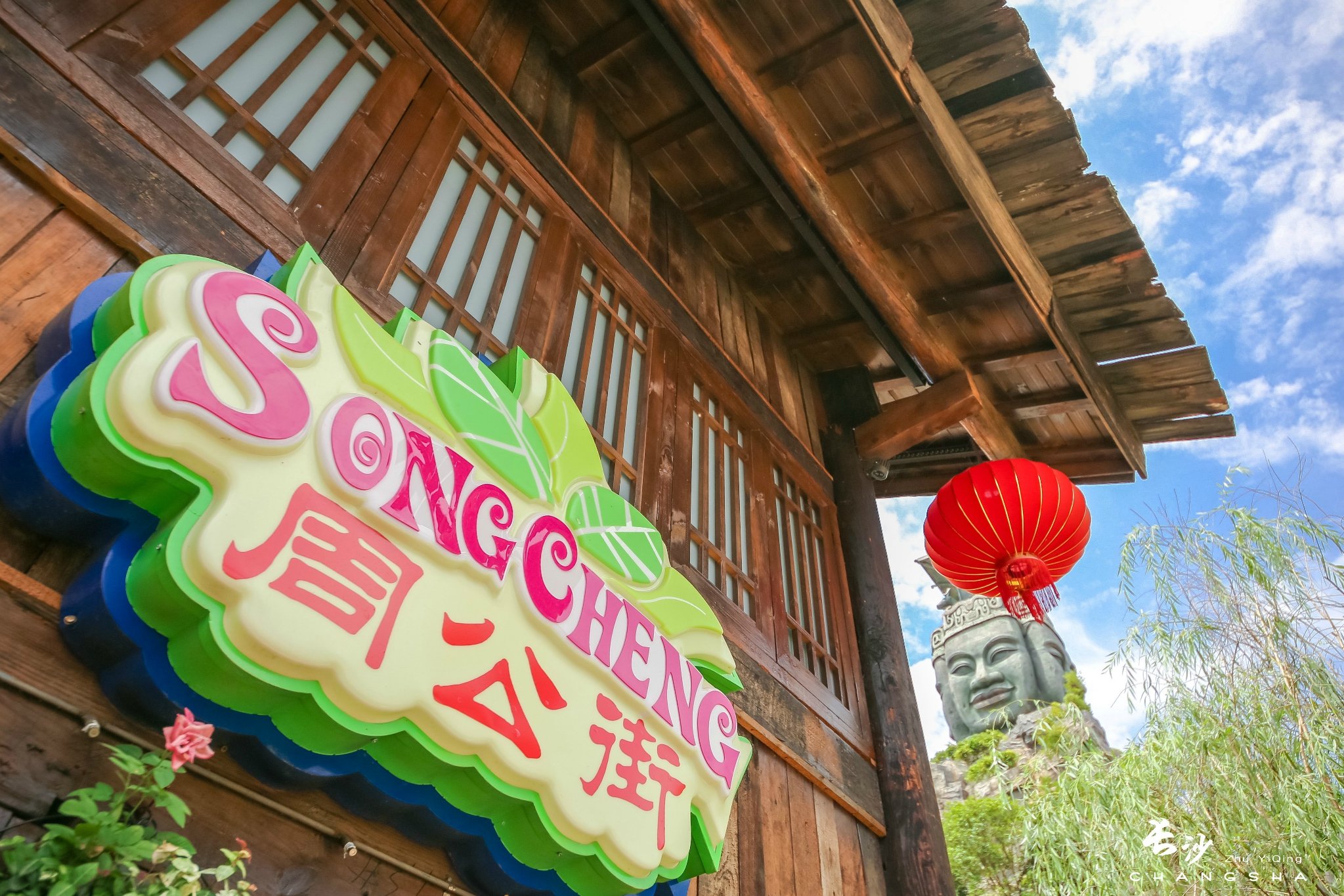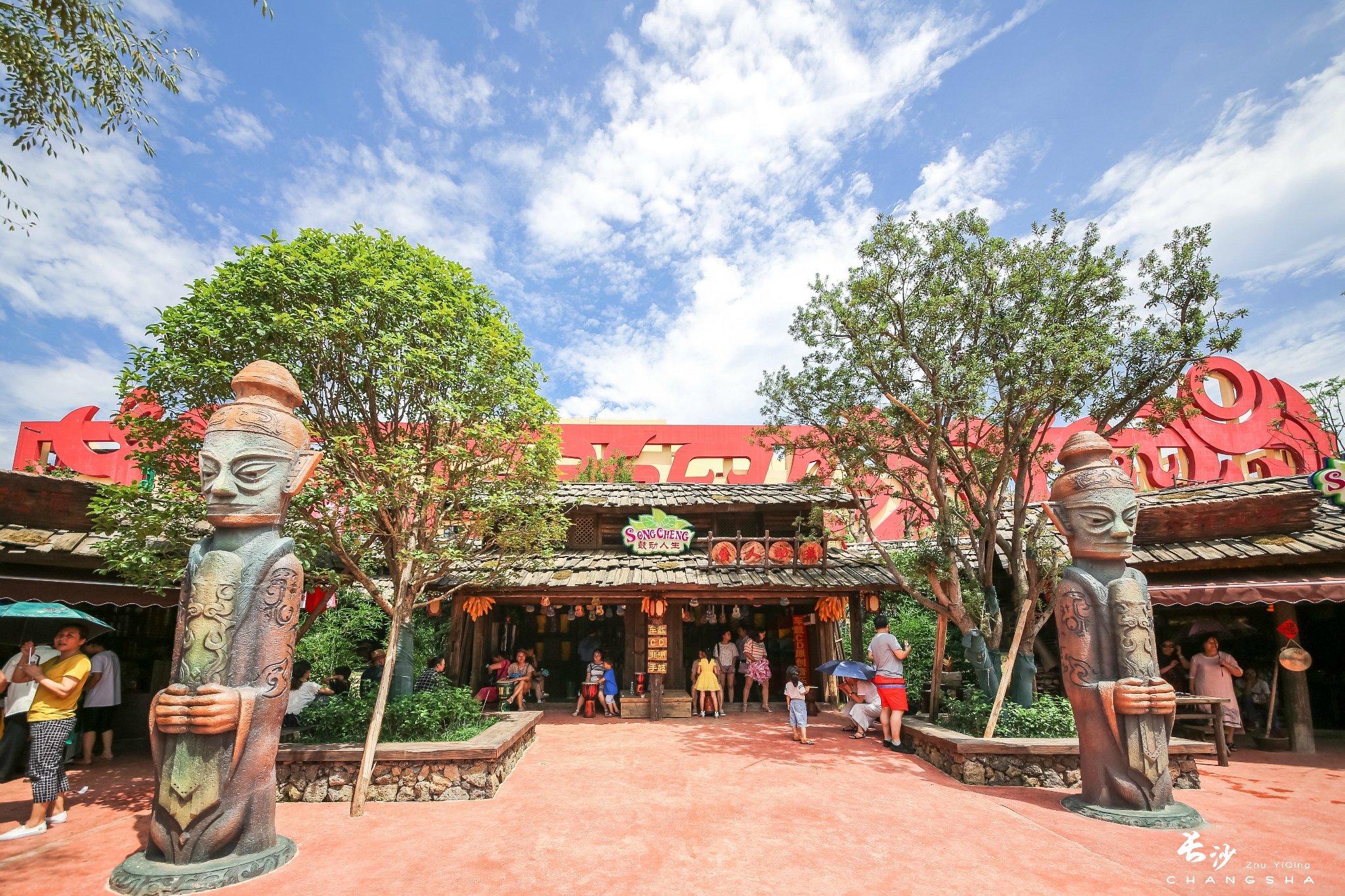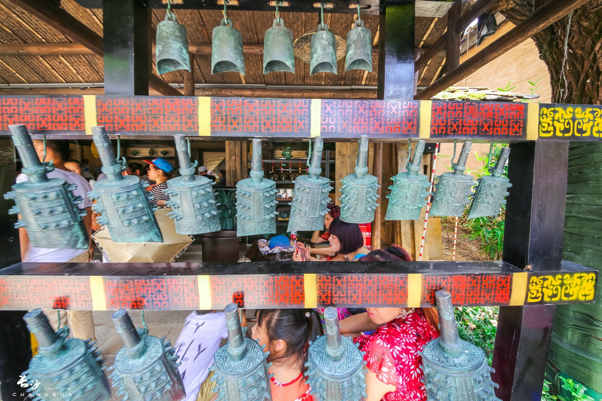 刚到古城大门口,便能看到一个巨大的类似泰国四面佛的青铜四面人像,而帽子则是四羊方尊,下方还有用英语翻译的炭河古城名,真是与国际化接轨呀。周末正逢一个好天气,游人特别多,可见人们到长沙旅游已经不满足长沙市区里的景点,炭河古城这座独具商周文化特色的古城也让人们一睹华夏时期的样貌。