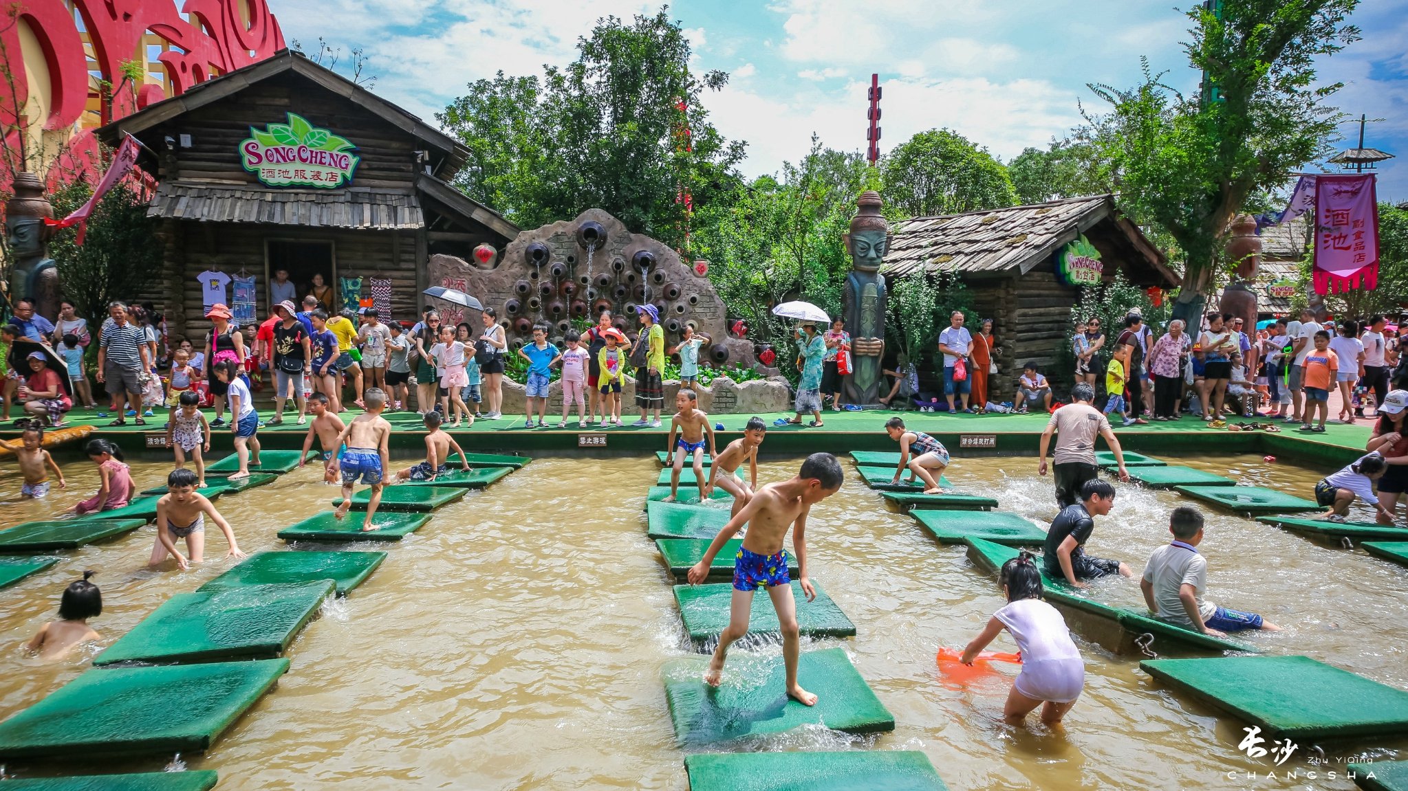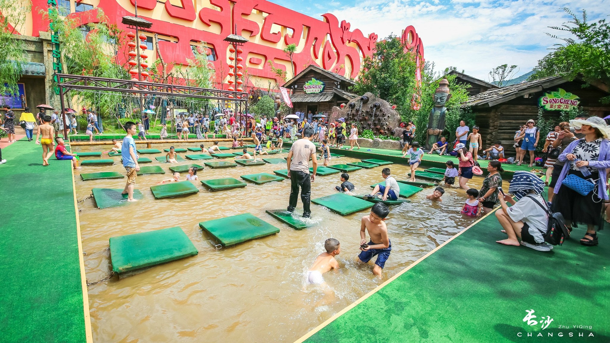 这个酒池戏水游乐区模仿的是昔日纣王为享靡靡之乐倾酒为池,与妲己纵情嬉游其中的“酒池”,现在是一处戏水游乐区,有水上秋千、浮桥、独木桥、吊环桥、绳桥……古代的酒池,现代的玩法。
