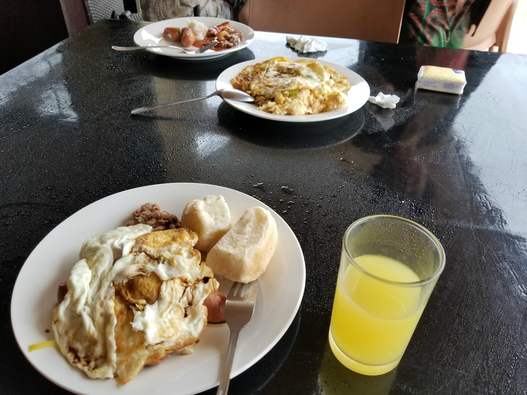 说说早饭,不夸张的说,因为我是汉庭的会员所以住的比较多,这个高大上的阿兰达酒店的自助早餐,比起国内汉庭的早饭还少那么一些。。。每天固定的是煎蛋和炒蛋,炒蛋口感不错,感觉跟港式的有点像,不知道怎么做出来的,煎蛋是双蛋一煎。其他的基本上是海鲜(鱼排或者金枪鱼罐头)蔬菜(炒的蔬菜,据说当地蔬菜比肉贵),香肠,汤或者粥,米饭(菲律宾人早餐吃米饭,估计不会容易饿),面包和牛奶泡麦片,饮料是咖啡和粉冲果汁,没错,就这么多,按照大部分人的说法,这里的早餐也就是管饱。