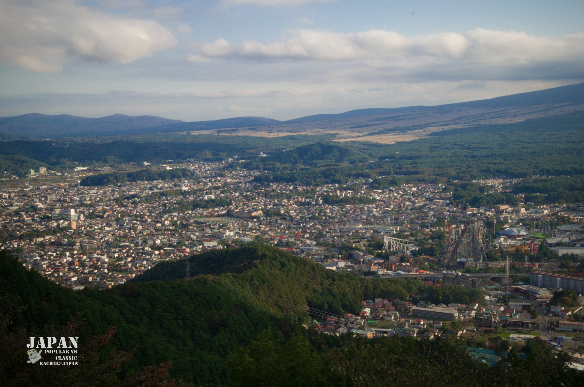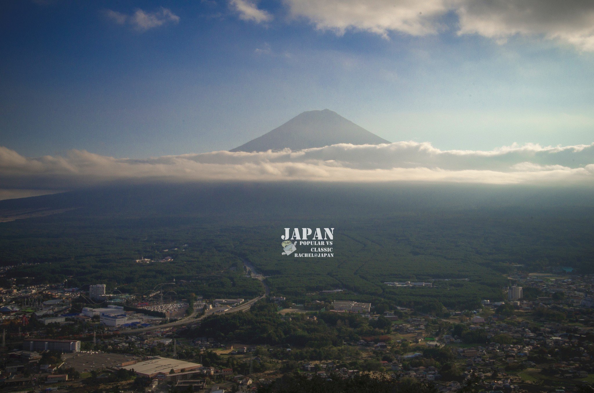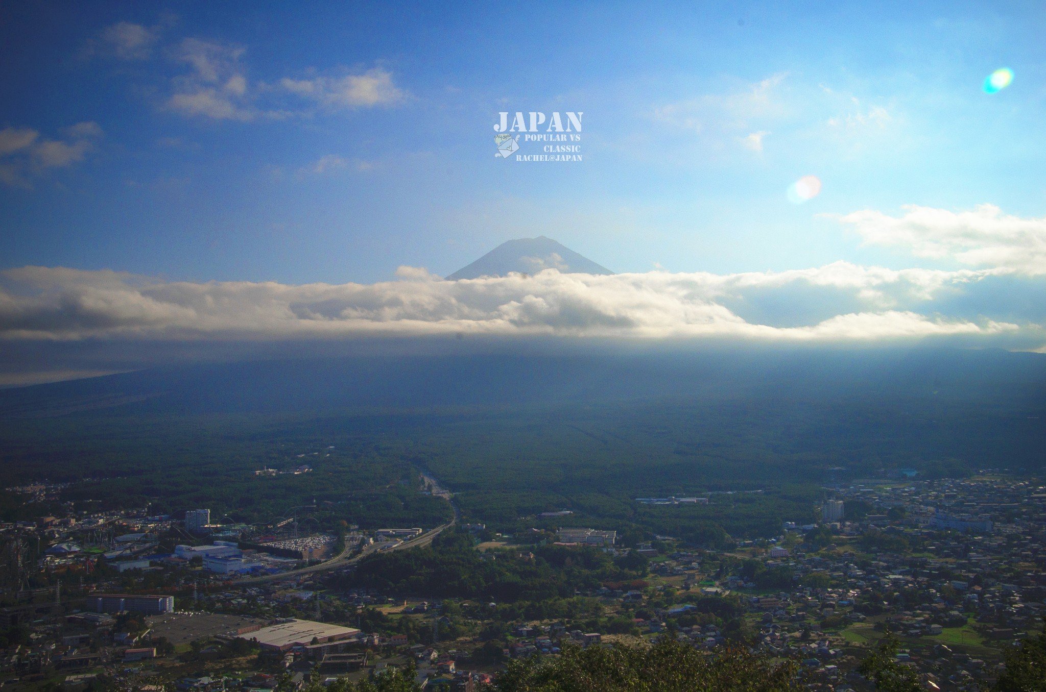 Mt. Fuji终于露头了,这才发现原来刚才因为一直找不到她的原因,用朋友的话说,原来没有积雪的富士山好像一个大煤坡?幸好有白云做缎带,缠在腰间,顿时妩媚不少~