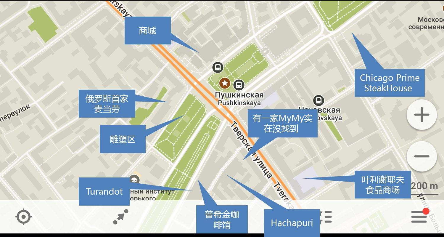 基本摸清情况后,肚子也饿的不行了,从KURSKAYA站坐蓝线3号线转绿线二号线到PUSHKINSKAYA站,哈哈这一站我们几乎每天都去,周围的好吃的很多,我在下图重点标注一下我自己找的。