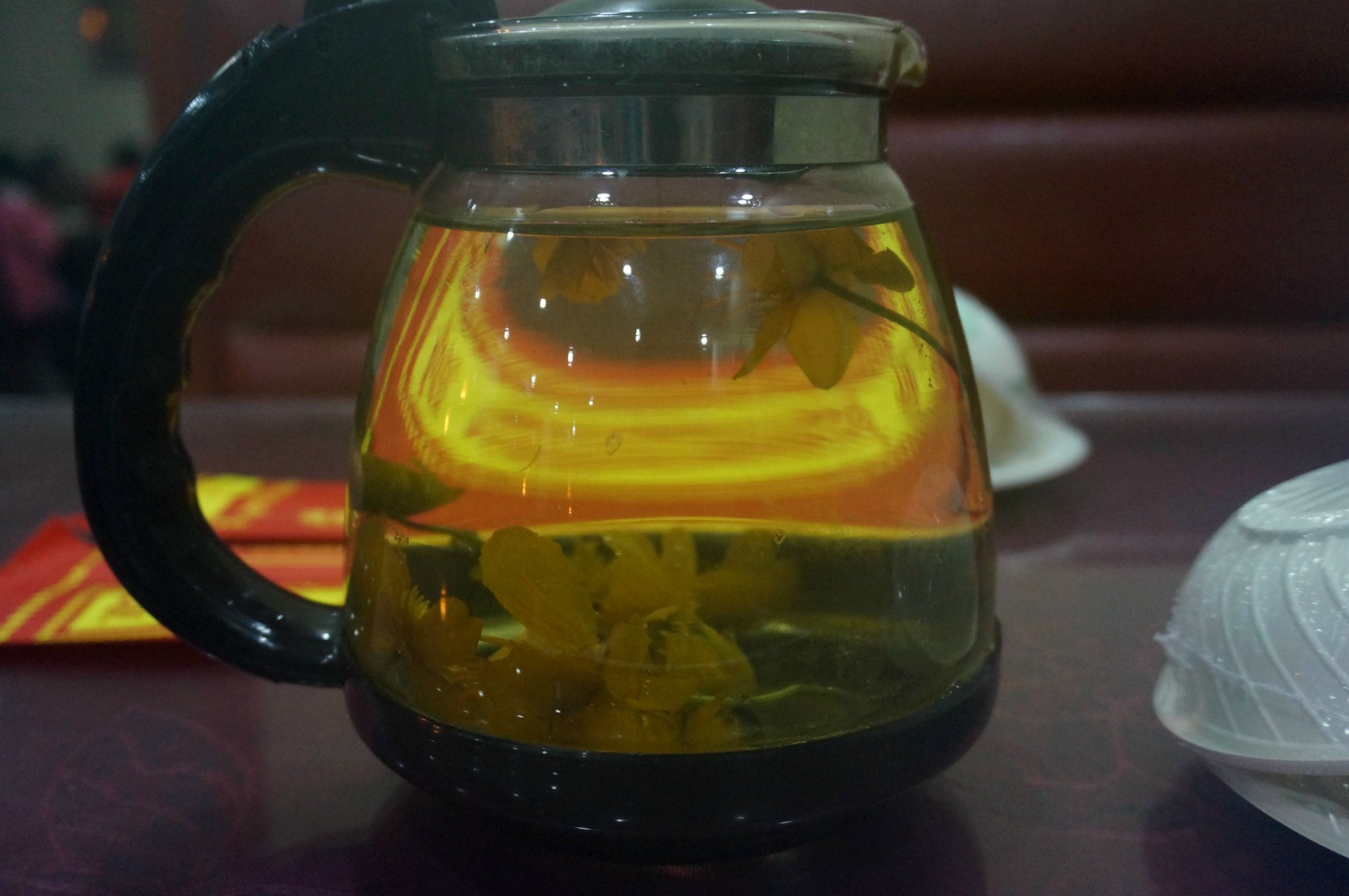 免费的不知道什么茶,当时天气冷,一进门镜头上都是哈气,拍出的照片模模糊糊的,实物超漂亮,里面的应该是金银花吧,在水里飘荡。