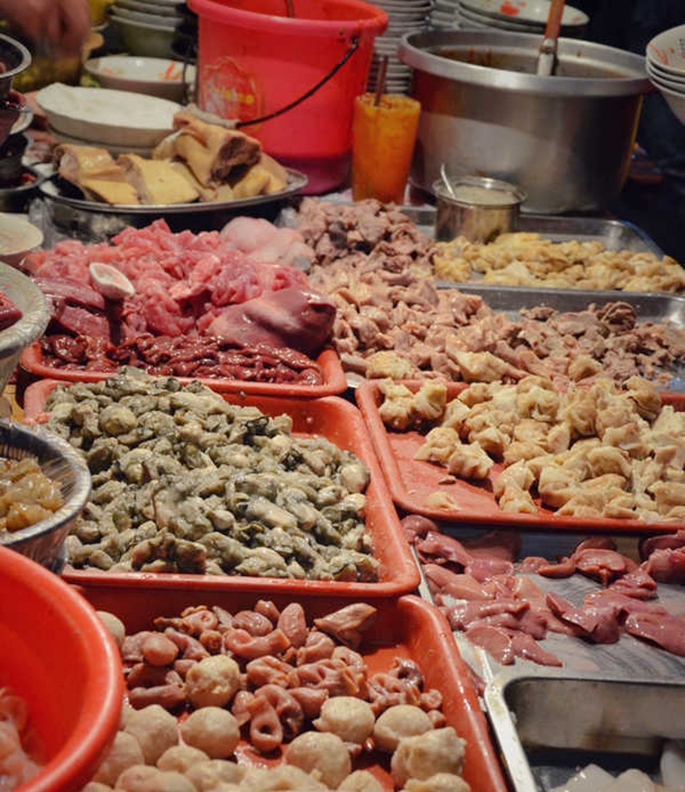 除了最有名的拌面,店里还卖生烫和拌鸭肠。简易的木板上摆满新鲜的食材,锅里煮着清甜爽口的汤底,氤氲出热腾腾的白烟,一面一汤,就构成了中山路最有名的深夜食堂。