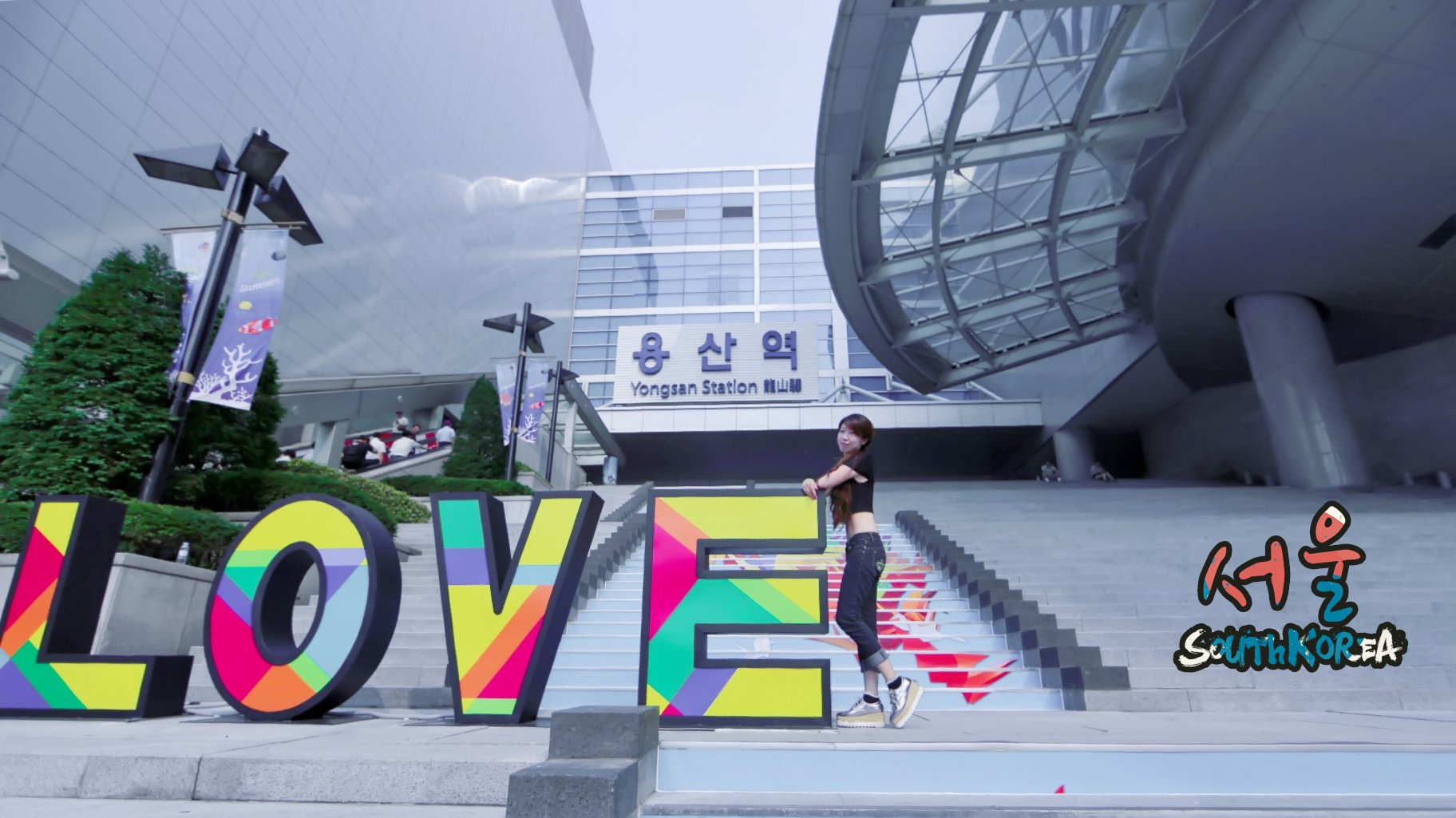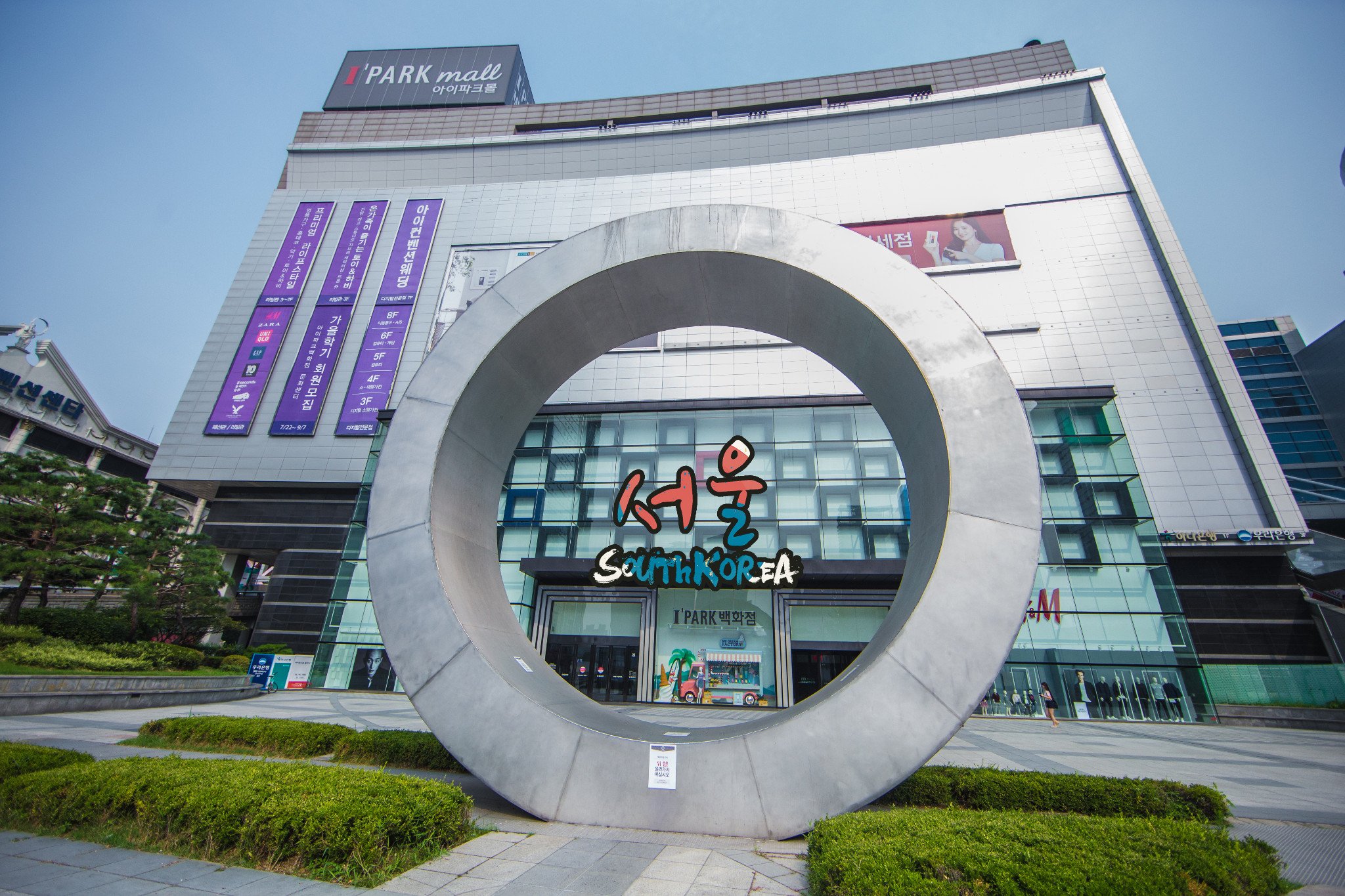 面对大圆环标志的右手边有一个长长的电梯,上去就是地铁出入口,直走到头就是爱宝客免税店。龙山汗蒸幕在圆环标志的左手边。