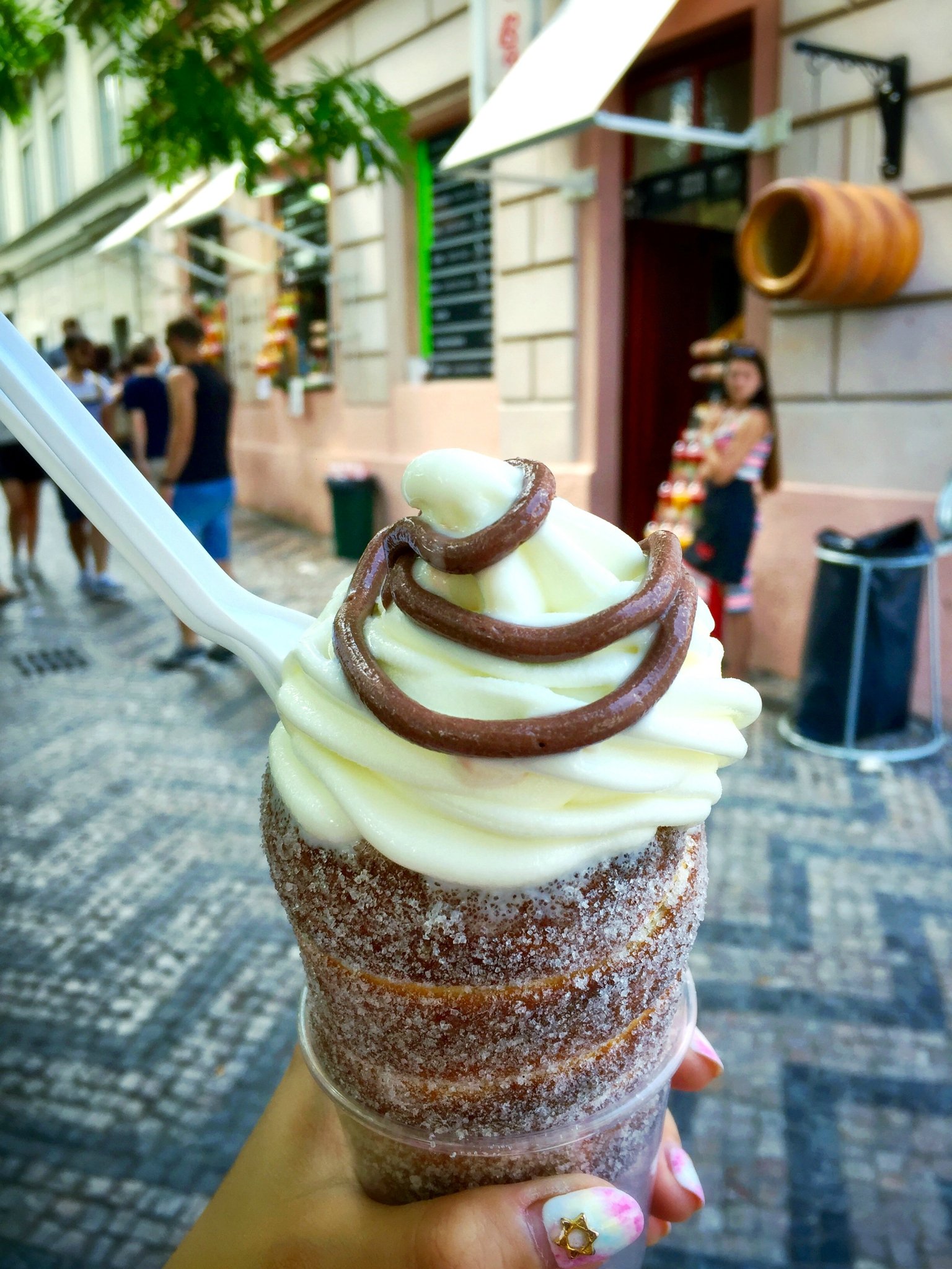 继续向下走,有一排售卖食品的小窗口,就在那里第一次吃到了在布拉格最爱最爱的甜品。后来才知道,这种“面包卷冰淇淋”叫“塔塔蜜”,是捷克的一种传统美食,是用特制的面粉发酵后的长条型面团一圈圈地卷在长棍上烤制而成,中间空心,呈筒状,内壁加上巧克力酱,外圈则用肉桂粉、杏仁粉、核桃粉、椰子粉、坚果等多种香甜辅料包裹。在布拉格的这几天,走过的每一条大街小巷,都能看到塔塔蜜在售卖。不同店家的面包口味、冰淇淋口味、配料口味略有不同,五花八门。酷爱小甜点且偏爱肉桂口味的我,简直对这种甜品毫无招架之力!