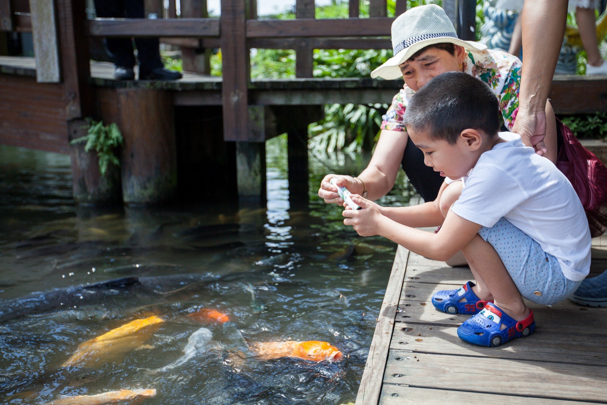 候师傅带着BBG在鱼塘边蹲下 展示他独特的喂鱼方式