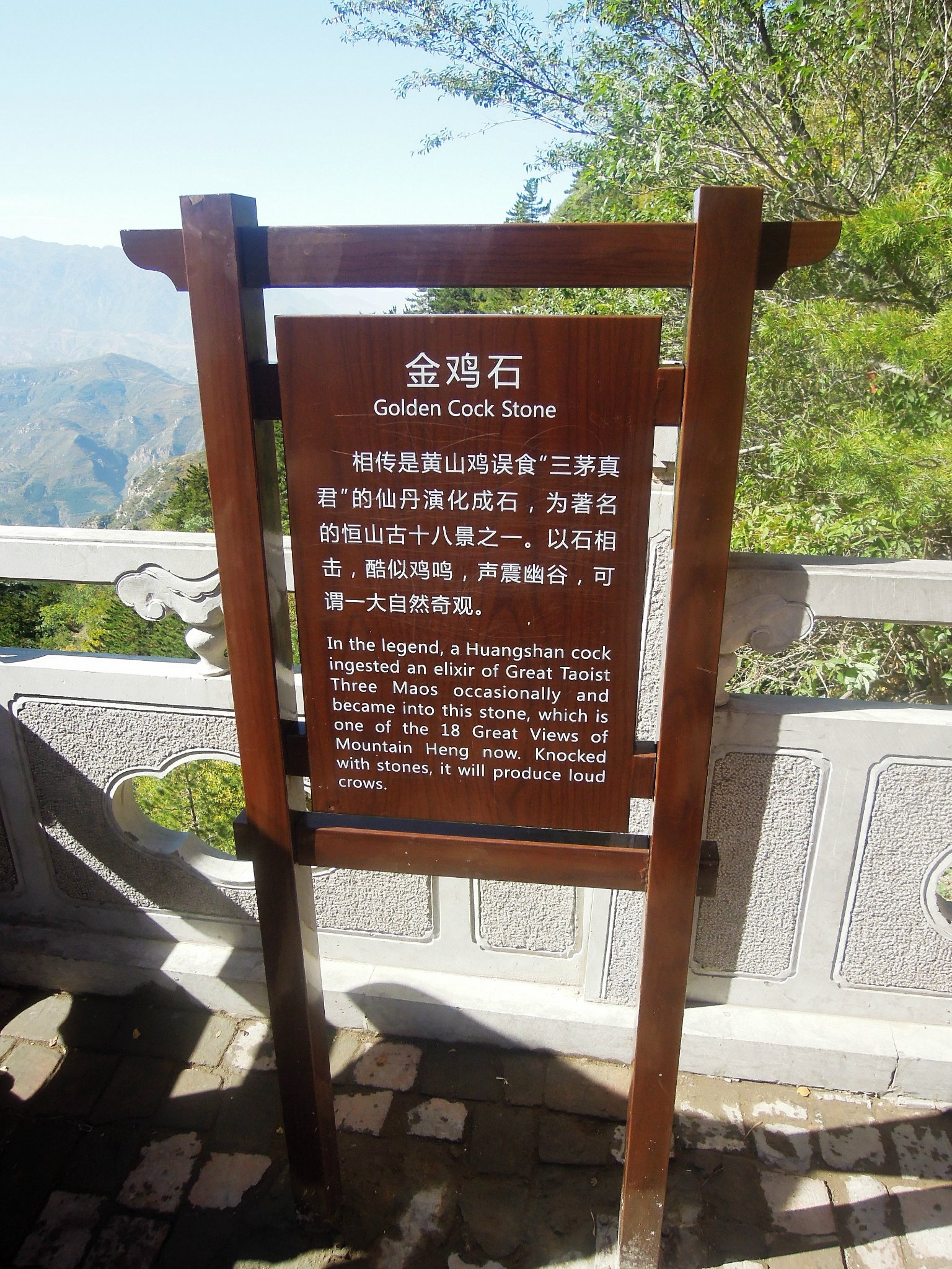 宝鸡石,相传是黄山鸡误食“三茅真君”的仙丹演化成石,为著名的恒山古十八景之一。以石相击,酷似鸡鸣,声震幽谷,可谓大自然奇观。