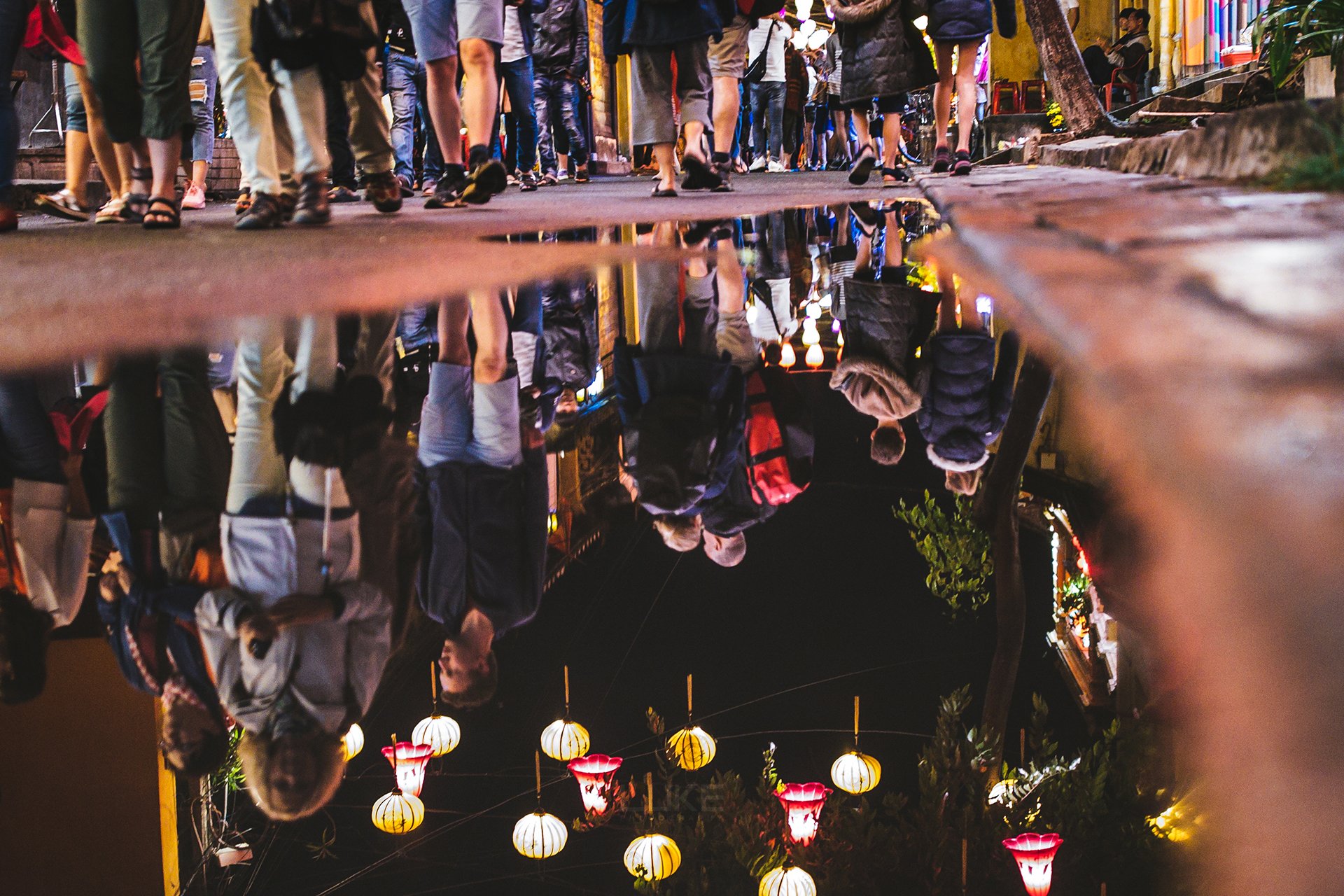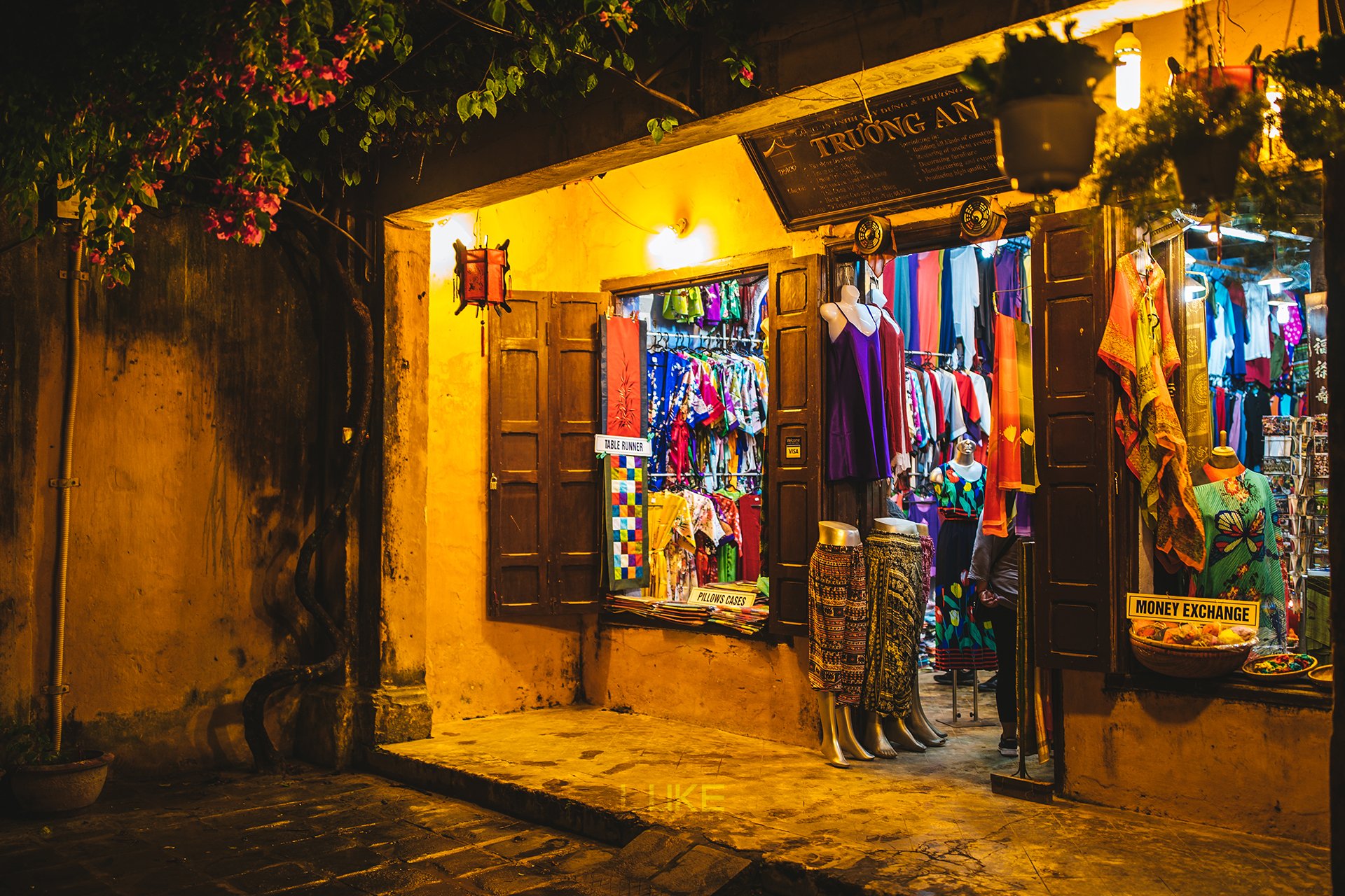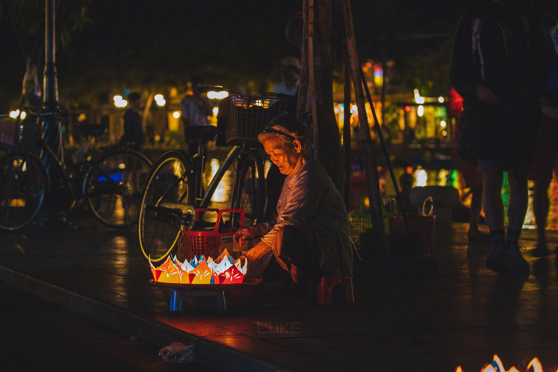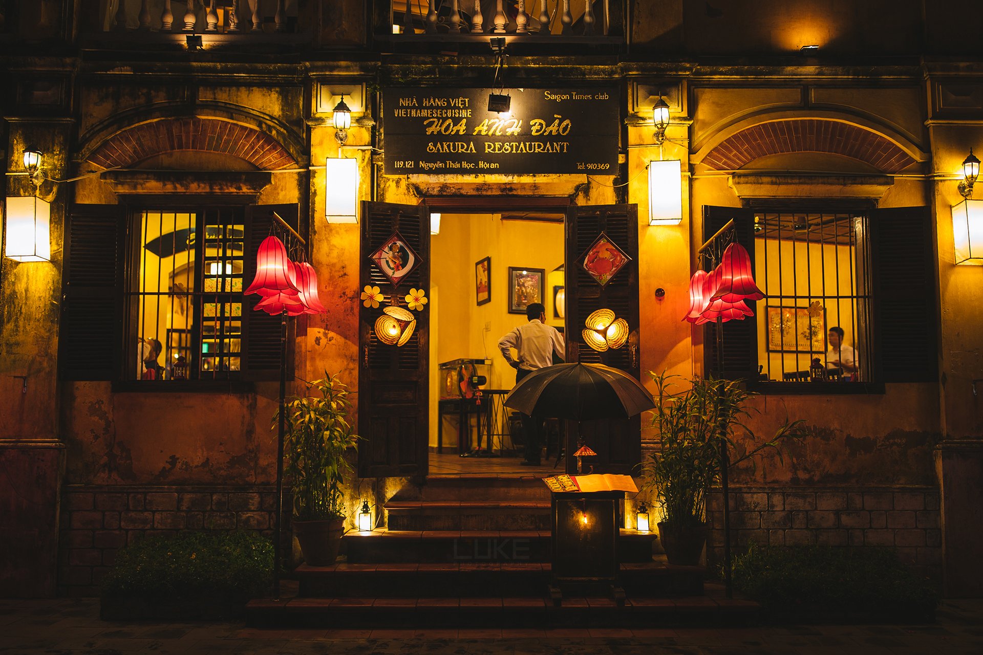 会安古城的灯笼街基本被拍摄婚纱照的新人们承包了,有灯笼的地方就能见到闪光灯的频闪。先到MIX Restaurant用一顿正宗的希腊羊脂奶酪安抚了饥肠辘辘的肚子,还幸运的结识了一群来自上海的妹子。餐后那道吃起来腻到说不出话来的巧克力甜品是MIX老板的得意之作,我俩坐在门口的小沙发上聊起了天,一个虎背熊腰的欧洲人和一个有些发福的亚洲人坐在越南建筑窄小的门口,我们简直成为了一场喜剧的布景。