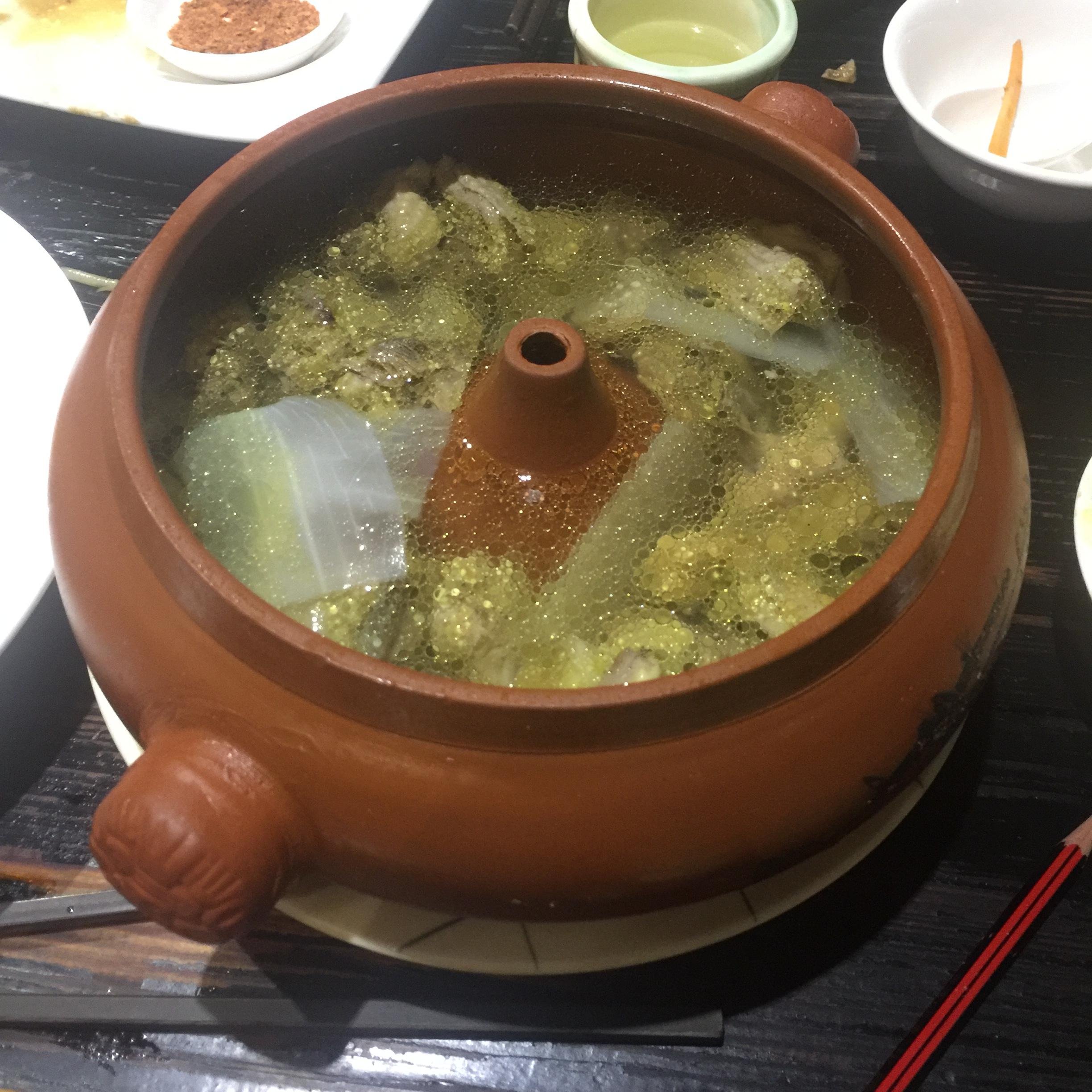 终于吃到汽锅鸡啦,鸡肉特别嫩,里面还有萝卜,虽然汤看起来浮着一层油,但是喝起来一点都不油腻很好喝哒