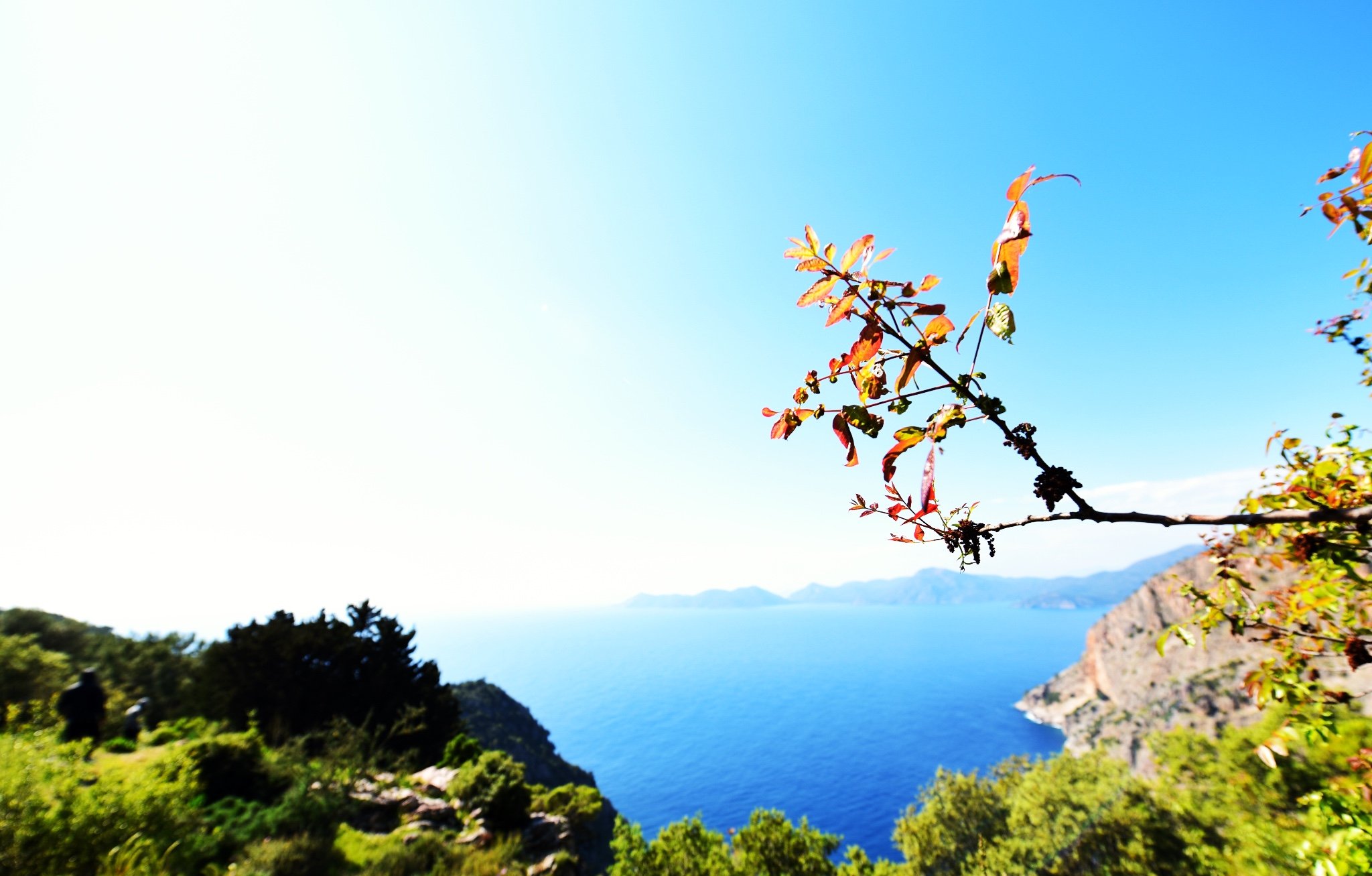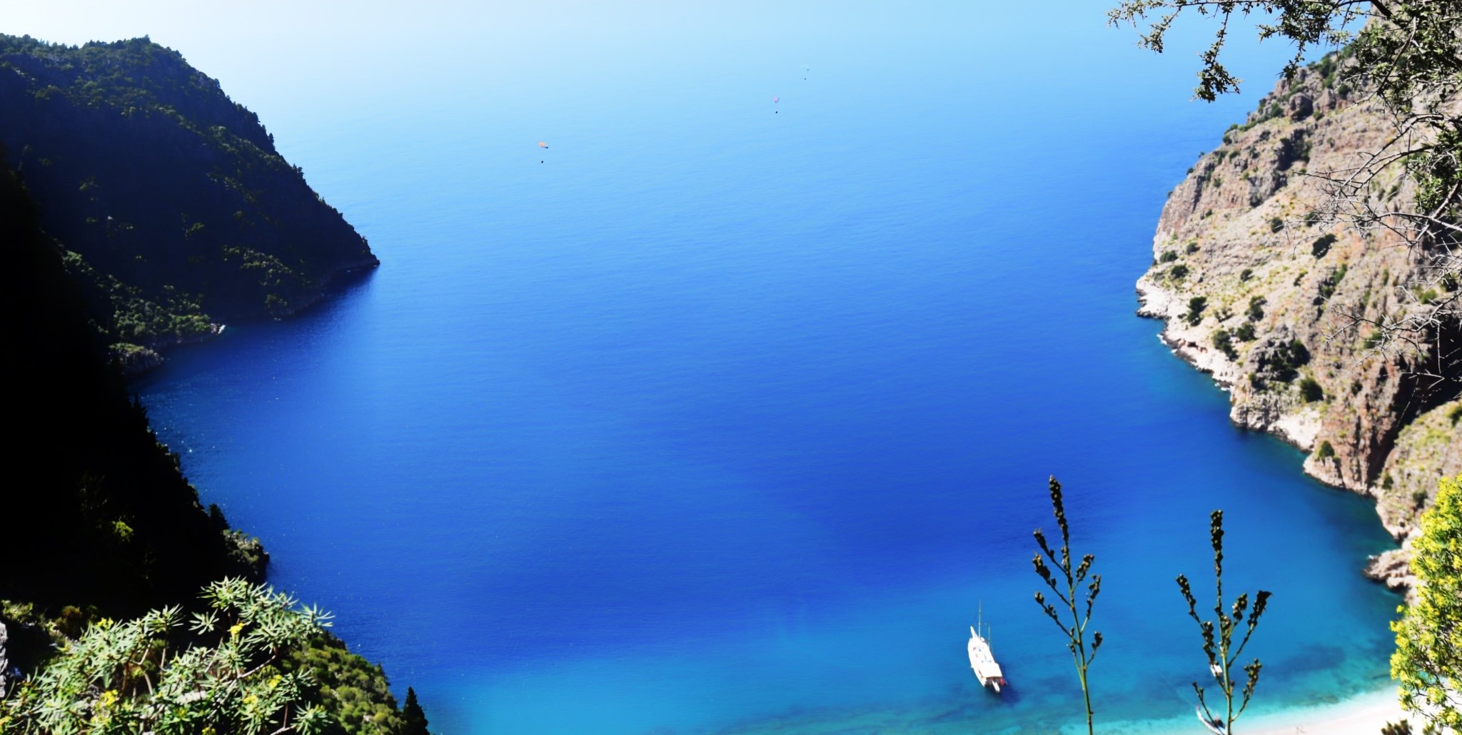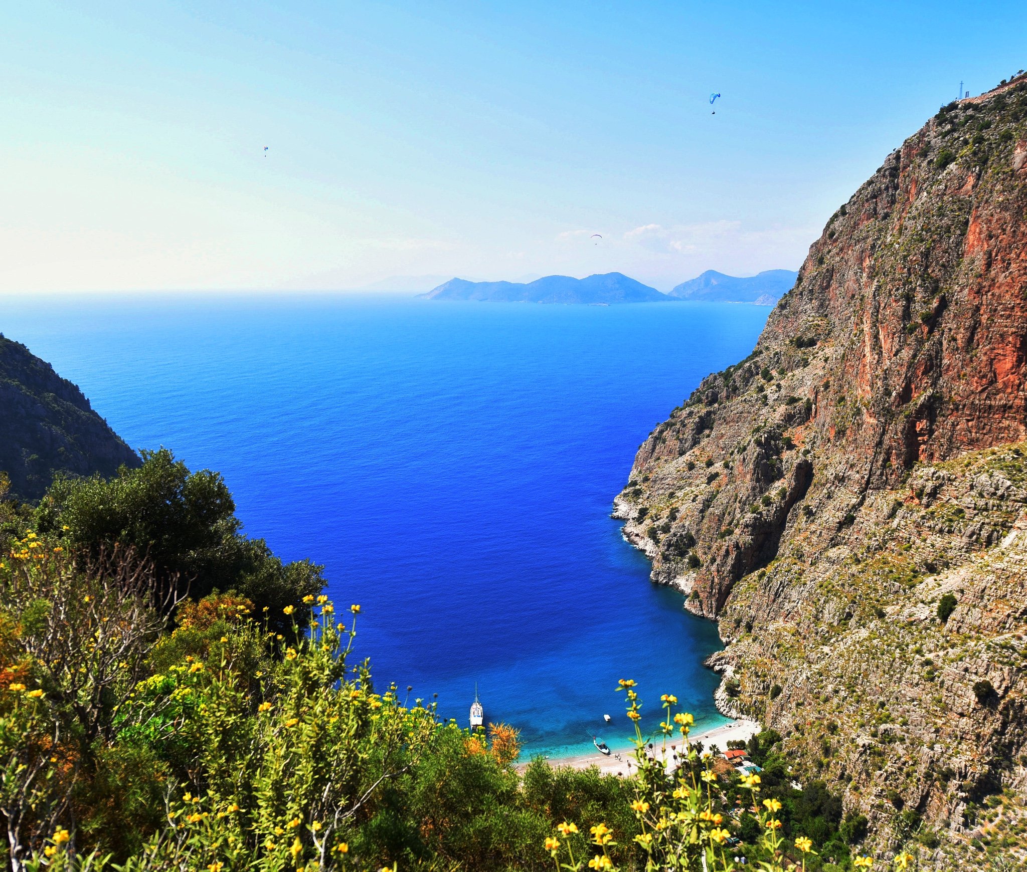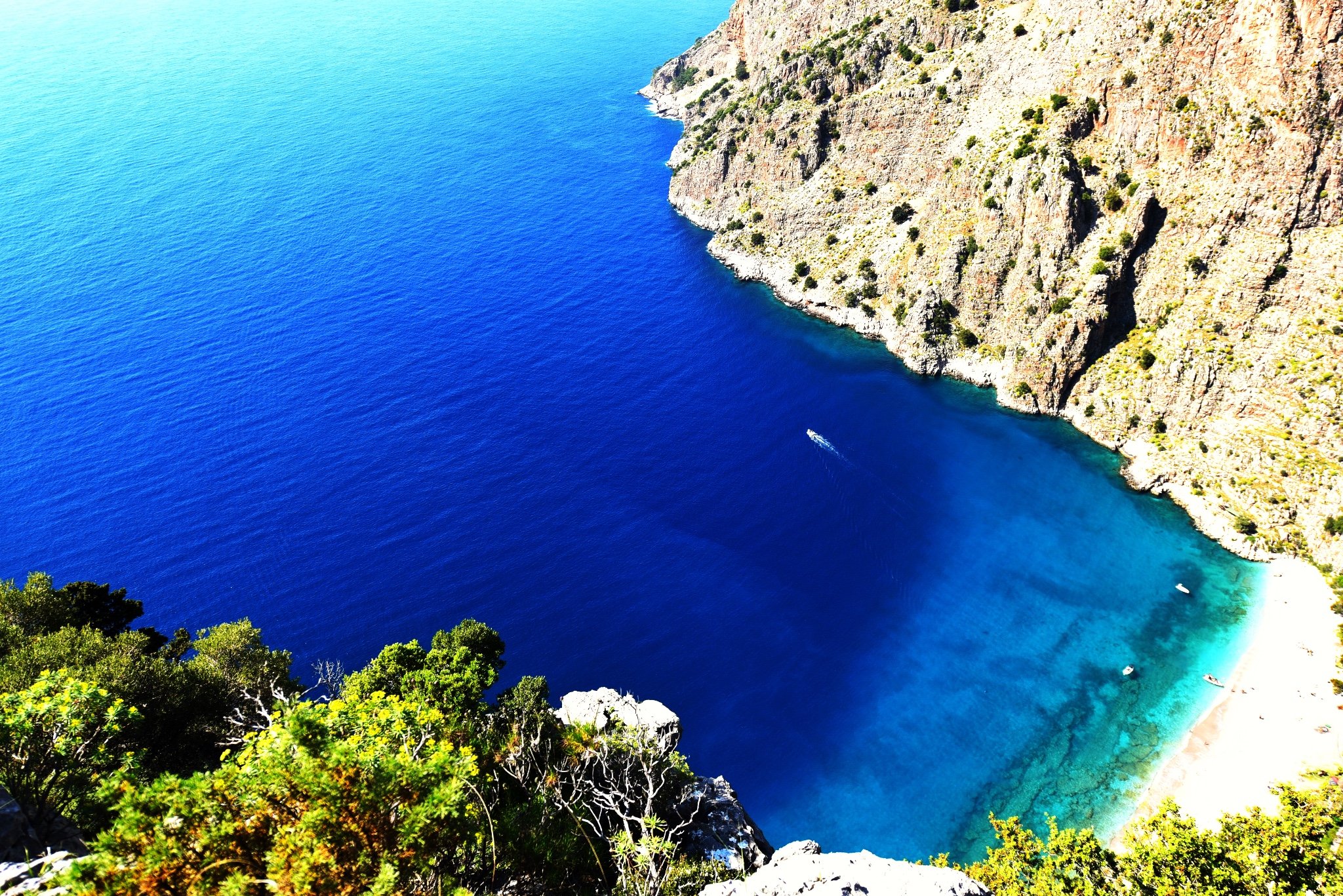 顺着方向往前走,在前路标记消失的时候我们到达了一个平台。从这里可以俯瞰下方的蓝色大海和沙滩,海面上不时有有游艇驶过。在旺季的时候,作为跳岛游的其中一站,可以乘坐游船到达蝴蝶谷下方的沙滩,也可以选择乘坐快艇前来。