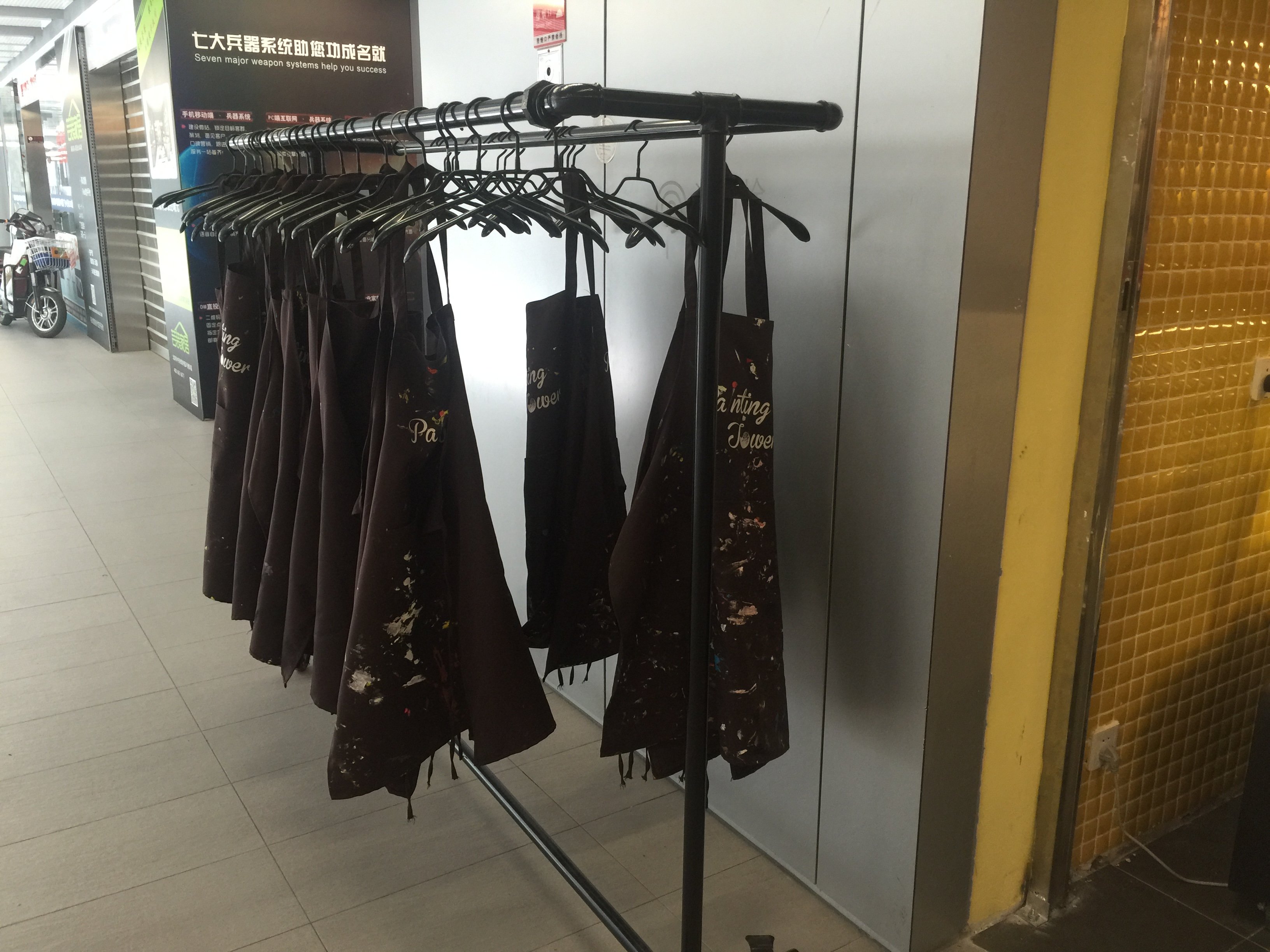 选好画后,在店外的架子上,整齐的挂着深棕色的围裙