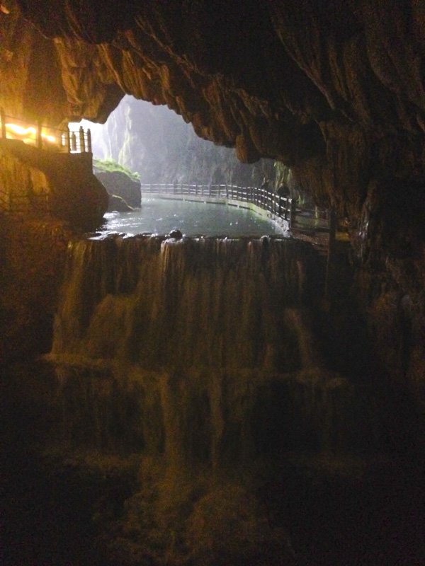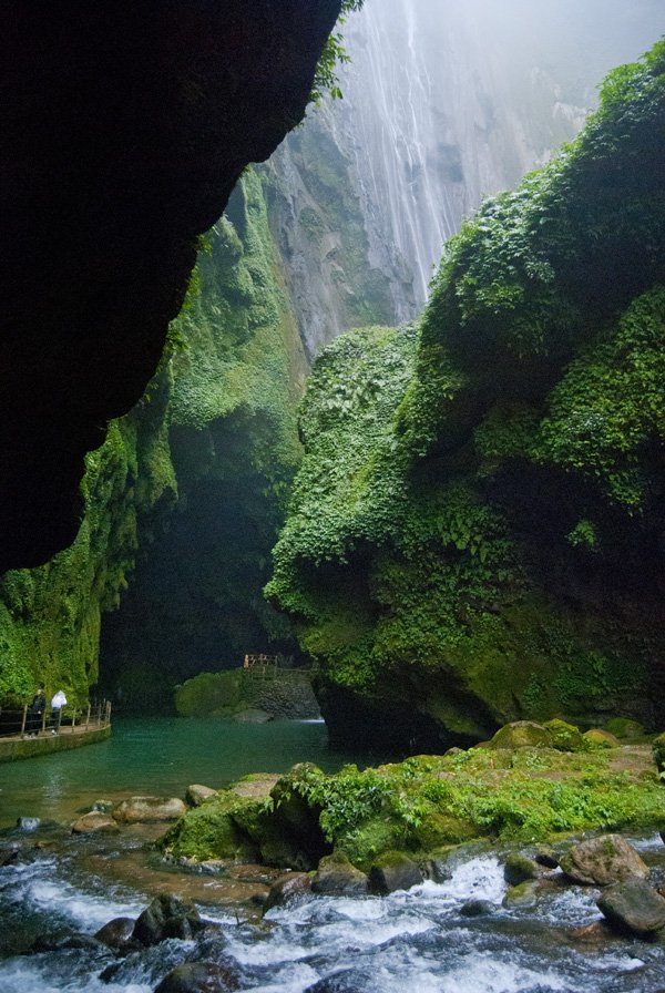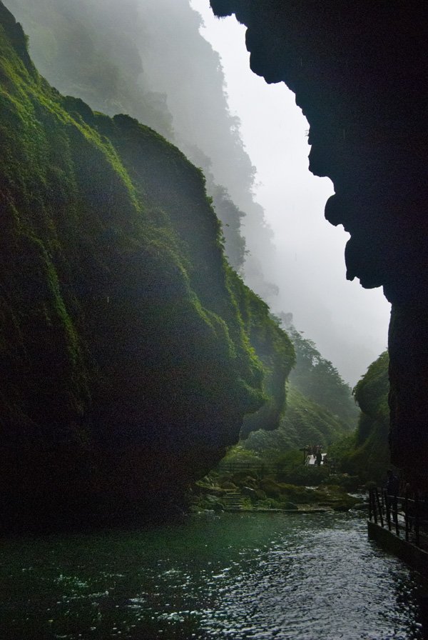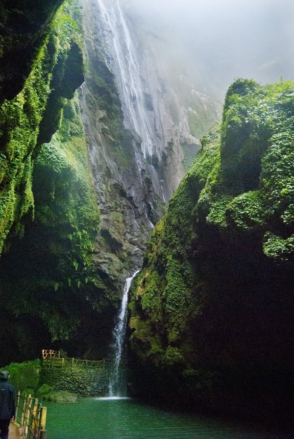 最里面是通灵瀑布,当时雾气很重,看不清瀑布的整个形态。这时游览的重点不仅仅是看一下这个落差188多米的瀑布,而是进到绝壁千仞,幽幽深邃的洞内,围着瀑布修了一条栈道。深潭星罗棋布,水帘洞、地下河及气象万千的瀑布,河涧曲回,流水潺潺,青翠欲滴,不断地有水滴从高崖倒悬钟乳石上滴下来,