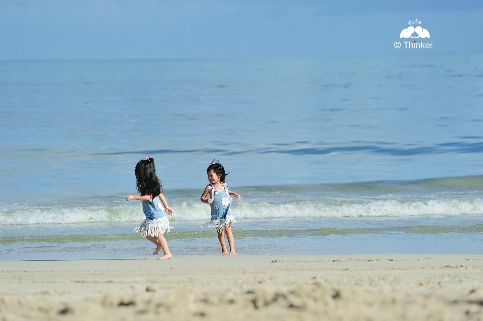 我和我同学在海边玩的可开心了,追着转圈,都是我们学校里常常玩的游戏。