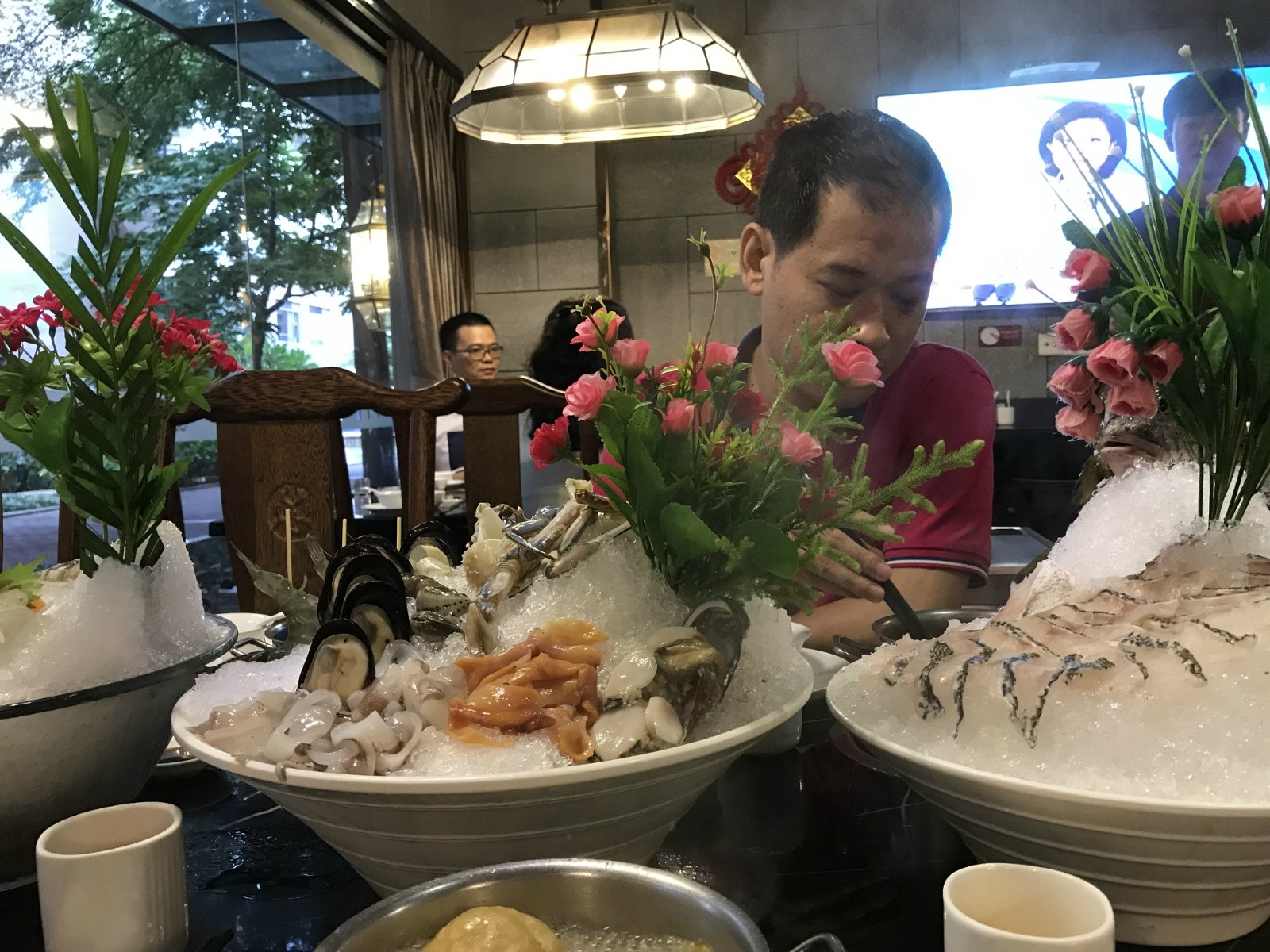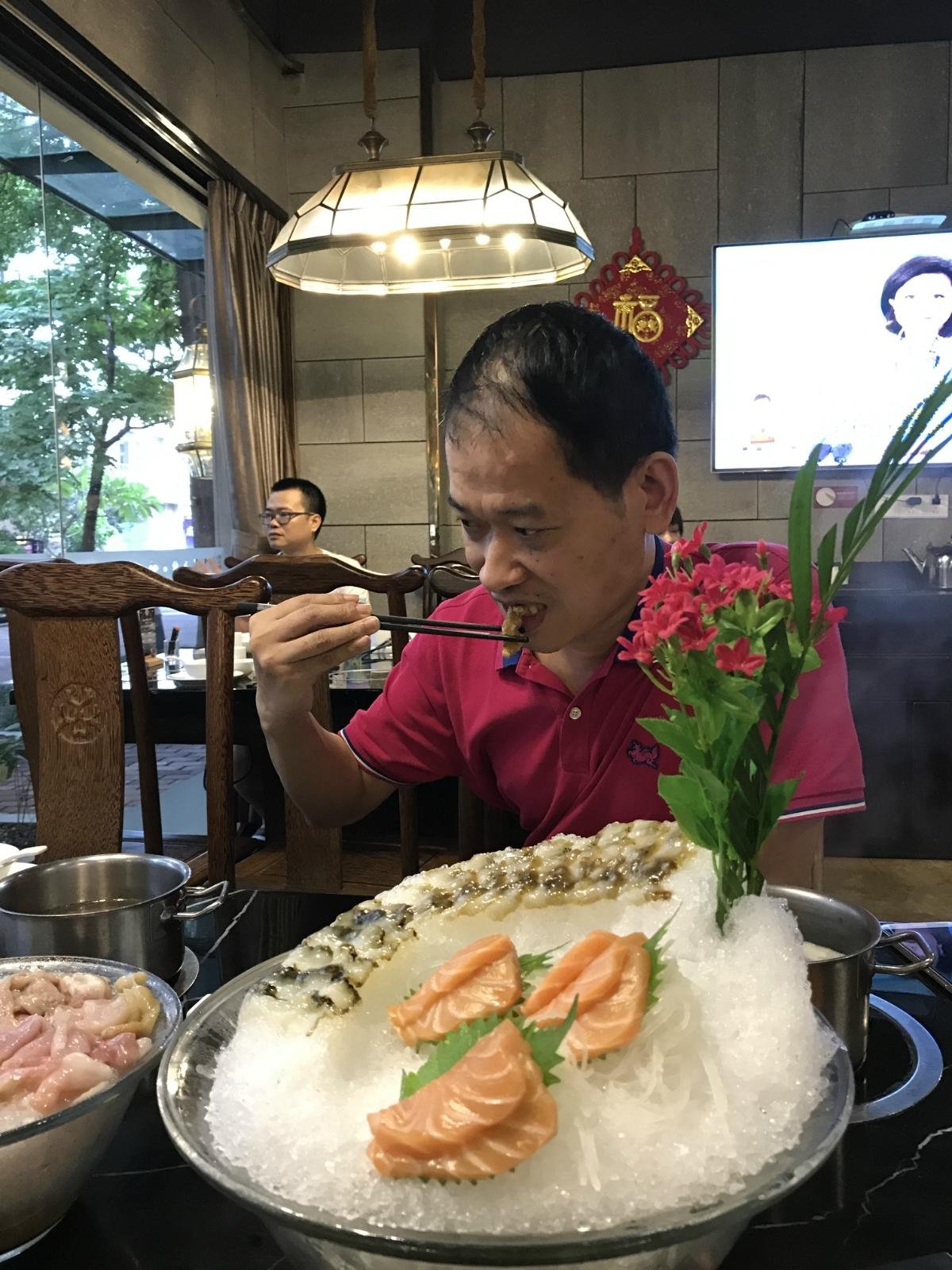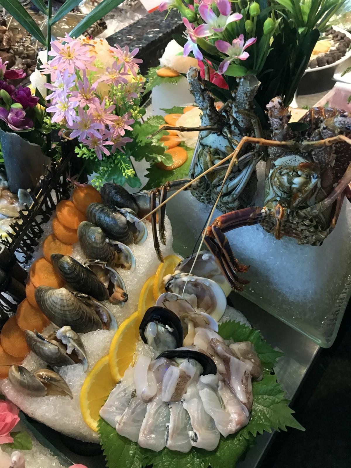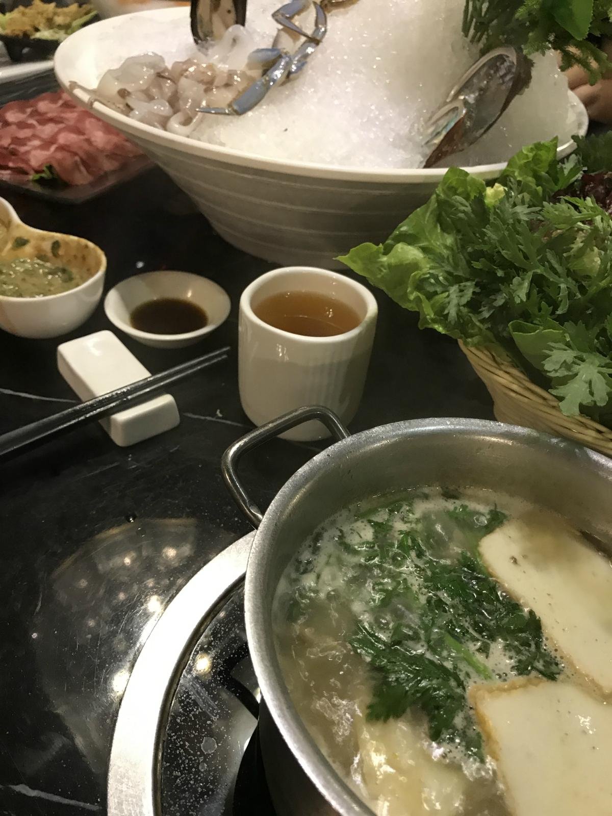 河虾好似孔雀开屏和兰花蚌拼凑在一起,个头巨大的河虾用竹签插着,再也不要担心它放入沸腾的火锅中活蹦乱跳,鲜切的兰花蚌鲜活度更不用说了。