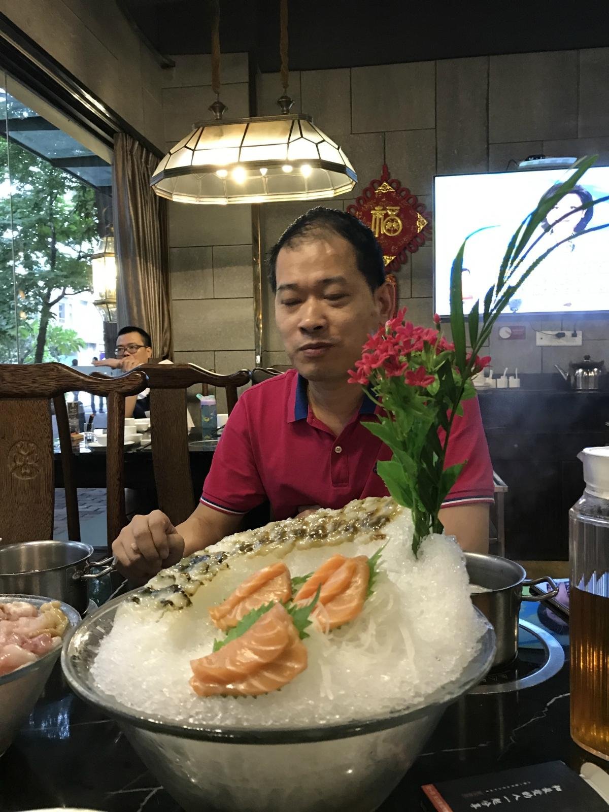 气势恢宏的摆盘,薄如蝉翼的刀功,为我们呈现一座铺满斑鱼片的冰山,视觉上就已经超大满足,稍微涮烫后的斑鱼,无肉无刺鲜嫩,鱼皮q弹,鱼骨架和鱼头回收还可以做椒盐,一鱼两吃。椒盐的做法使鱼头和鱼架酥脆可口,喷香扑鼻。